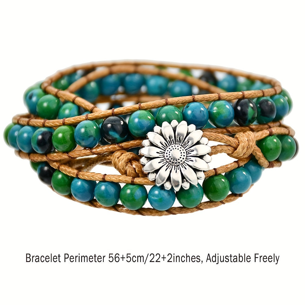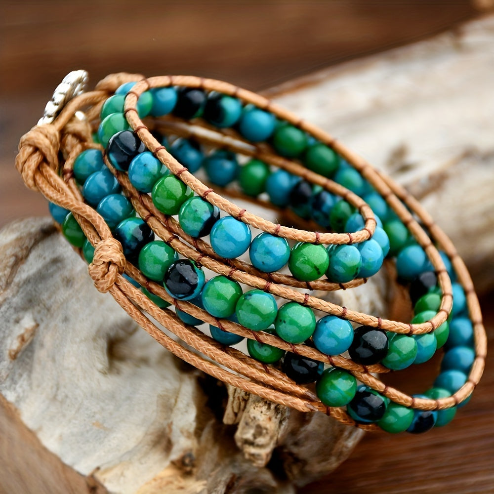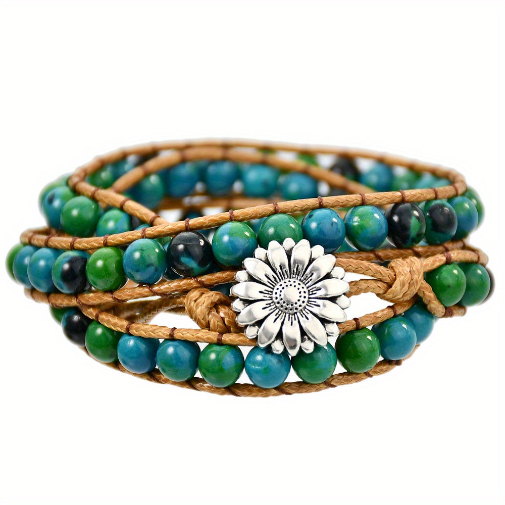 This 3-layer wrap bracelet features chrysocolla beads on leather rope, adjustable for a perfect fit. The healing natural stone design is perfect for women and girls.