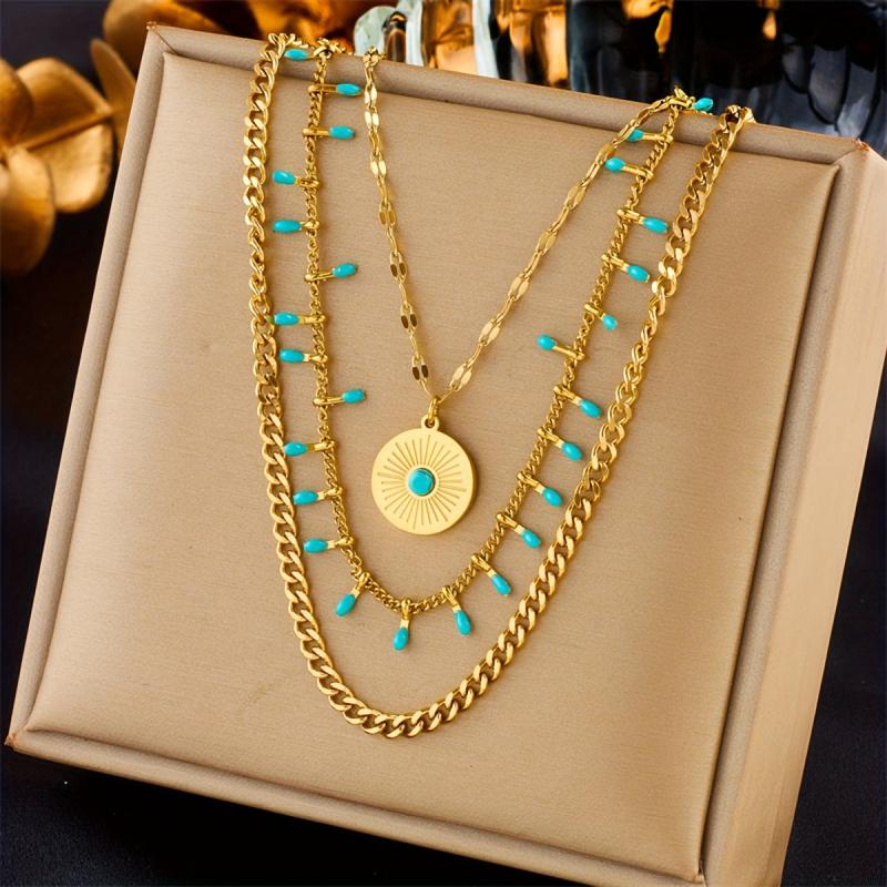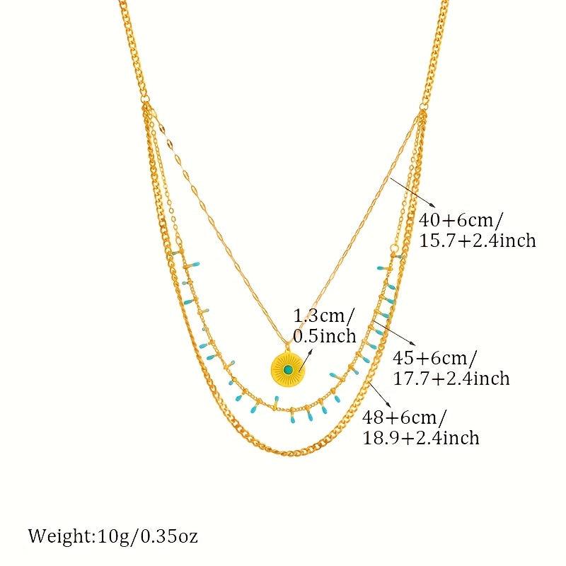 Elevate your party look with this boho stainless steel necklace featuring multiple layers of chains and a coin pendant inlaid with round beads resin mosaic. Perfect for adding a touch of style to any outfit.