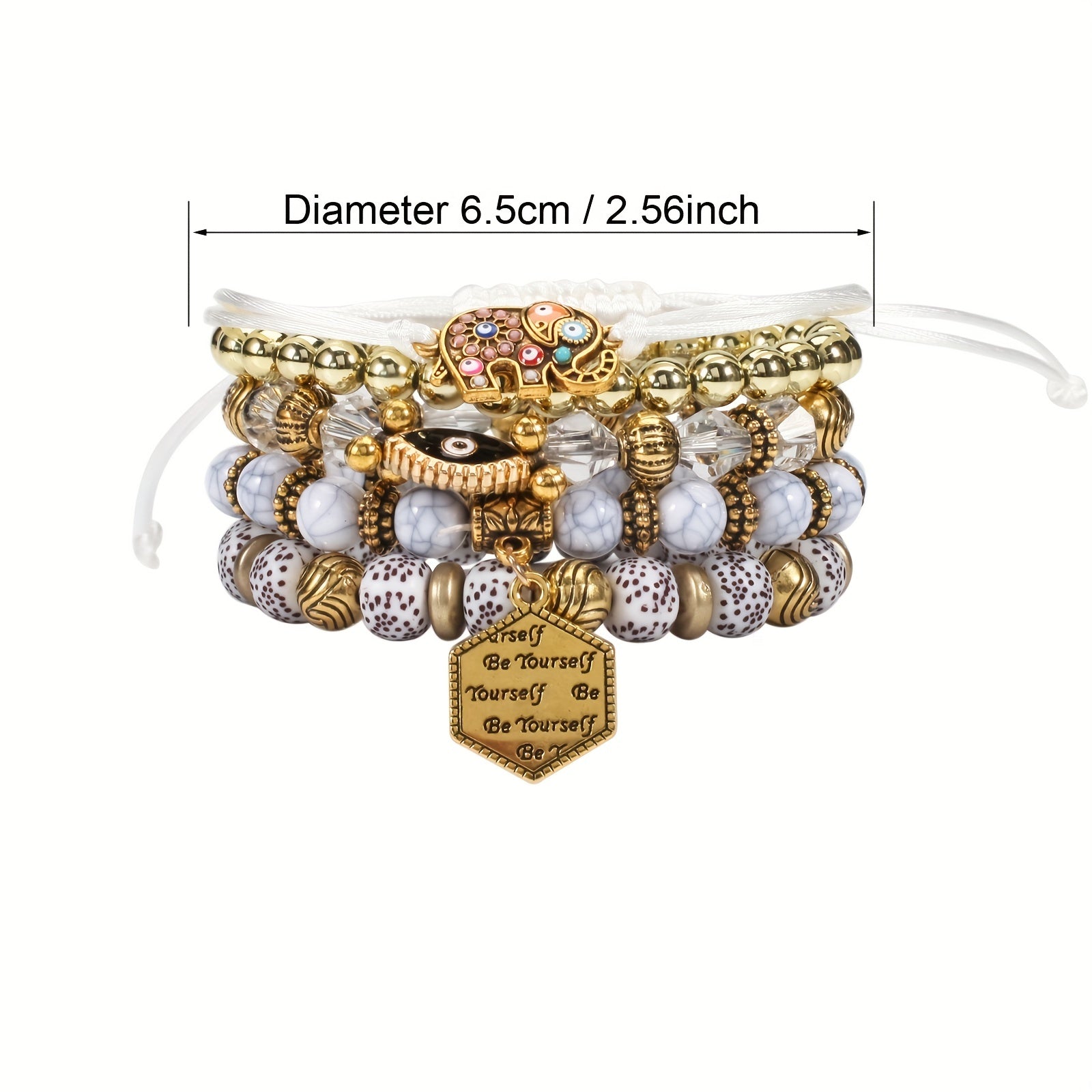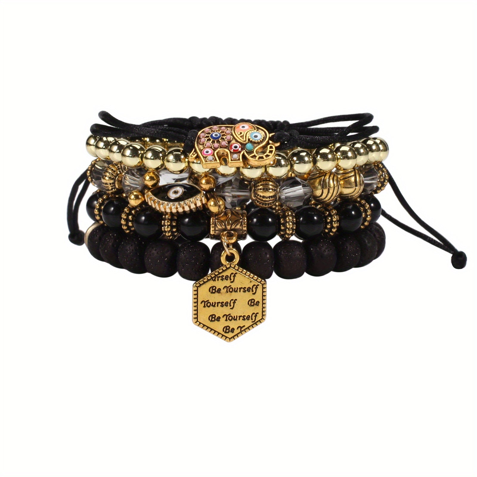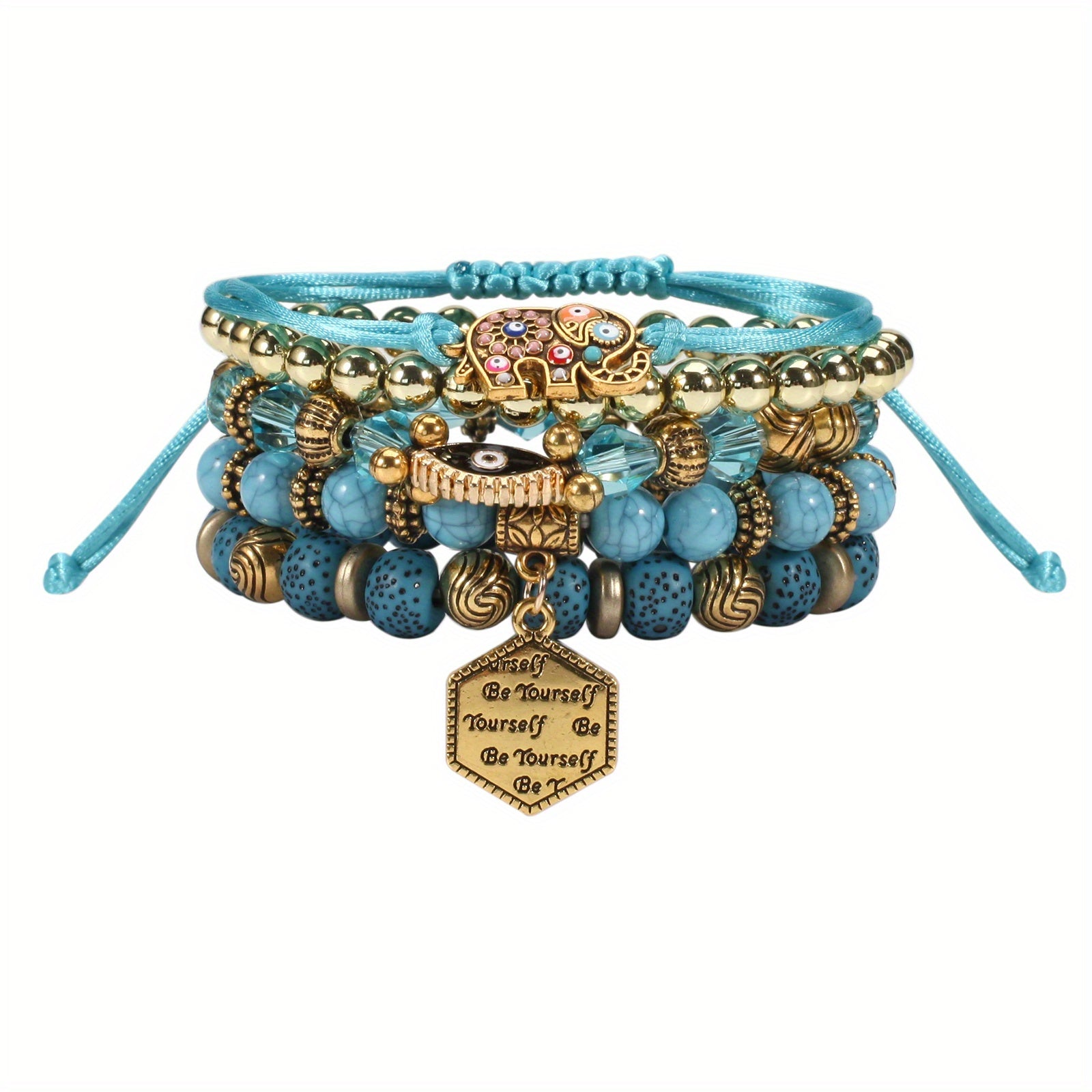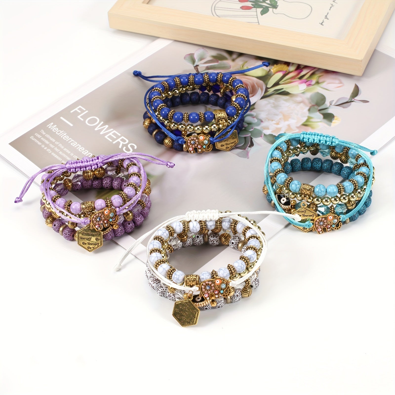 Add a touch of bohemian charm to your outfit with this set of stretch bracelets featuring elephant eye beads and braided designs. These adjustable bracelets can be stacked for a trendy hand jewelry look.