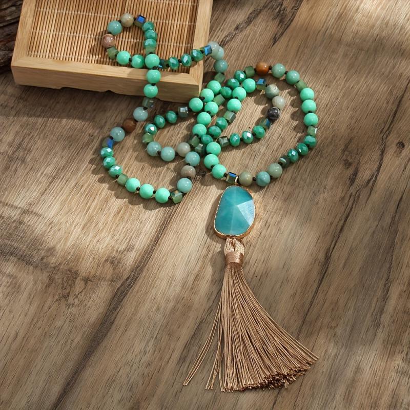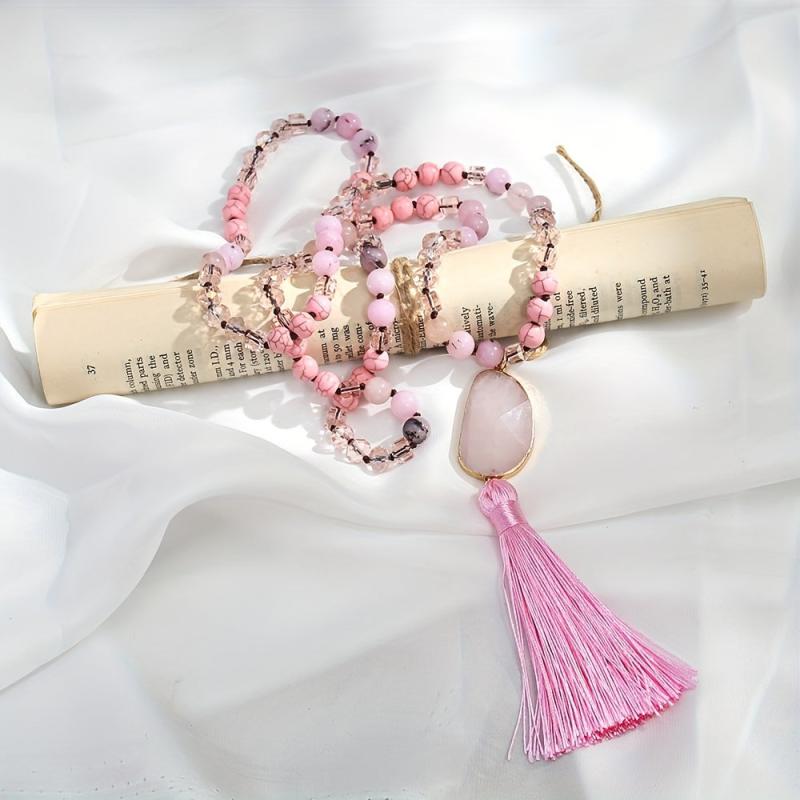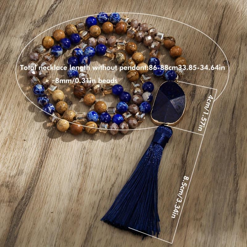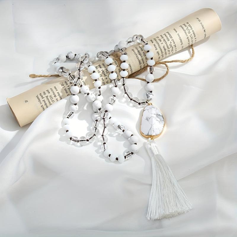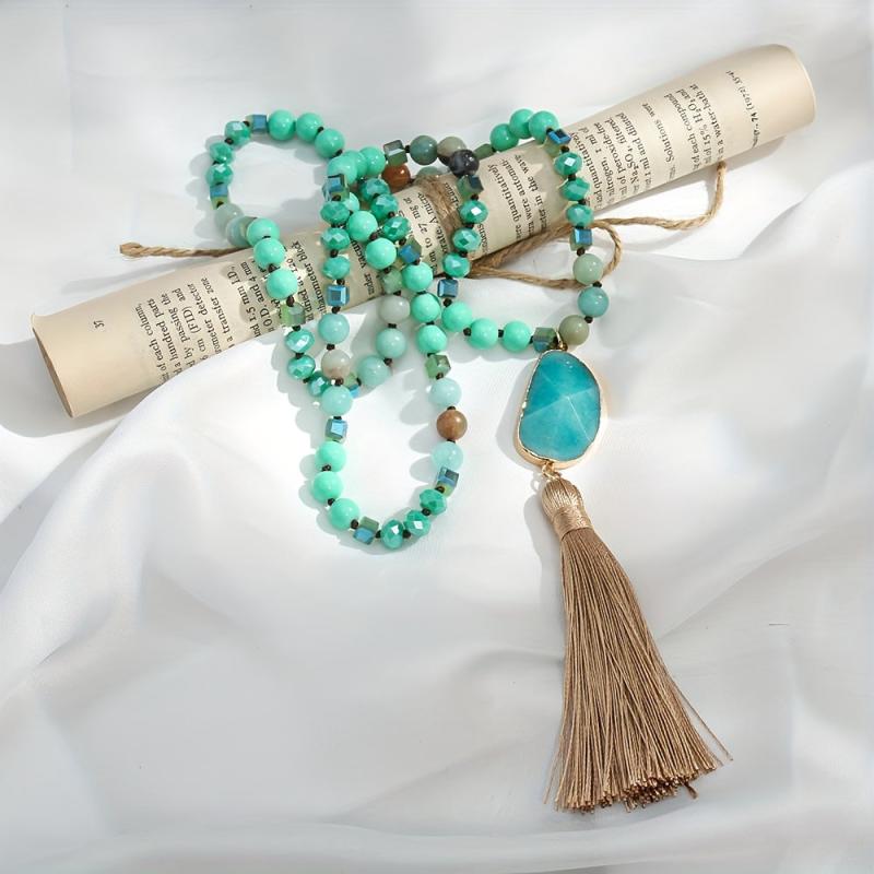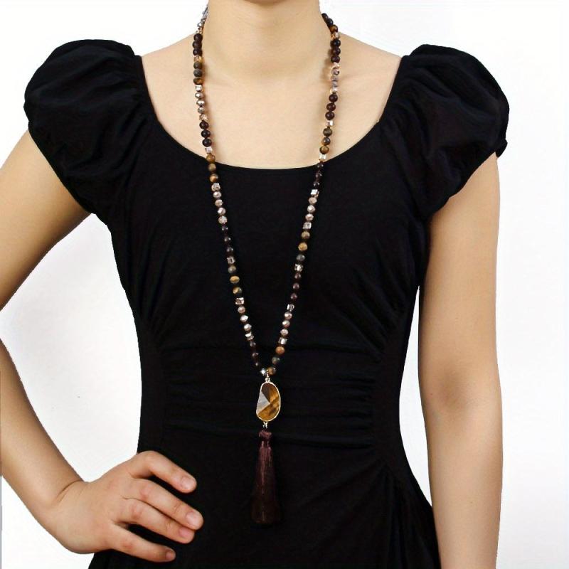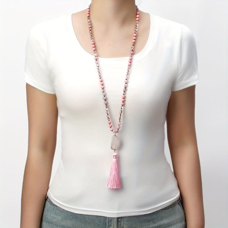 Add a touch of bohemian style to your outfits with this unique necklace featuring a crescent stone fringe pendant. Perfect for travel or parties.