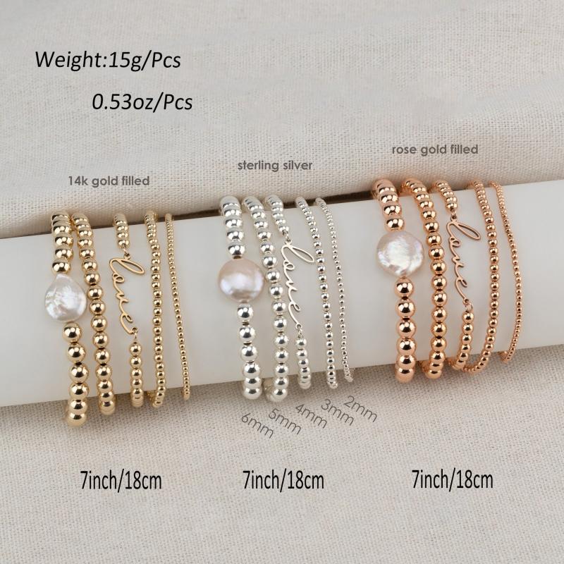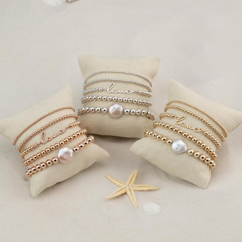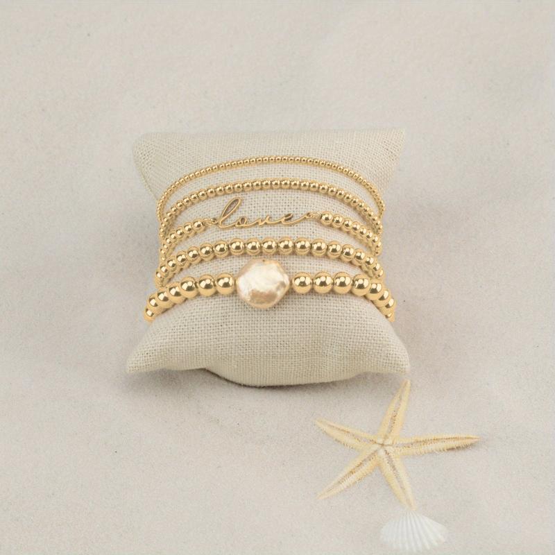 Enhance your style with this 5-piece set of boho ethnic style bracelets featuring love symbols and baroque faux pearls. The perfect accessory for girls.