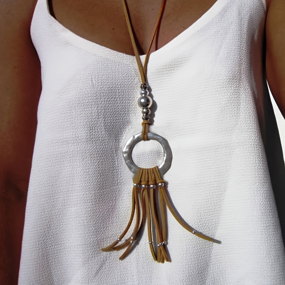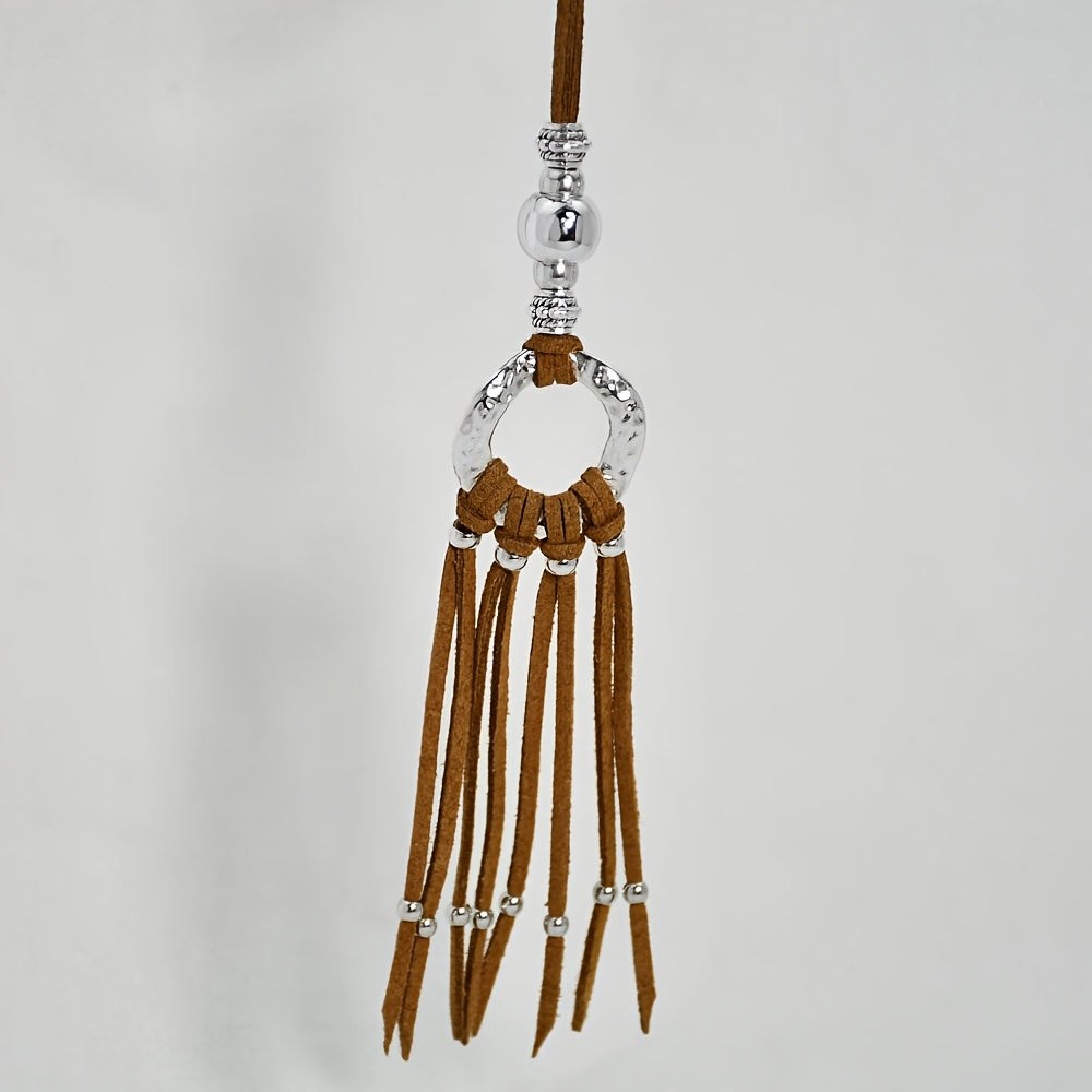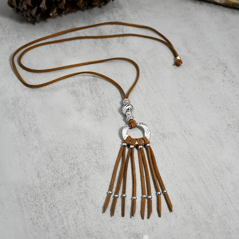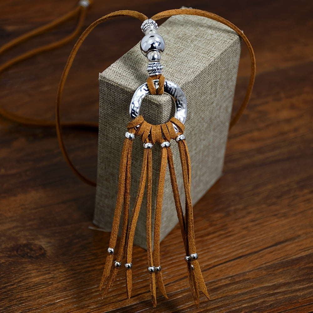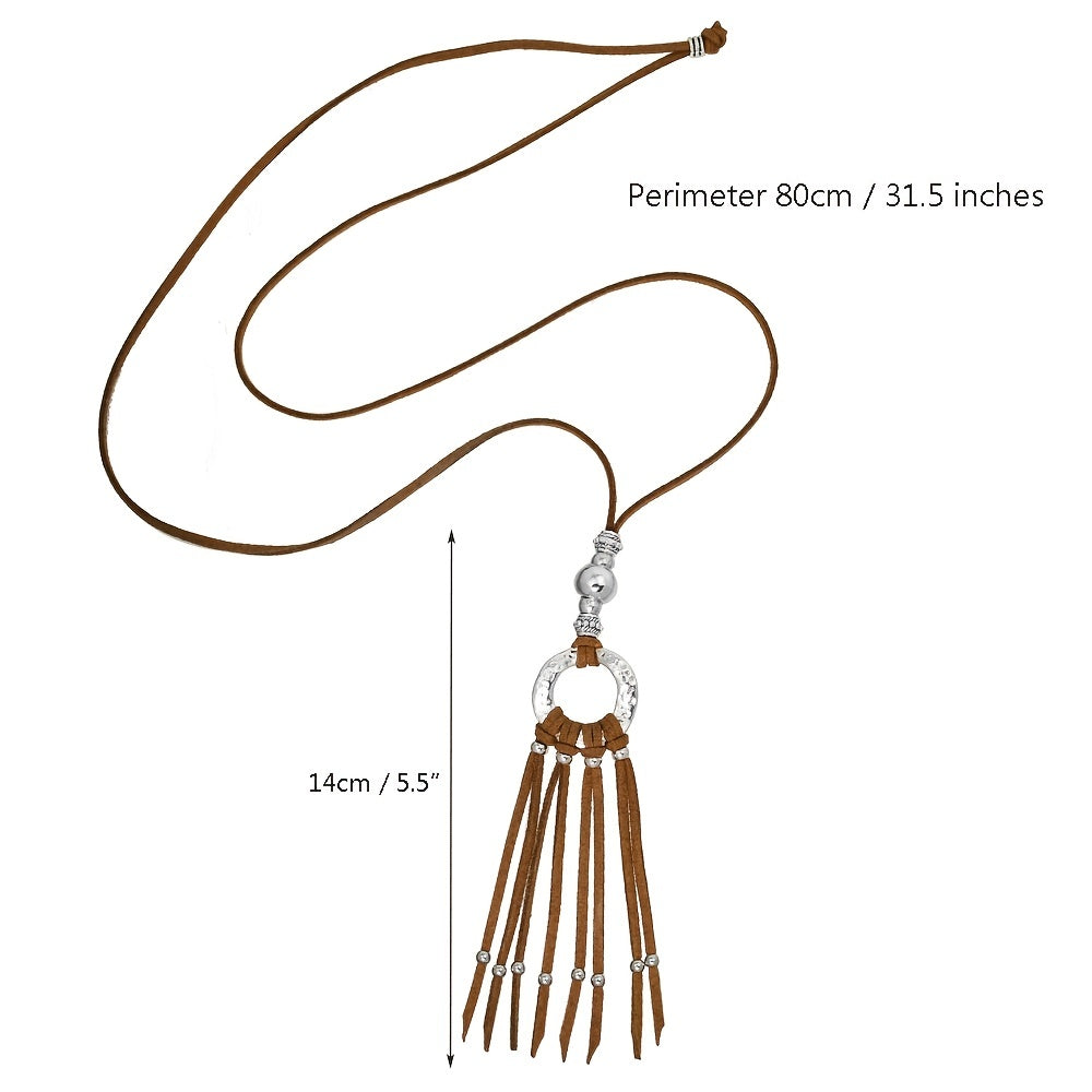 Add a touch of boho chic to your outfit with this ethnic style long necklace featuring a brown velvet leather rope with tassel accent.