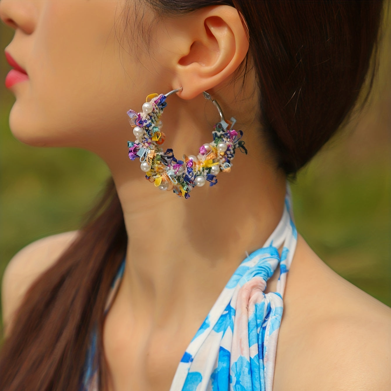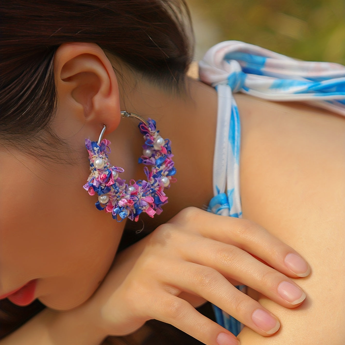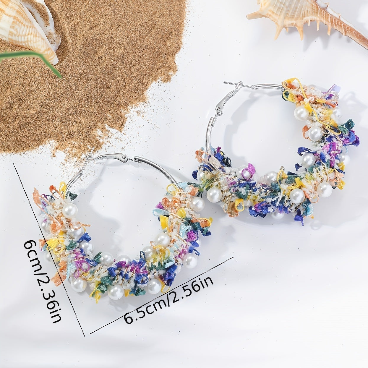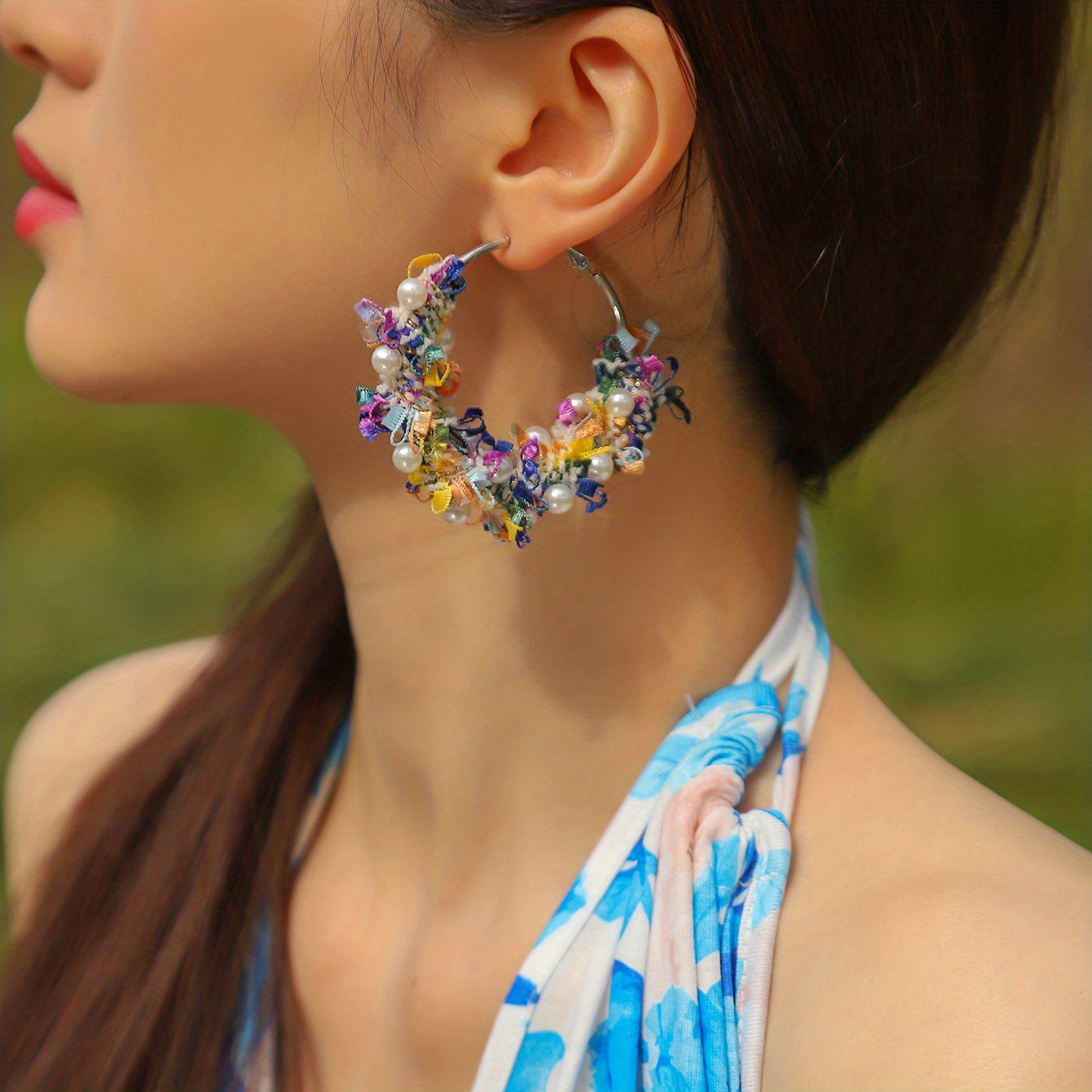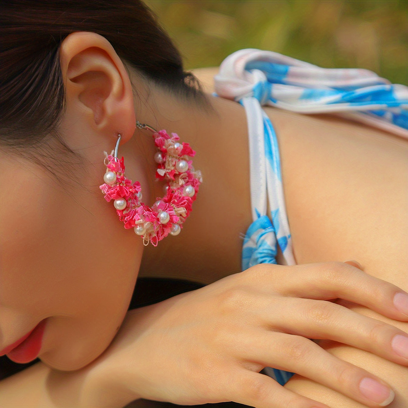 Add a pop of color and style to your holiday or beach party look with these vibrant garland hoop earrings adorned with faux pearls.