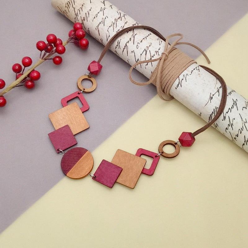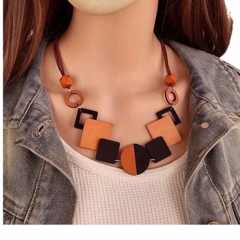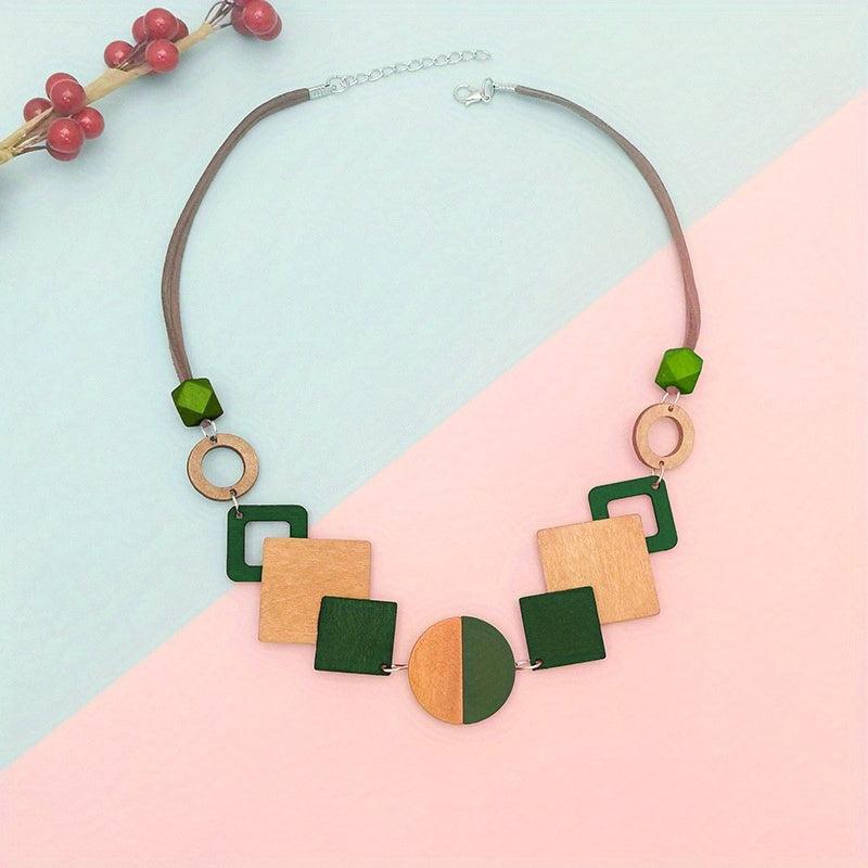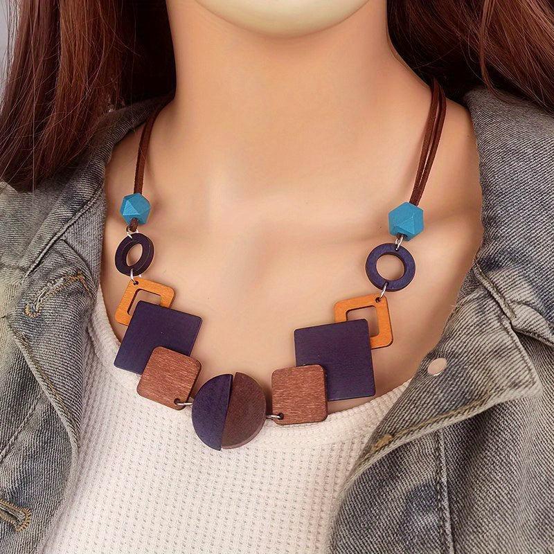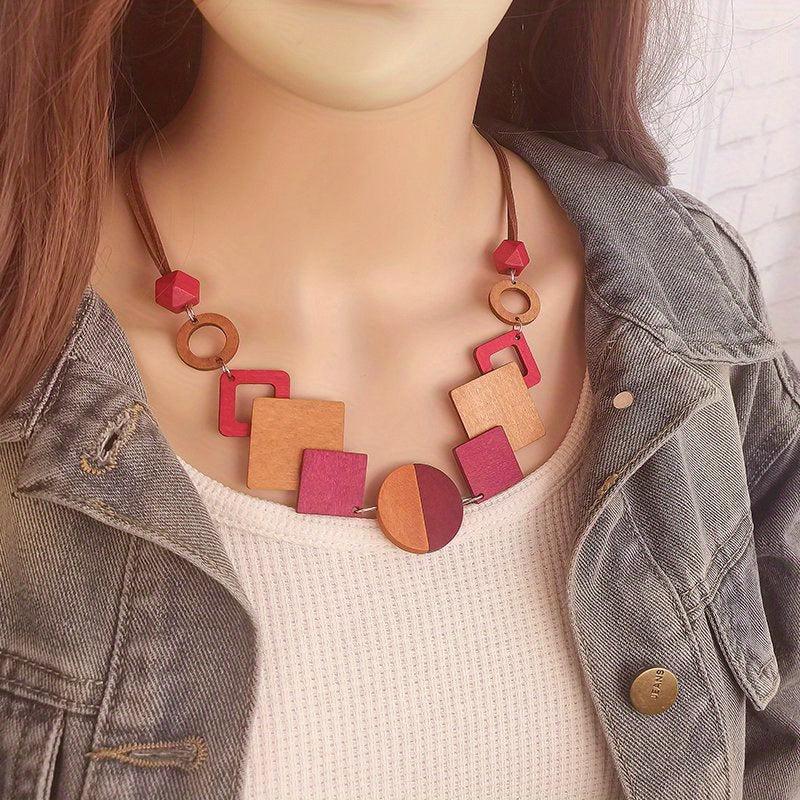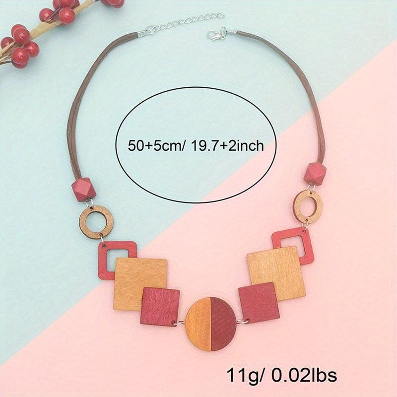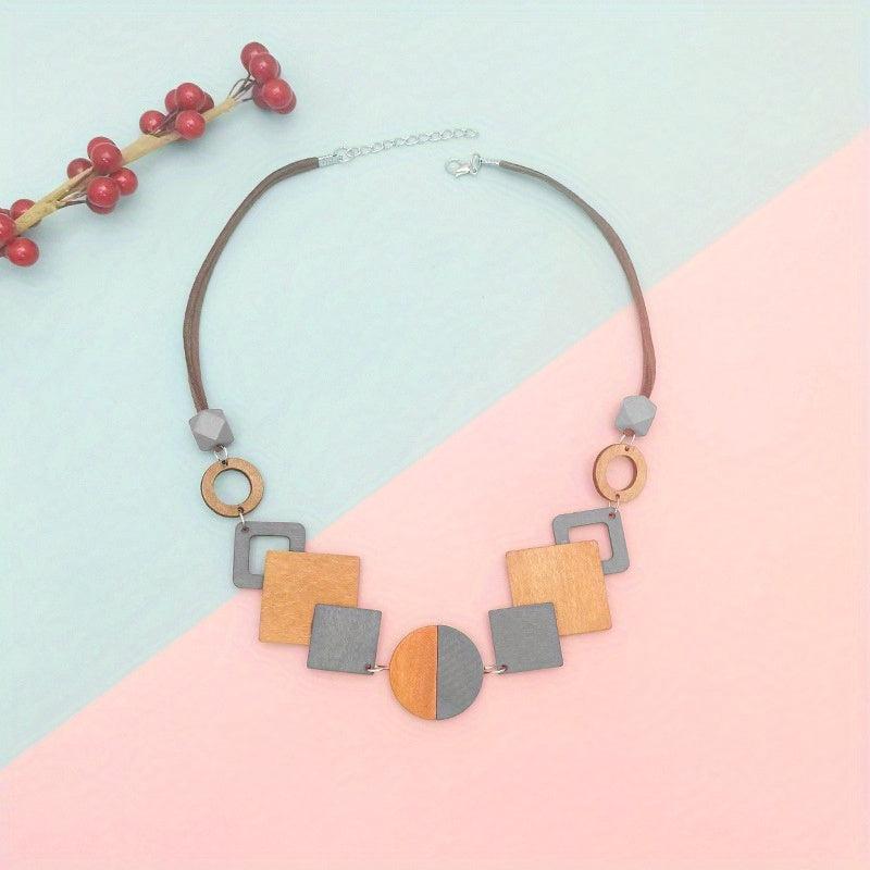 This retro wooden necklace features a colorful geometric pendant in an ethnic style, perfect for daily wear and bohemian jewelry enthusiasts.