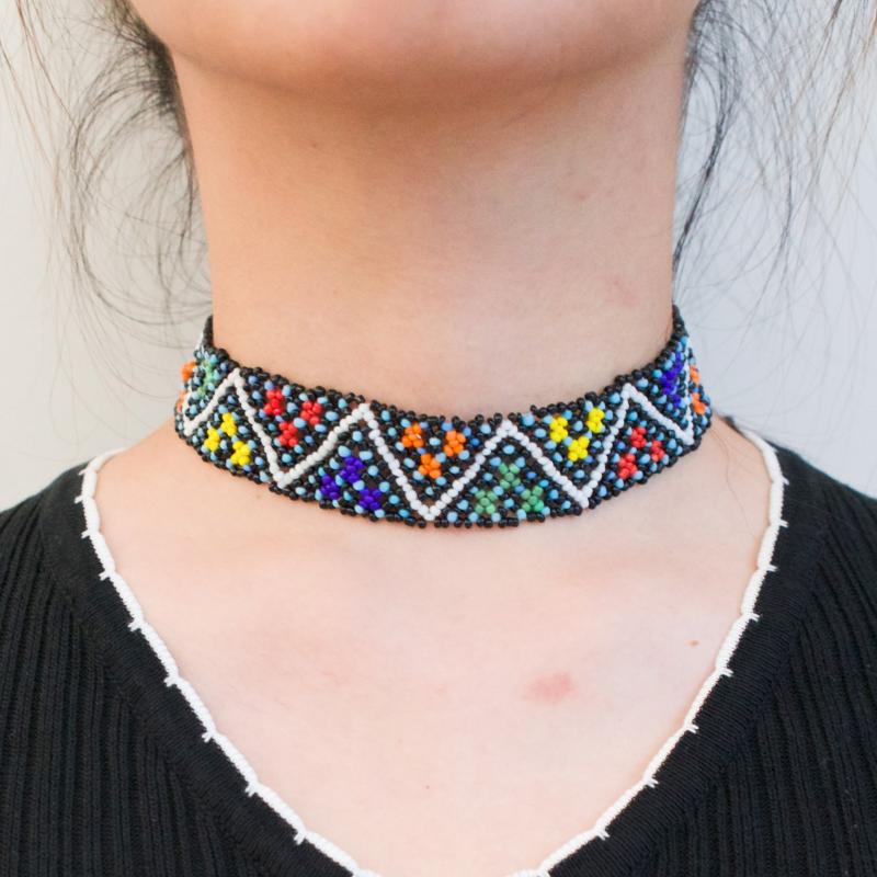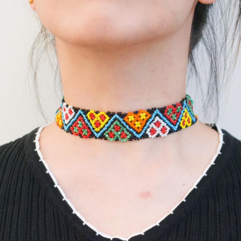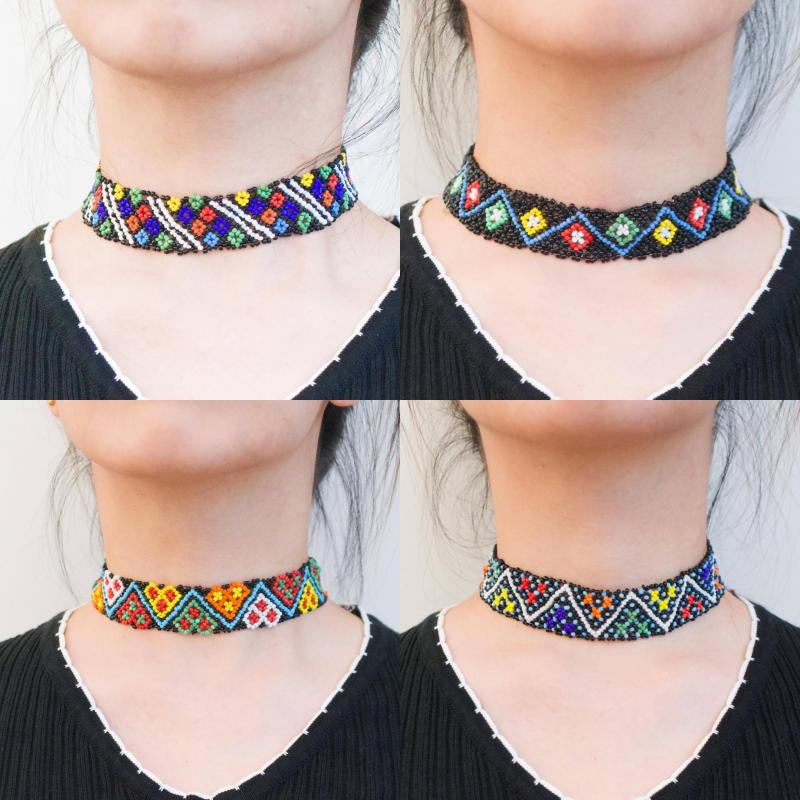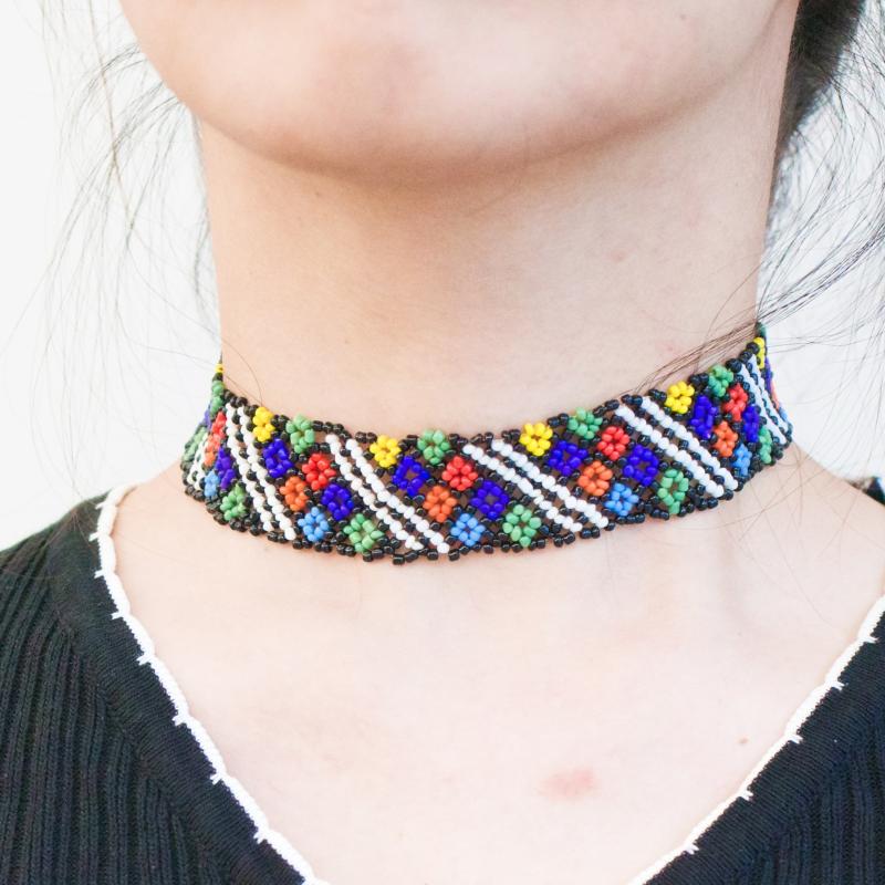 Add a pop of color and style to your outfit with this unique bohemian choker necklace. Handwoven with colorful beads in a geometric pattern, it is lightweight and durable, perfect for daily wear or vacation jewelry.