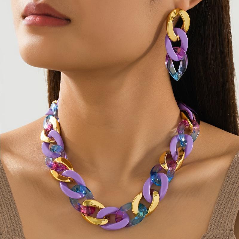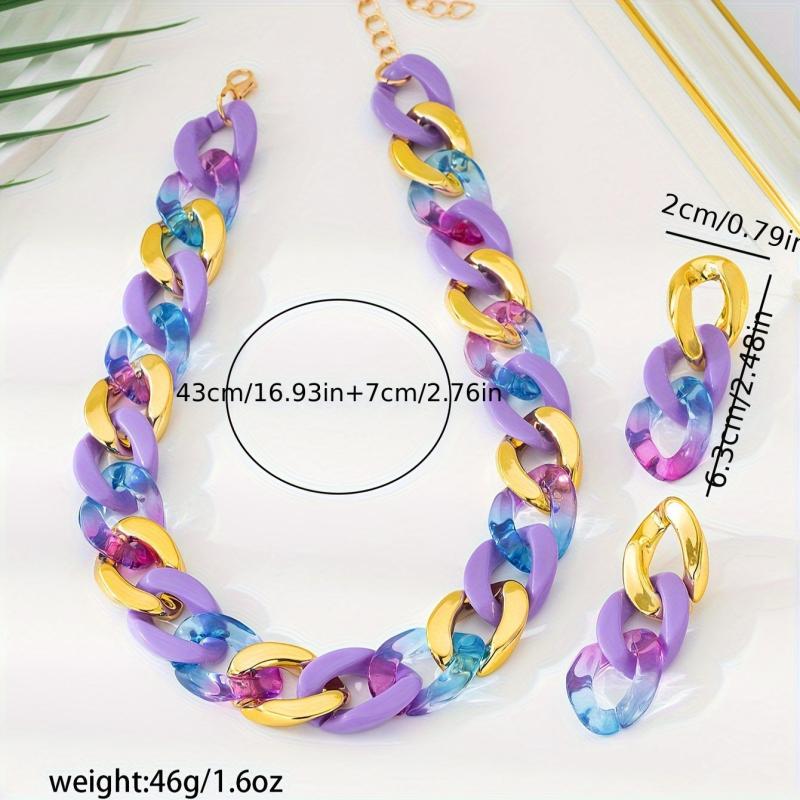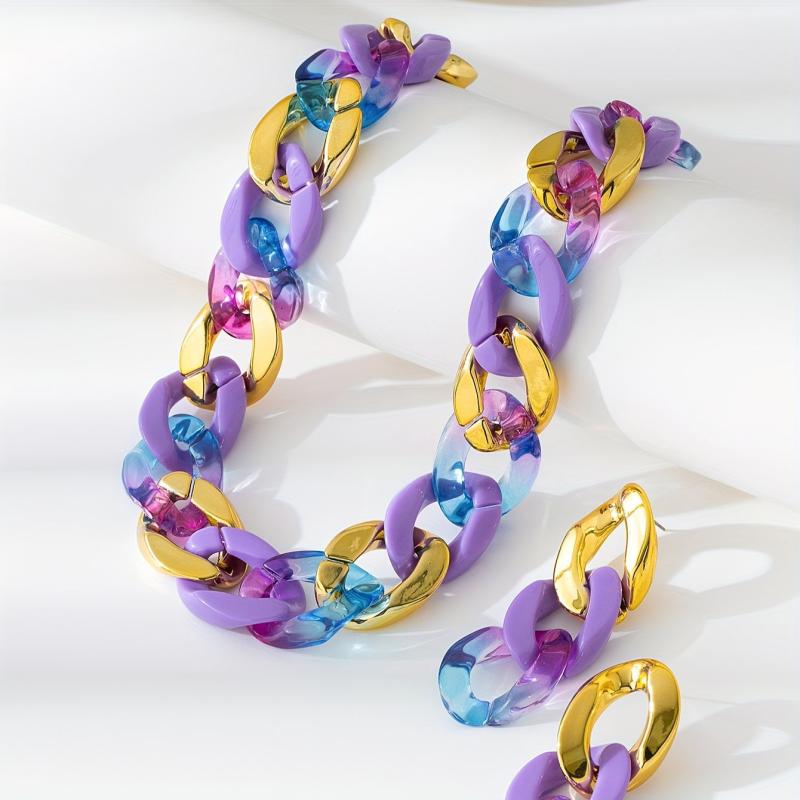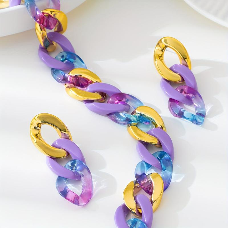 This 3-piece set features a colorful gradient design that adds a funky style to any outfit. Perfect for daily wear or parties, this boho hip hop jewelry set is sure to make a statement.