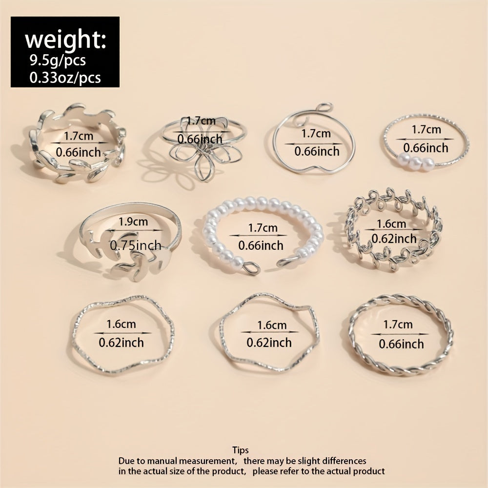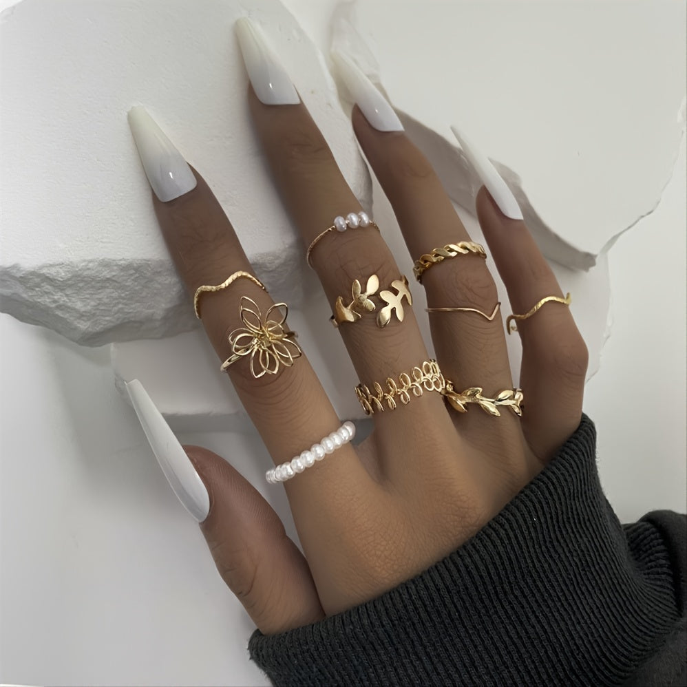 This set includes 10 bohemian style rings featuring hollow flower, leaf, vine, and pearl designs. Perfect for adding a touch of nature-inspired beauty to your look.