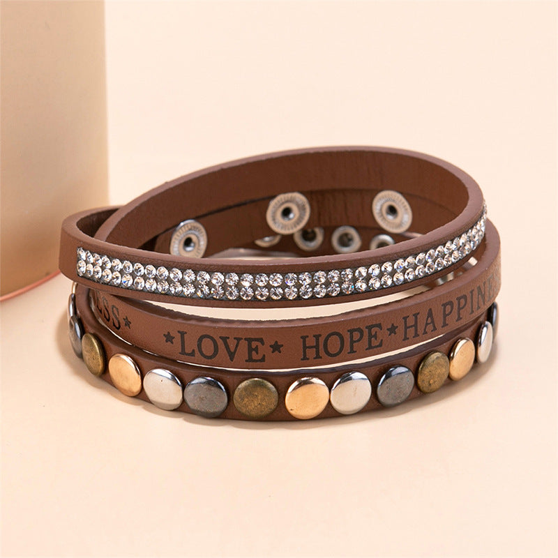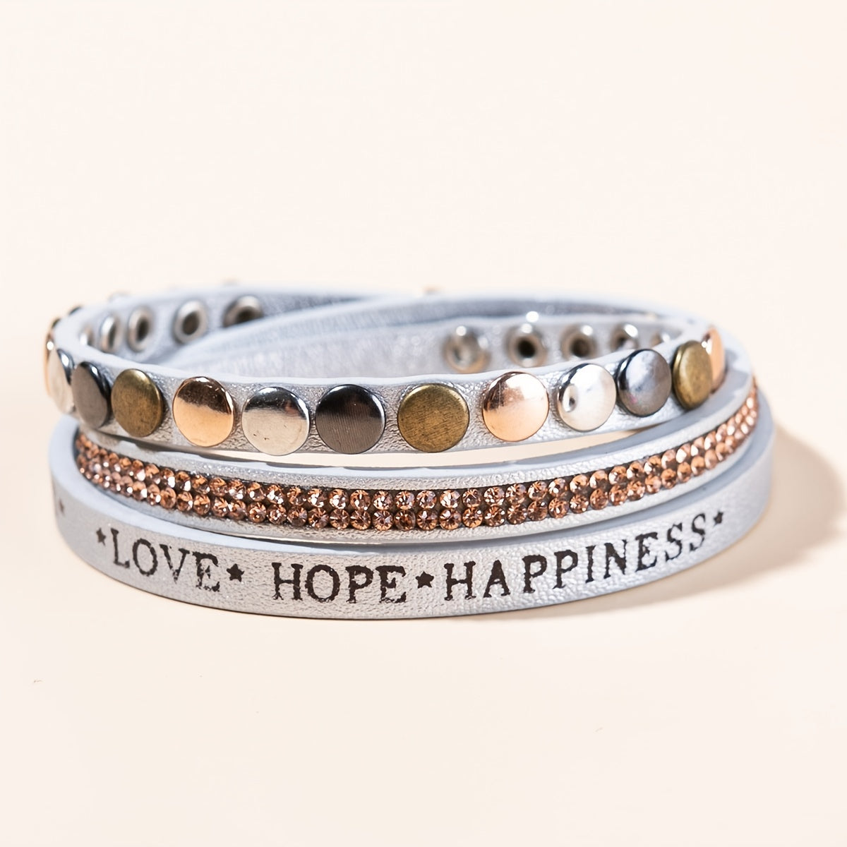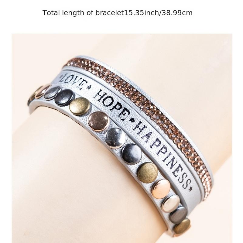 Stay stylish with this multilayer wrap leather bracelet featuring a letter pattern and rhinestone accents. The magnetic clasp ensures easy wear and a secure fit.