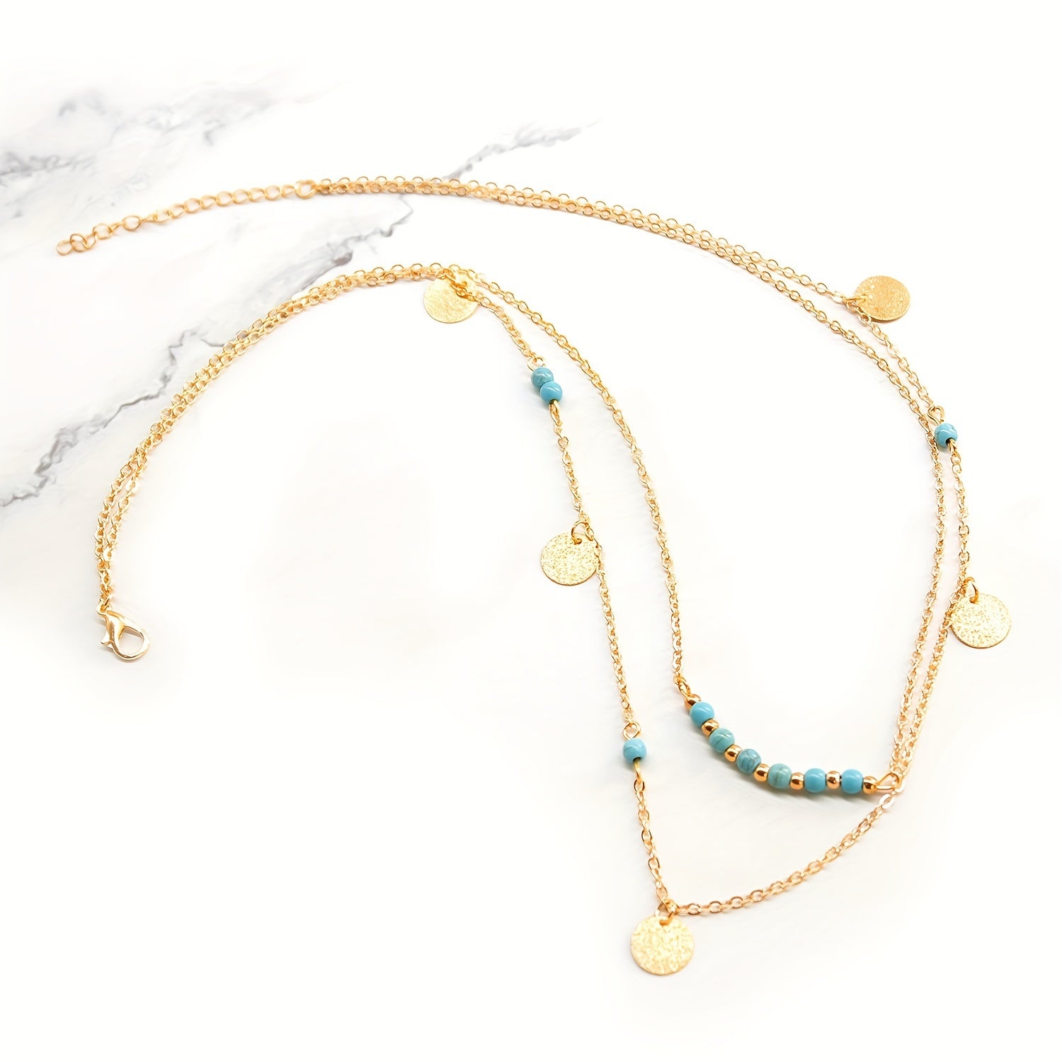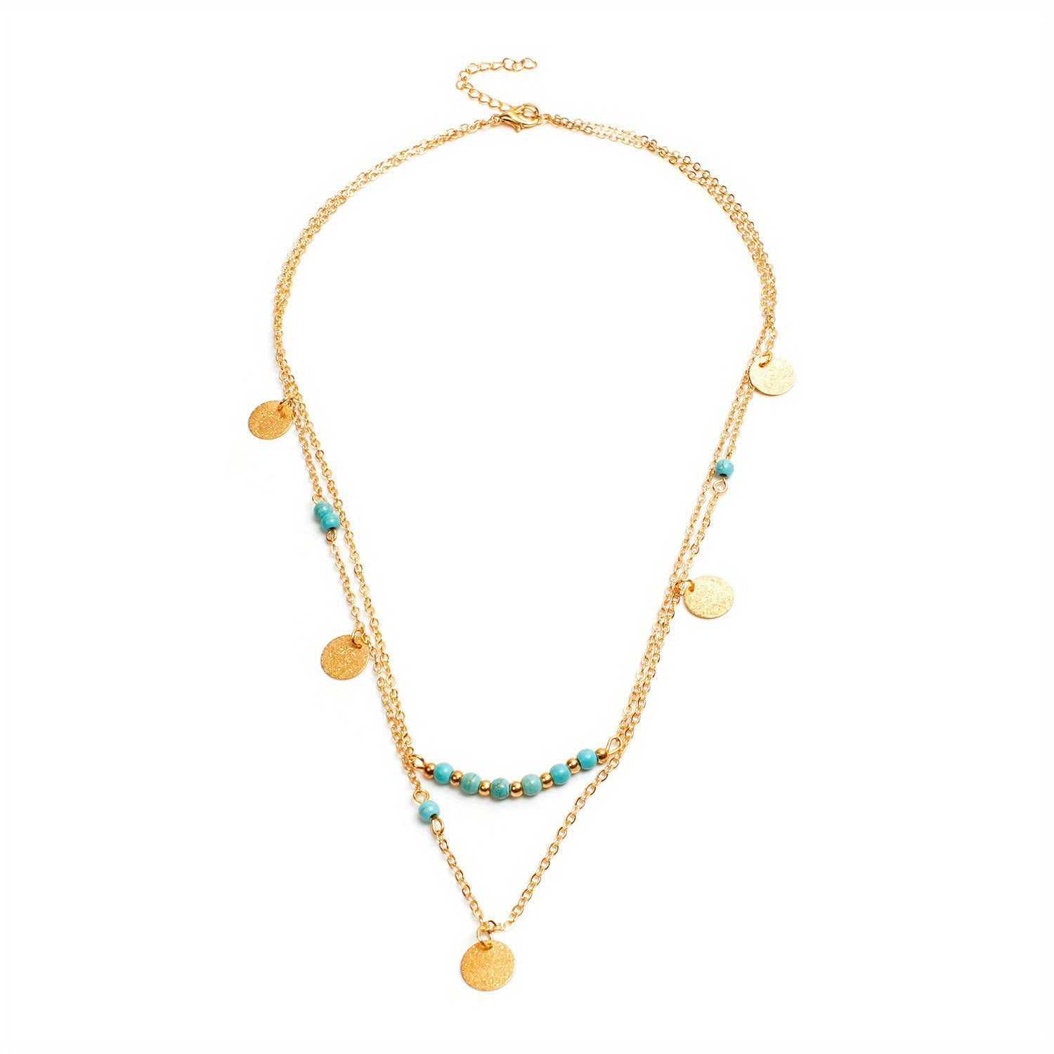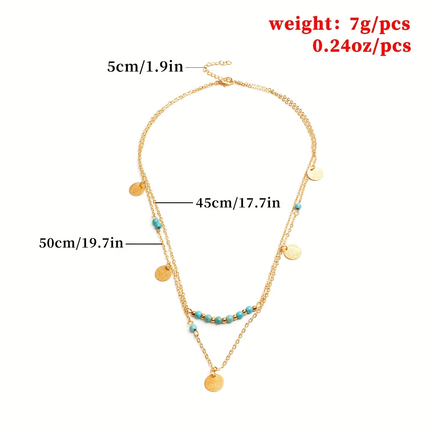 Add a touch of bohemian charm to your look with this multilayer double round piece bead turquoise pendant necklace. The silver plated chain is perfect for adding a stylish accent to your outfit.