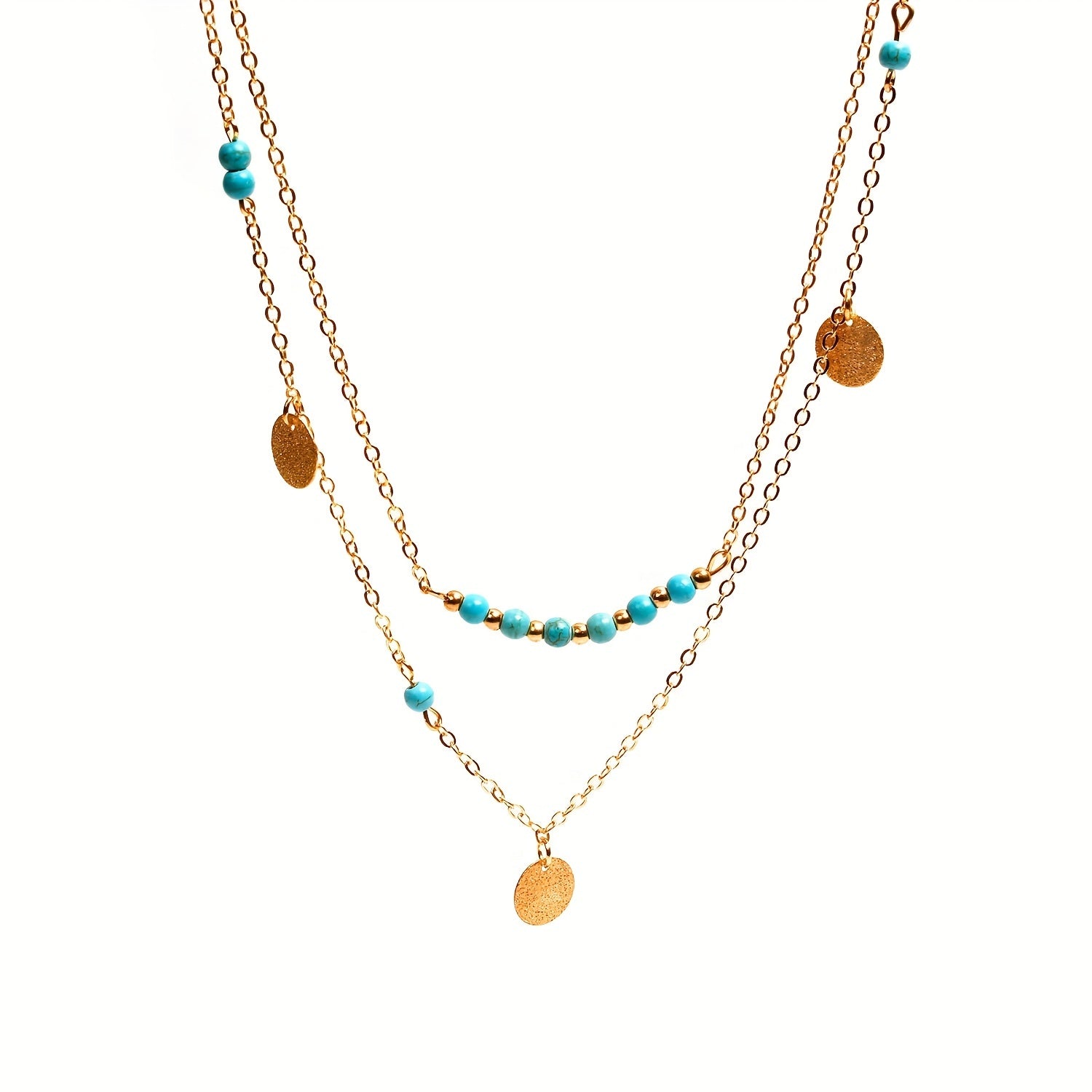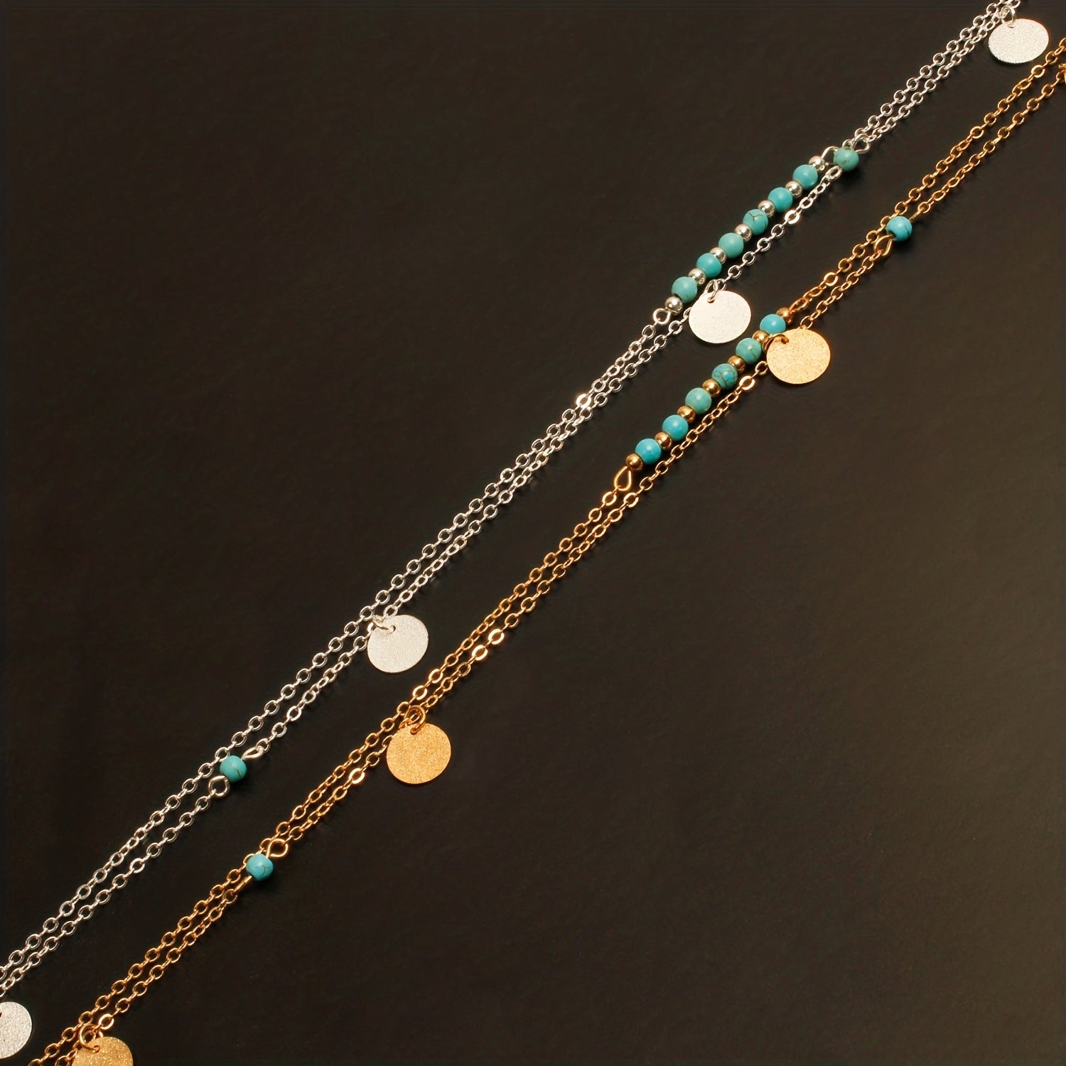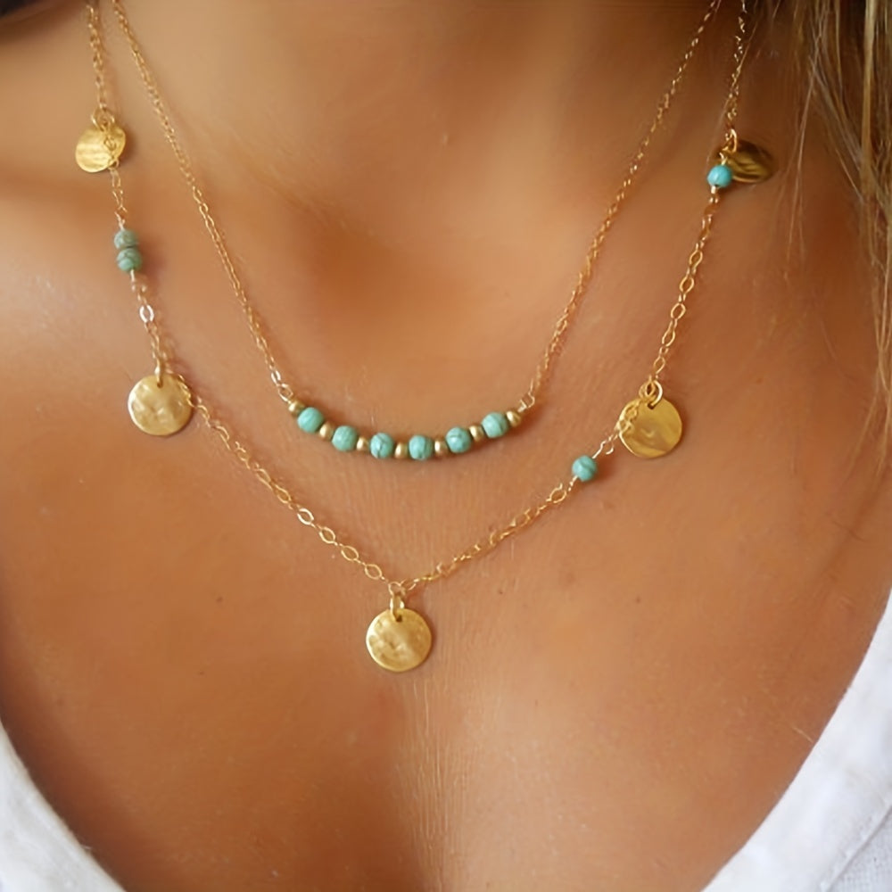 Add a touch of bohemian charm to your look with this multilayer double round piece bead turquoise pendant necklace. The silver plated chain is perfect for adding a stylish accent to your outfit.