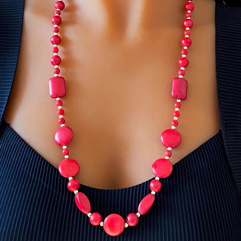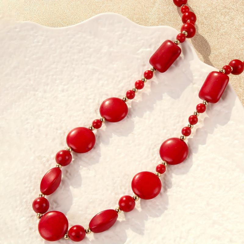 Embrace your bohemian style with this vibrant shell necklace that resembles the beauty of red turquoise. Perfect accessory for summer.
