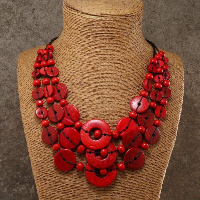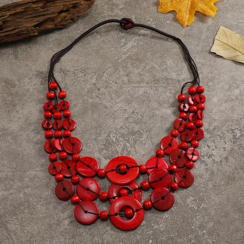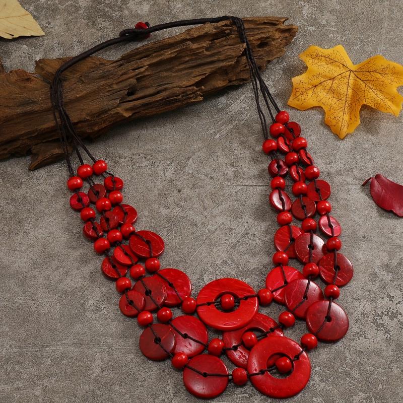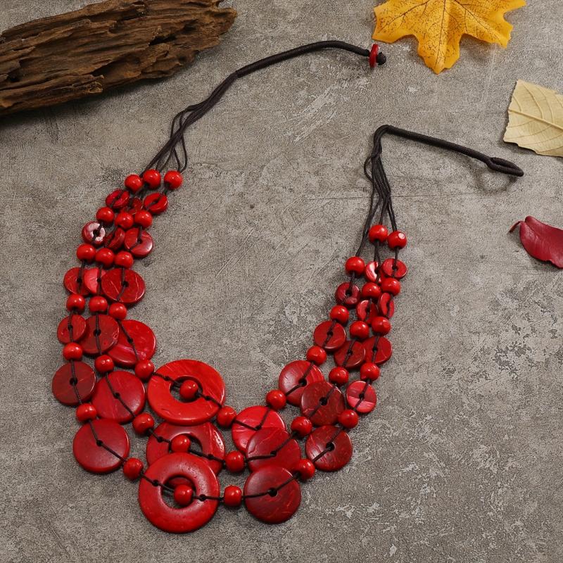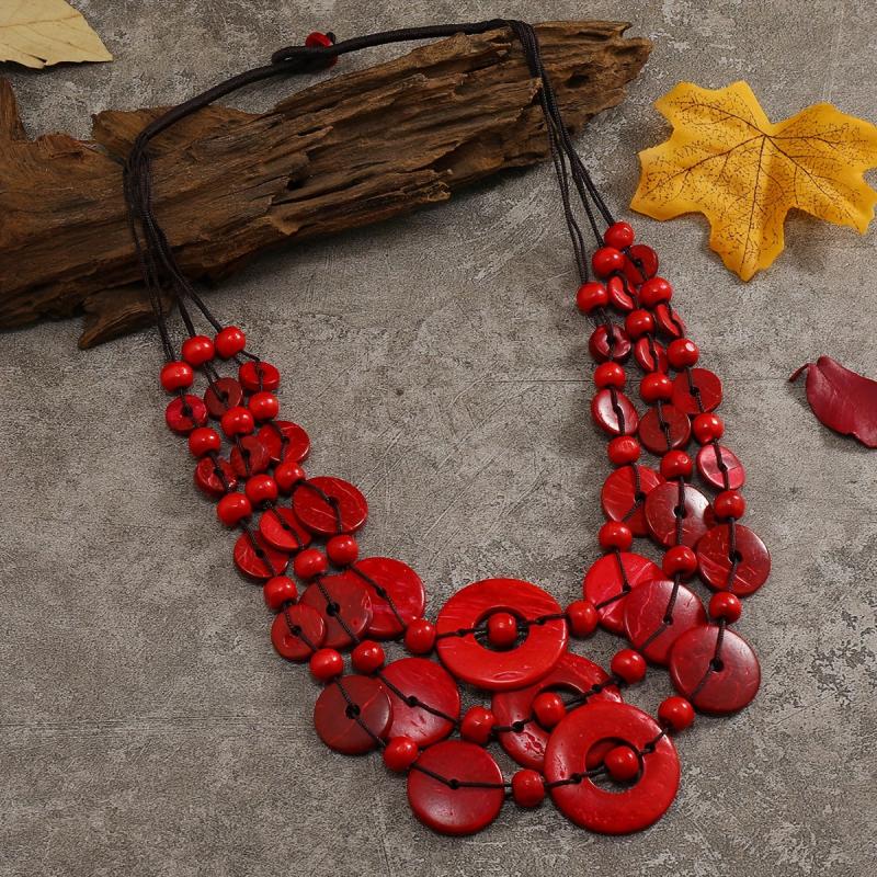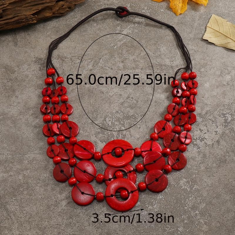 This bohemian retro layered necklace features recycled wood beads with red accents, creating a unique and versatile piece that is perfect for women to wear daily or at music festivals year-round.