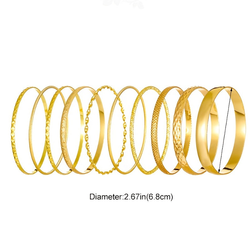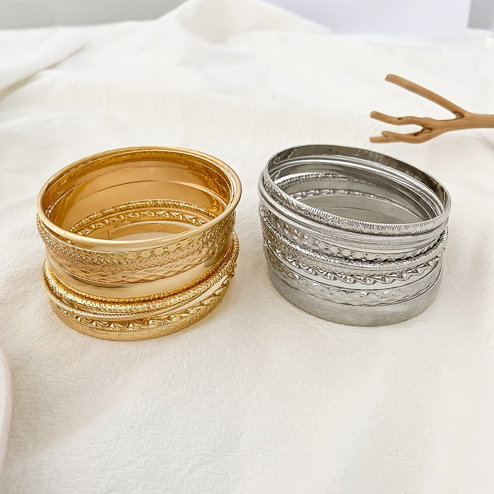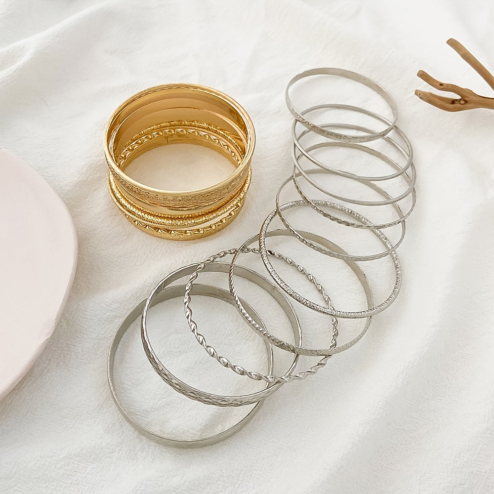 Enhance your summer beach clothing with this stackable bracelet set. Made of alloy with 14K gold plating, this hand jewelry is perfect for adding a touch of boho style to your look.