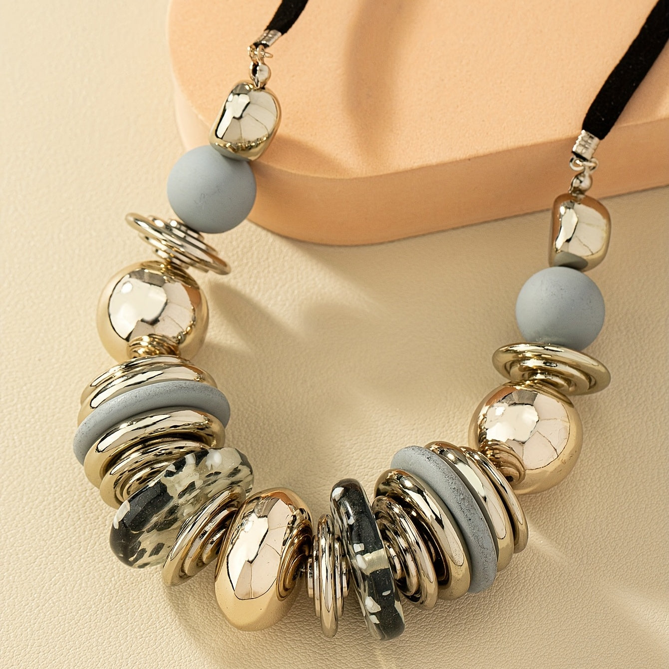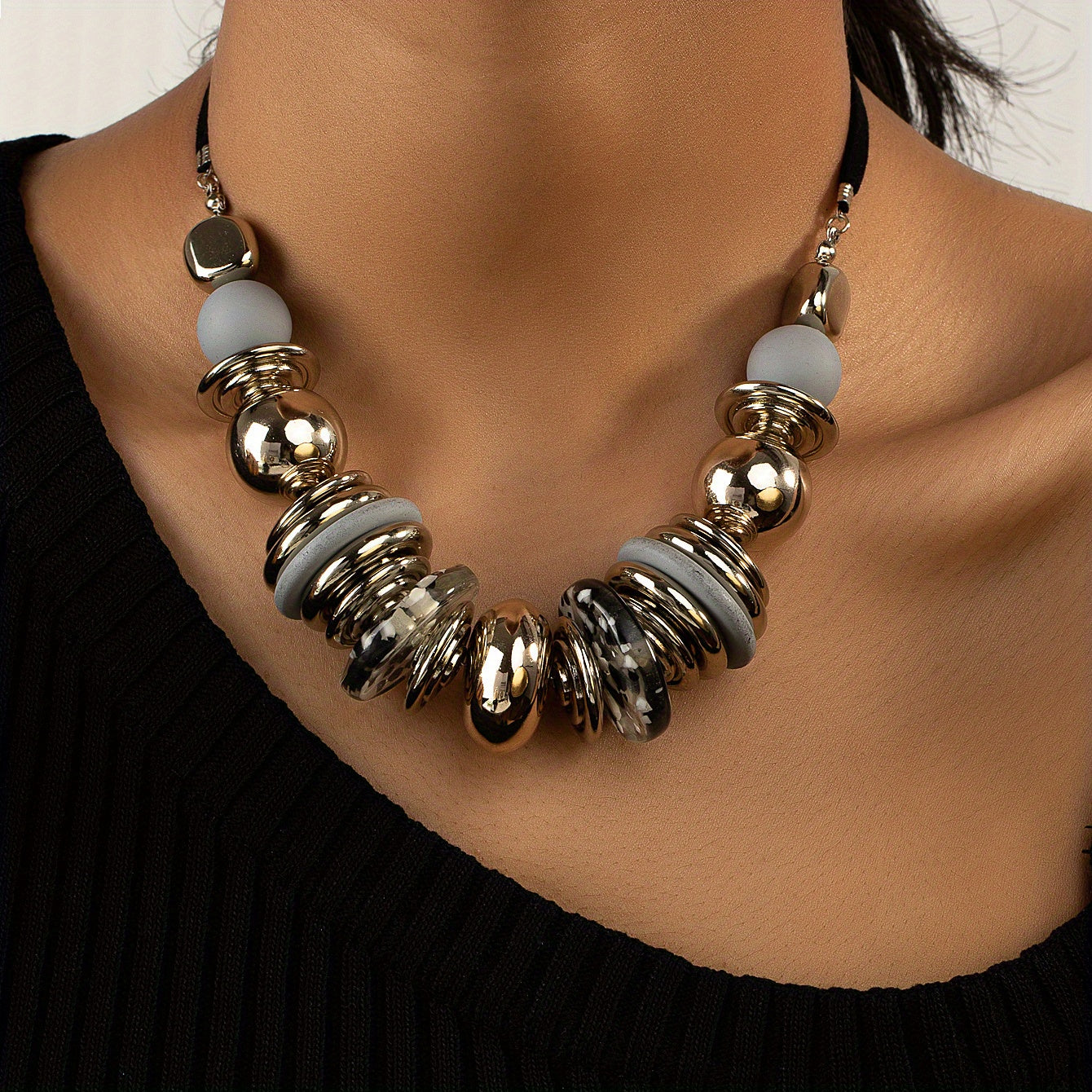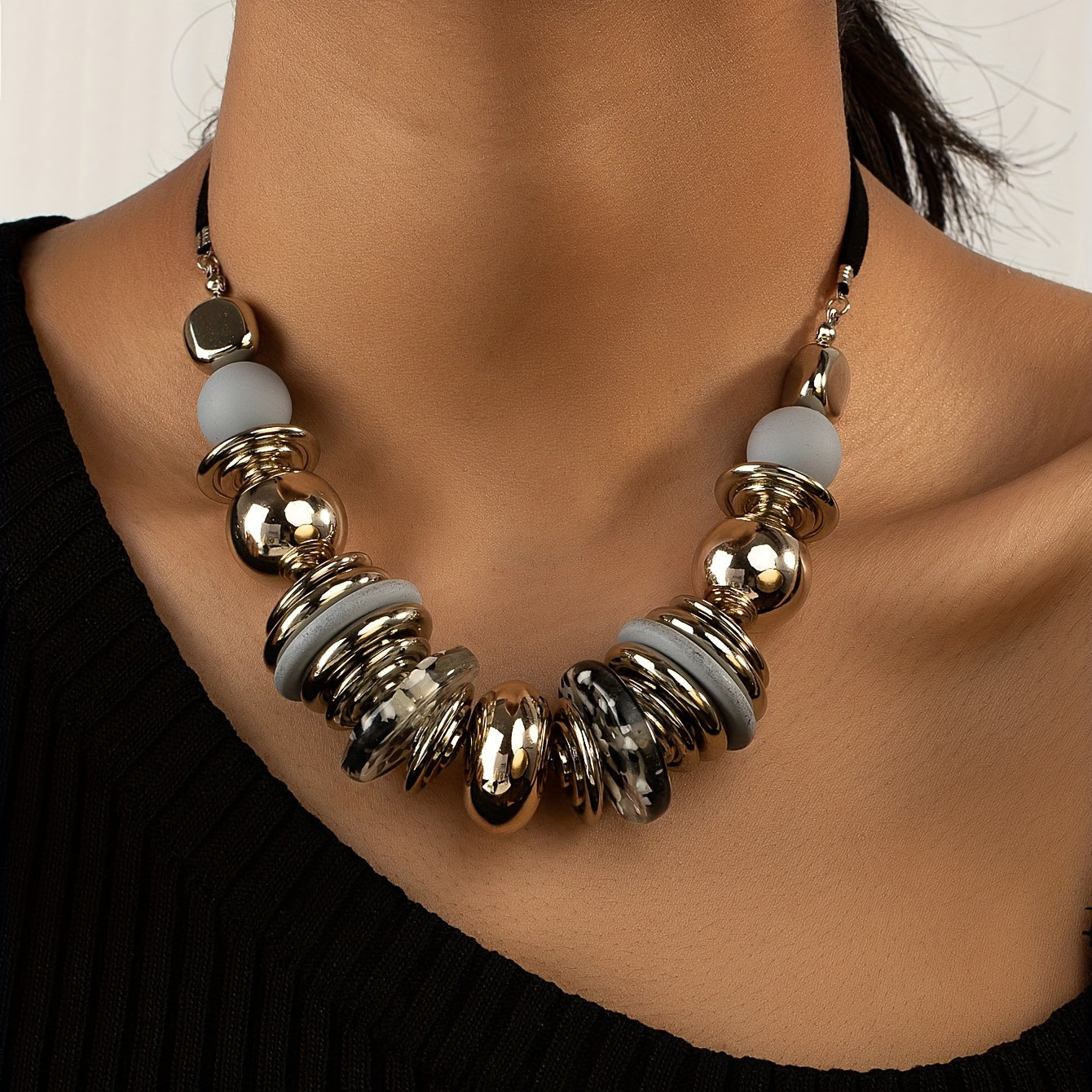 Make a bold statement with this exaggerated beaded necklace featuring chunky resin beads. Perfect for adding a boho touch to your outfit.