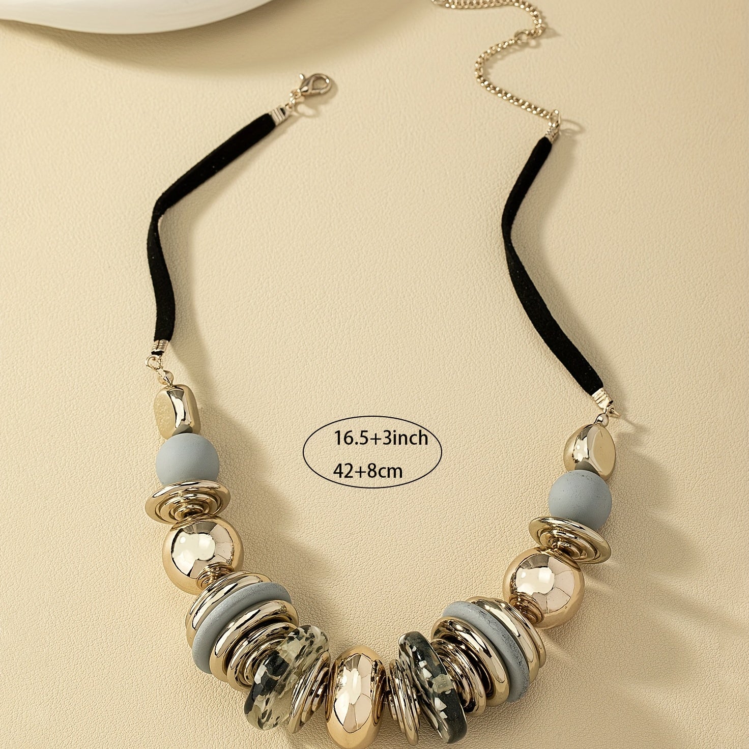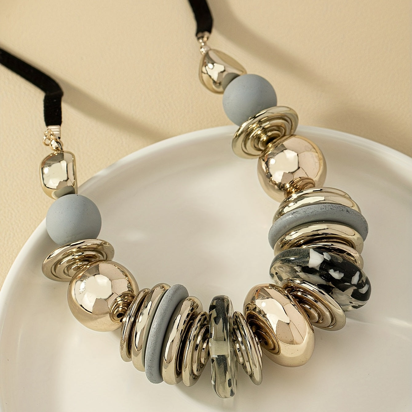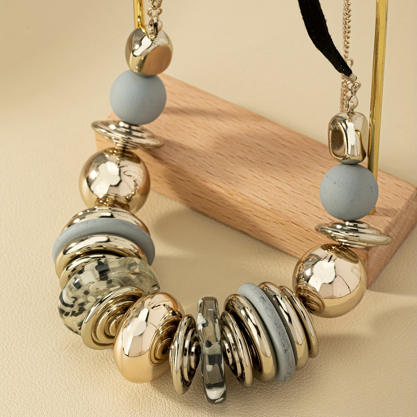 Make a bold statement with this exaggerated beaded necklace featuring chunky resin beads. Perfect for adding a boho touch to your outfit.