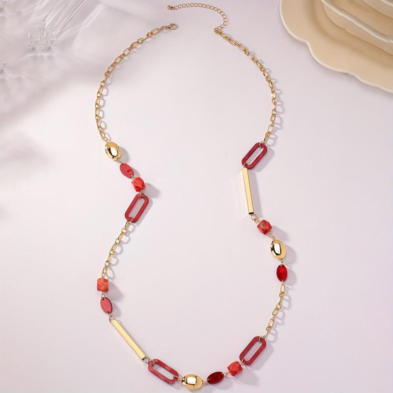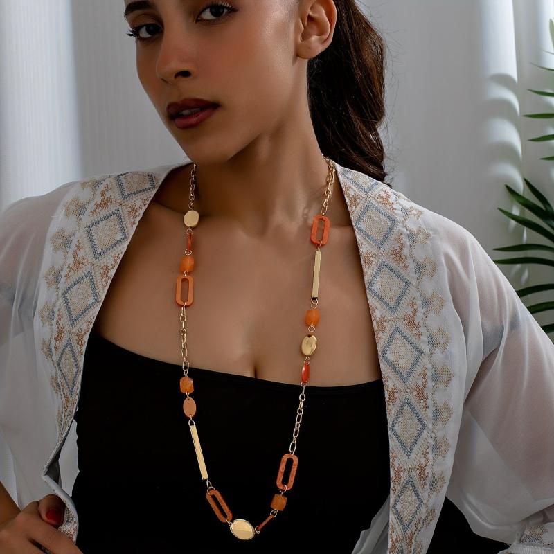 Elevate your look with this bohemian style long sweater chain necklace featuring a geometric pattern in golden plating.