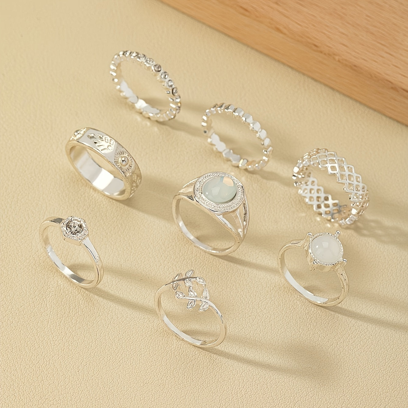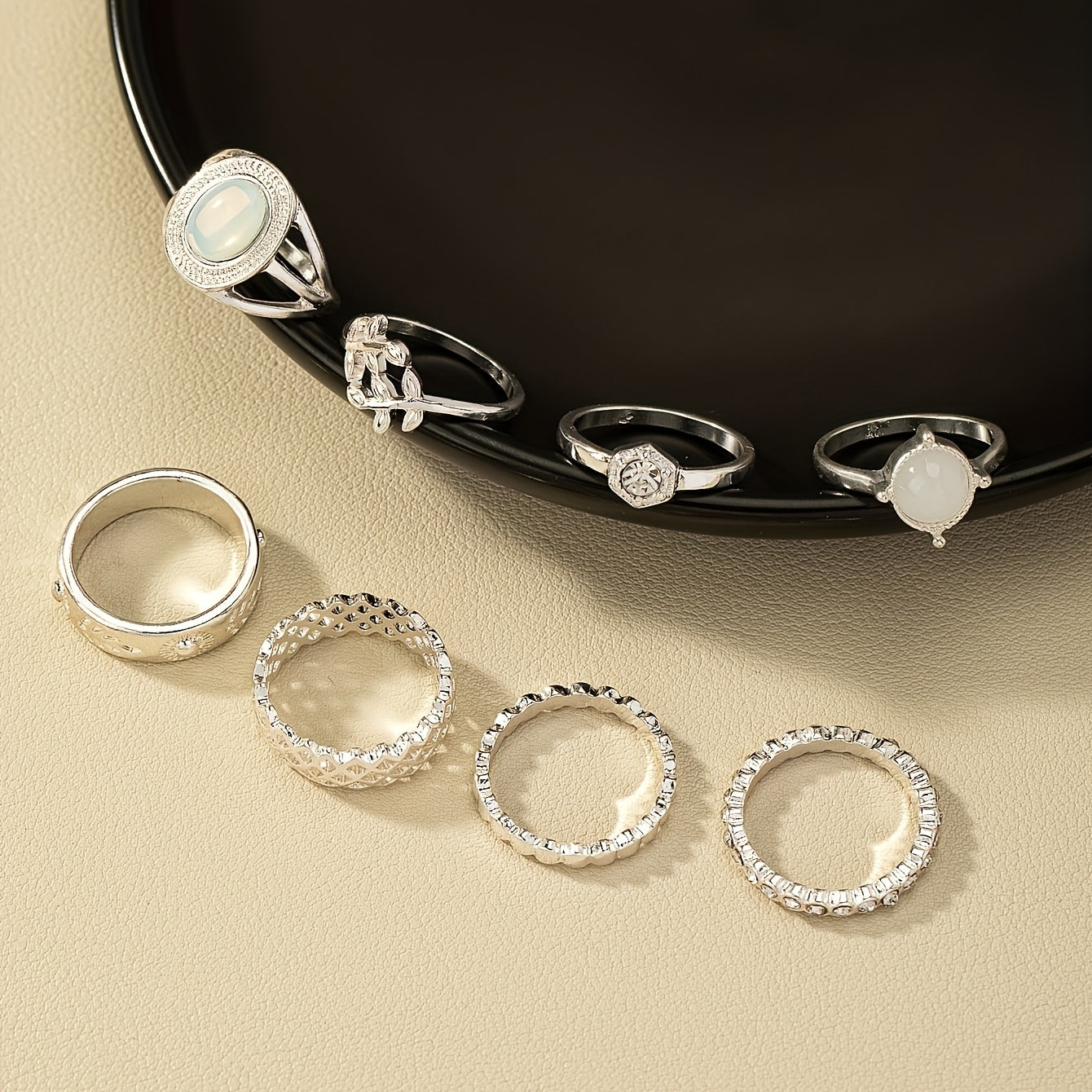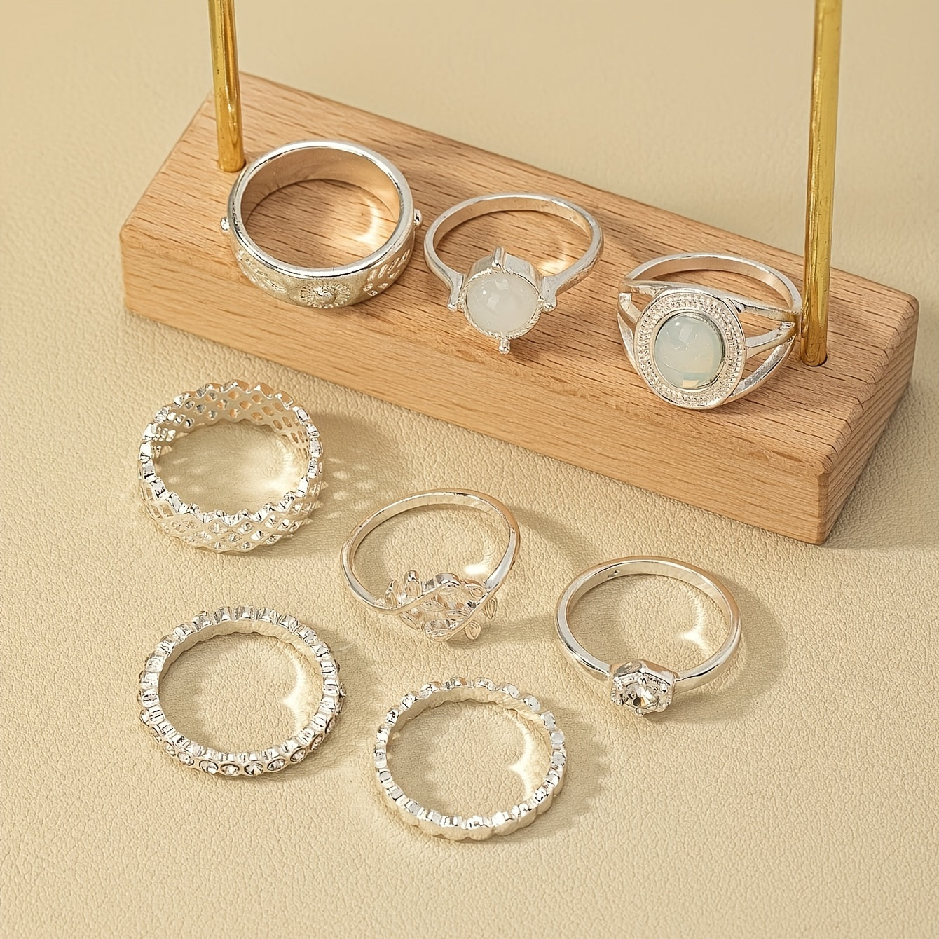 Add a touch of bohemian flair to your look with these delicate stacking rings. Featuring a mix of moonstone stones and intricate carving craftsmanship, these silver-plated rings are perfect for adding a unique and stylish touch to any outfit.