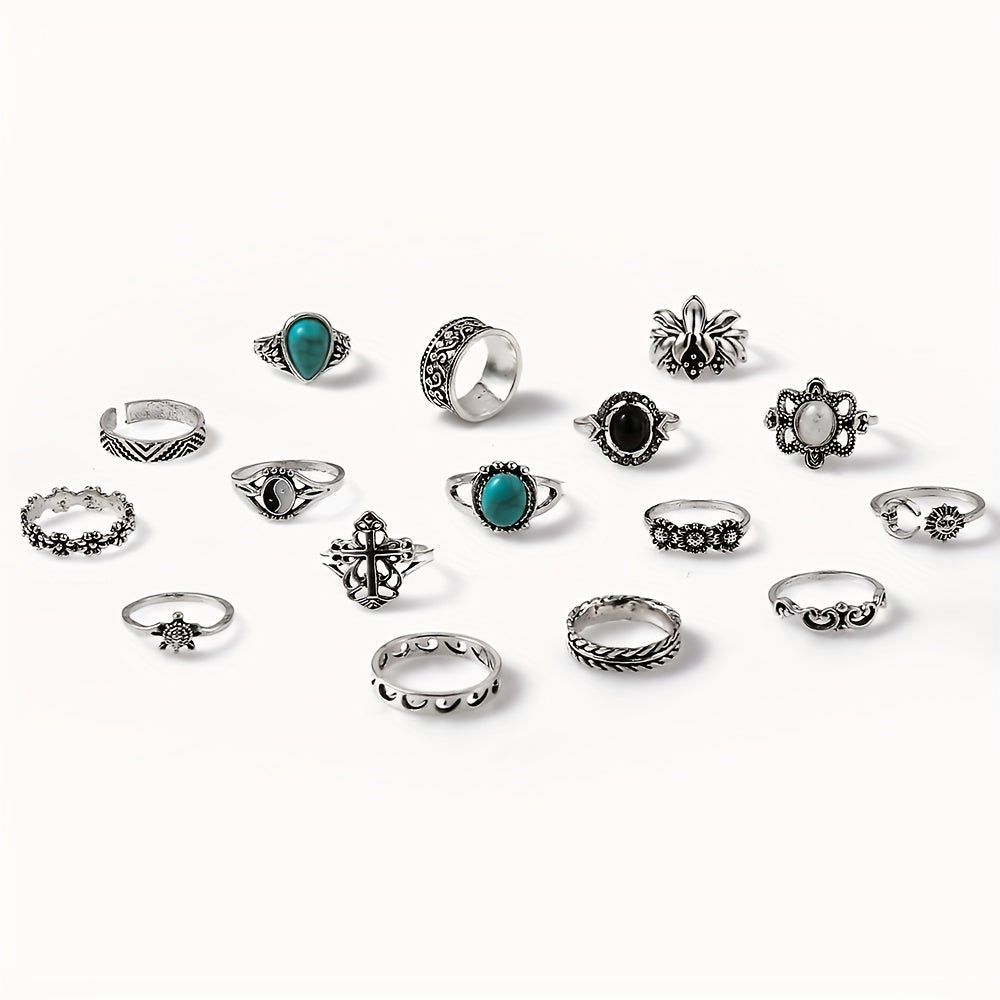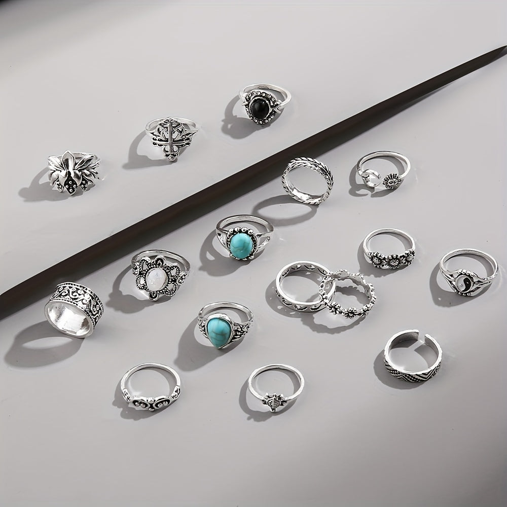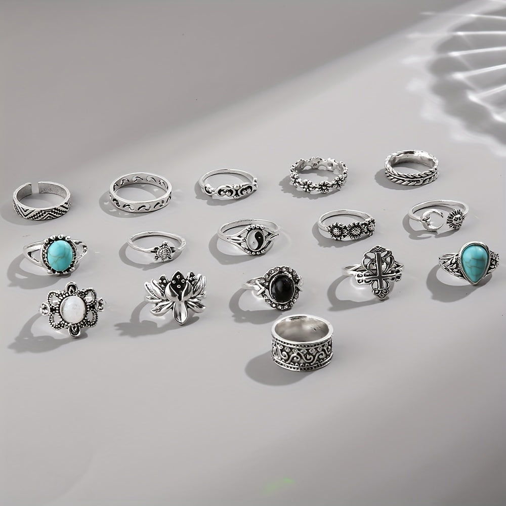 Enhance your daily outfits or party look with this set of 16 boho style rings featuring inlaid turquoise and various flower and yin yang patterns. Mix and match for a unique and stylish appearance.