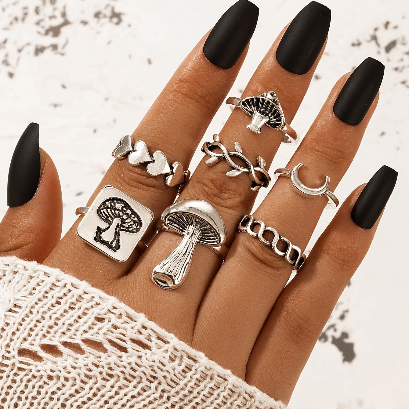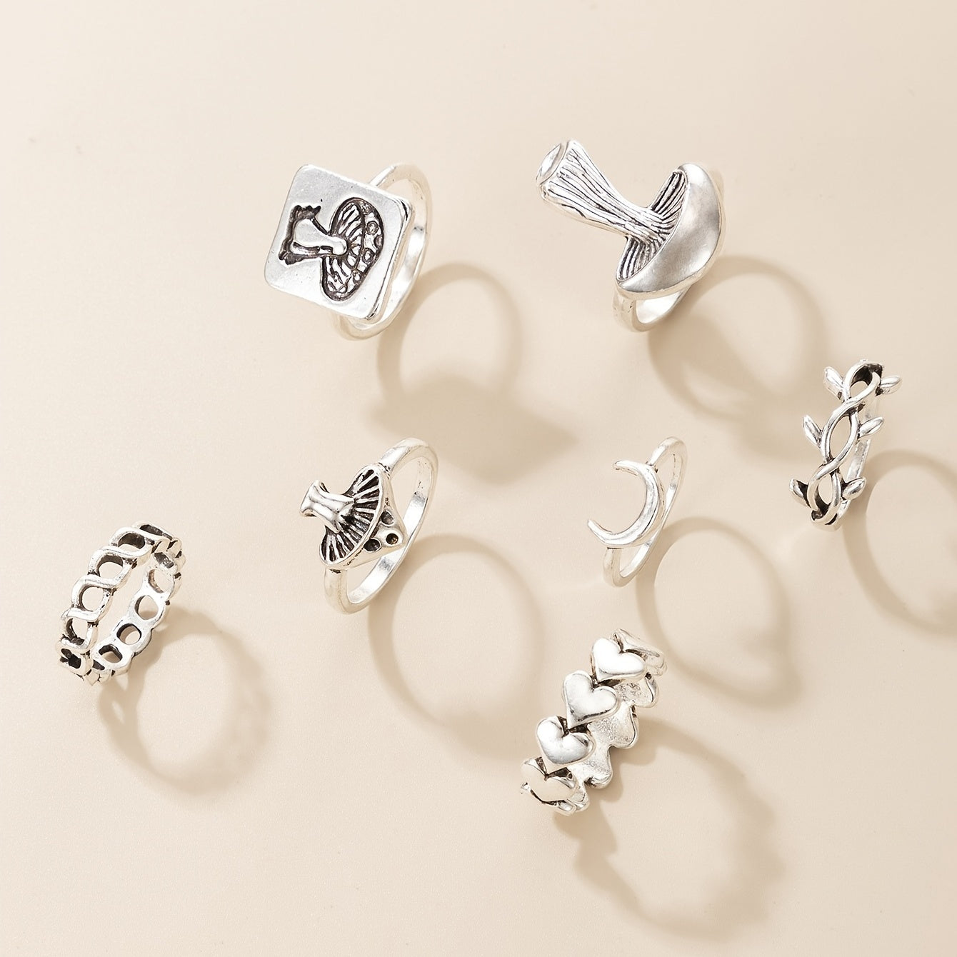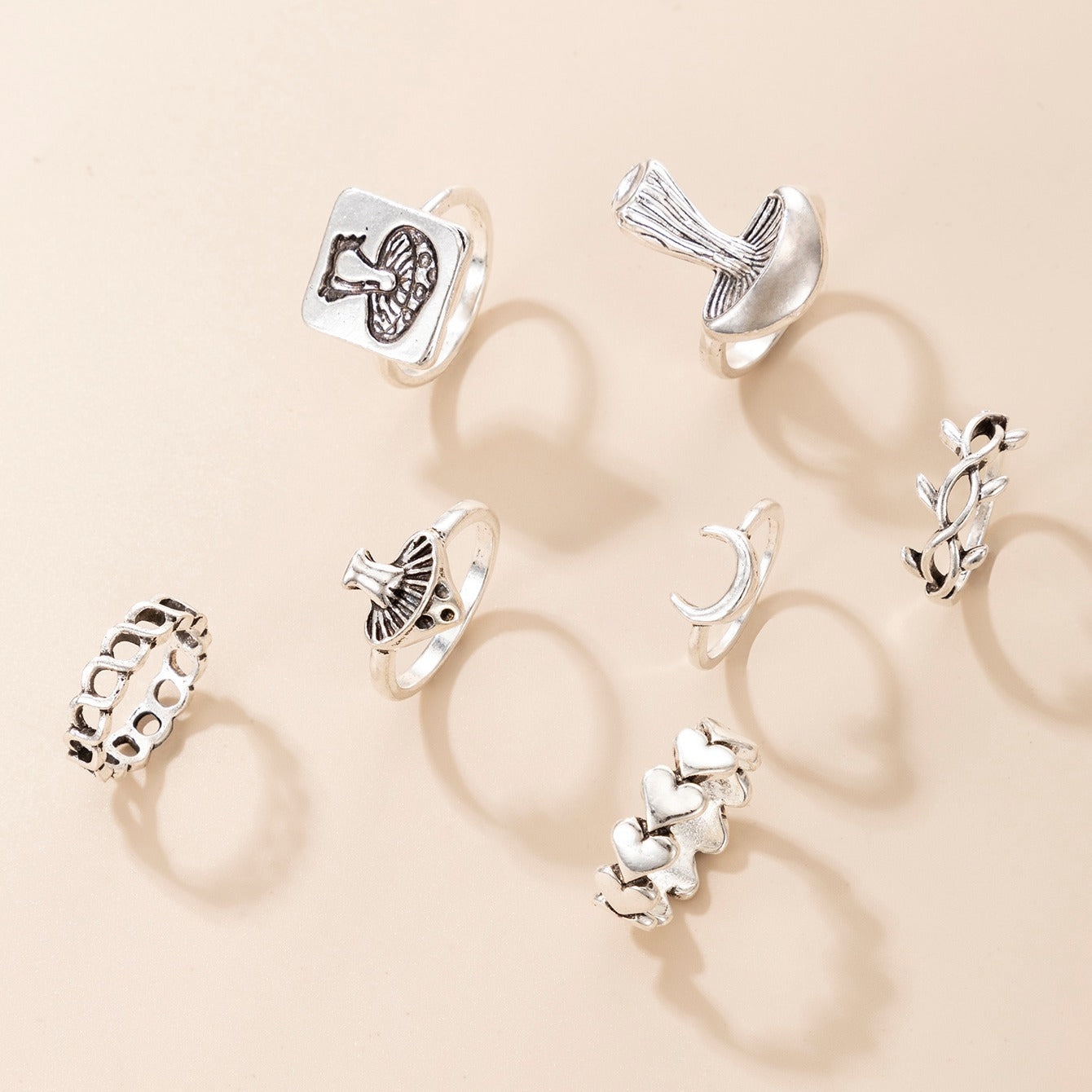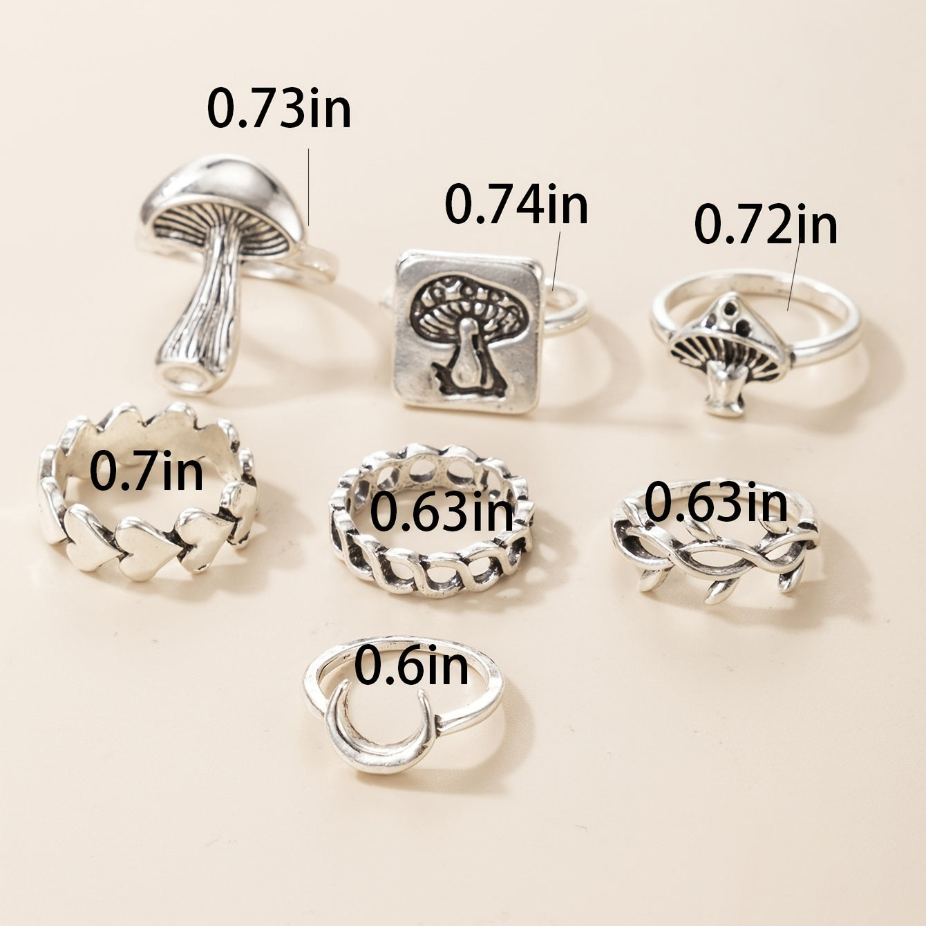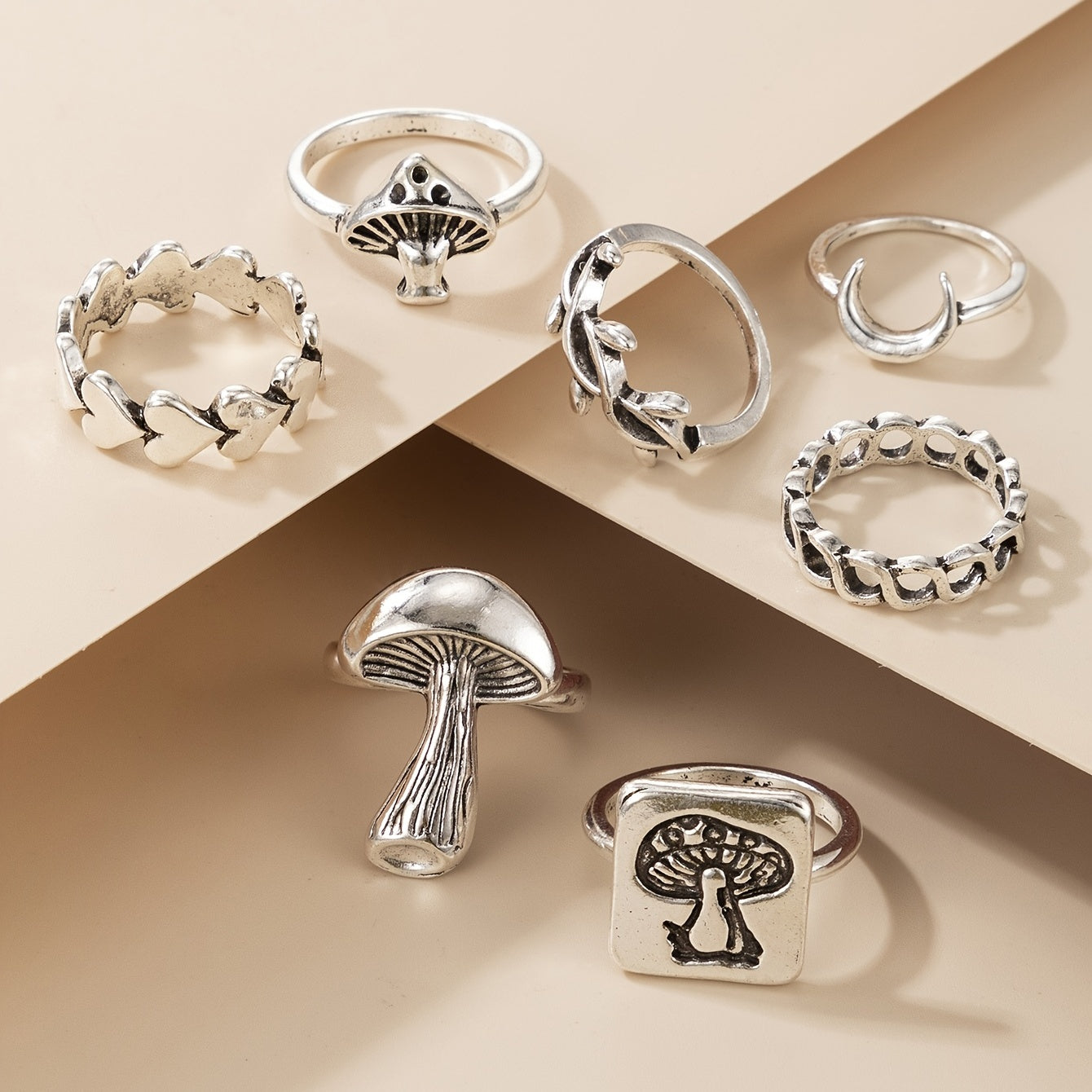 Add a touch of vintage boho charm to your style with this 7-piece stackable ring set featuring mushroom, heart, moon, and leaves patterns. Perfect for women and girls.