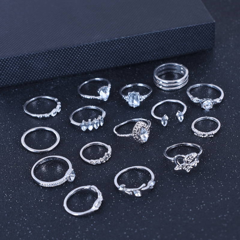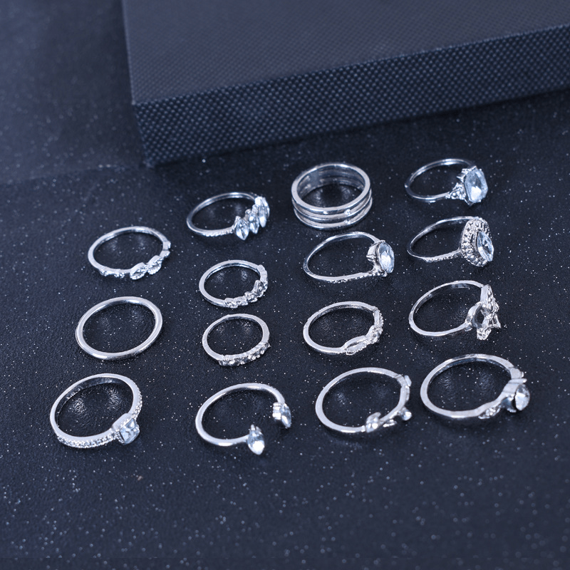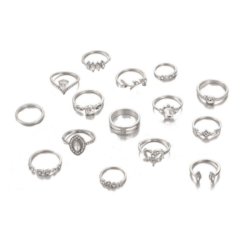 Add a touch of boho chic to your look with this set of 15 stacking rings featuring heart and vine shapes. Mix and match to create your own unique party accessory.