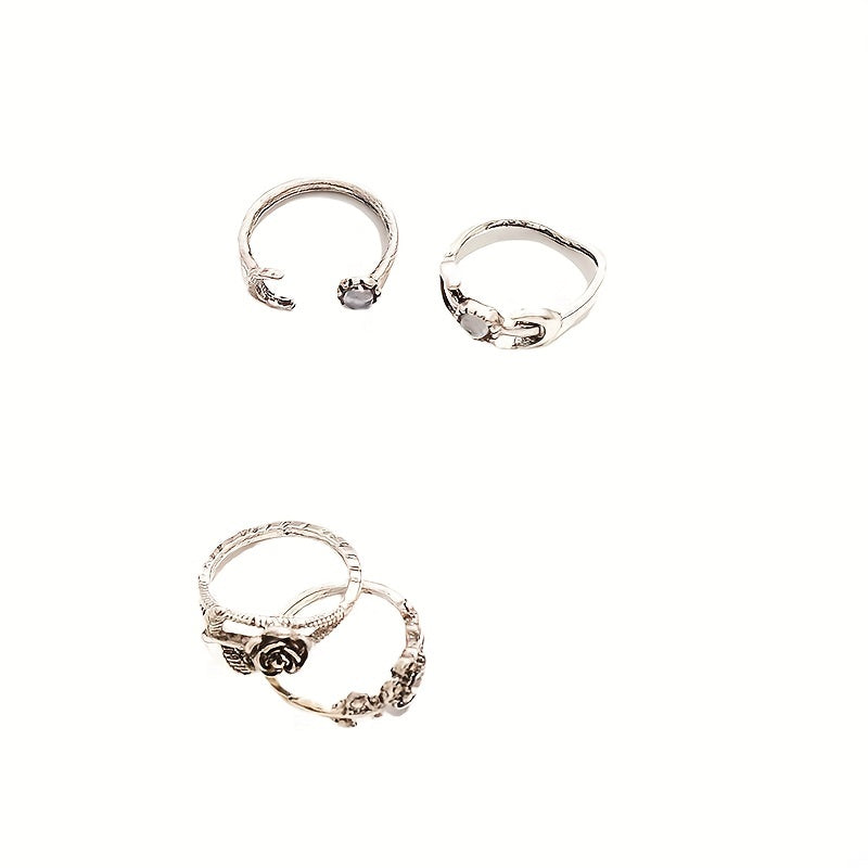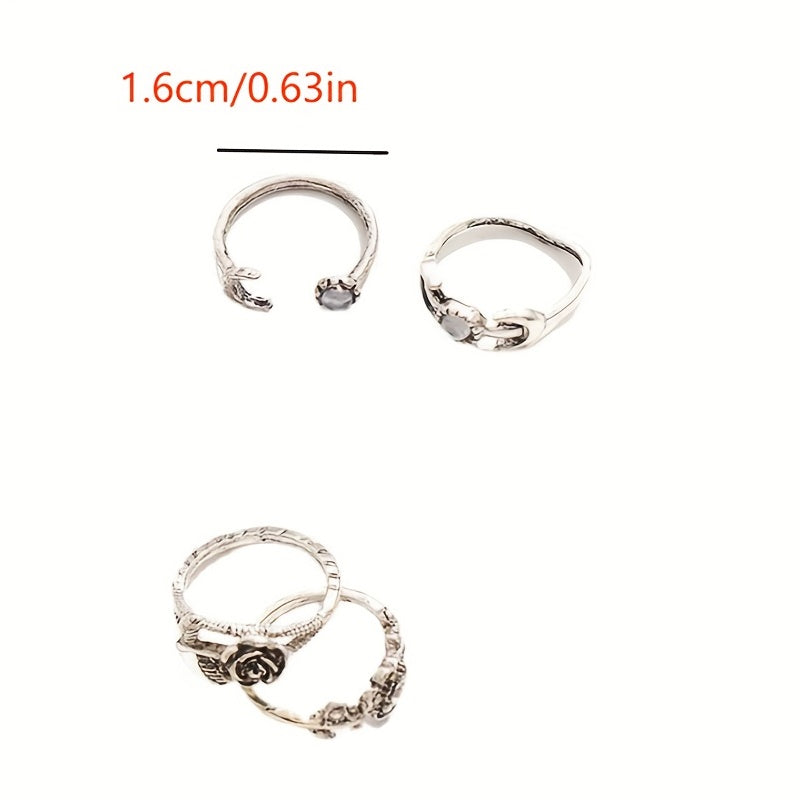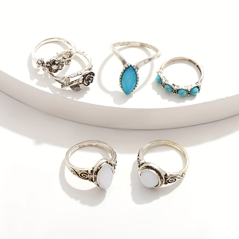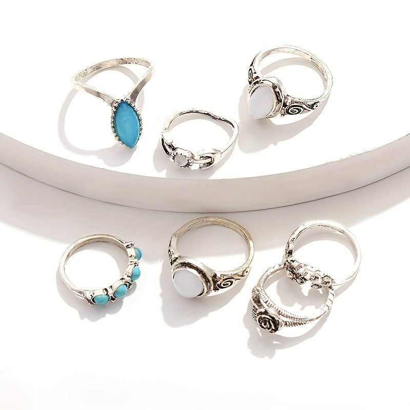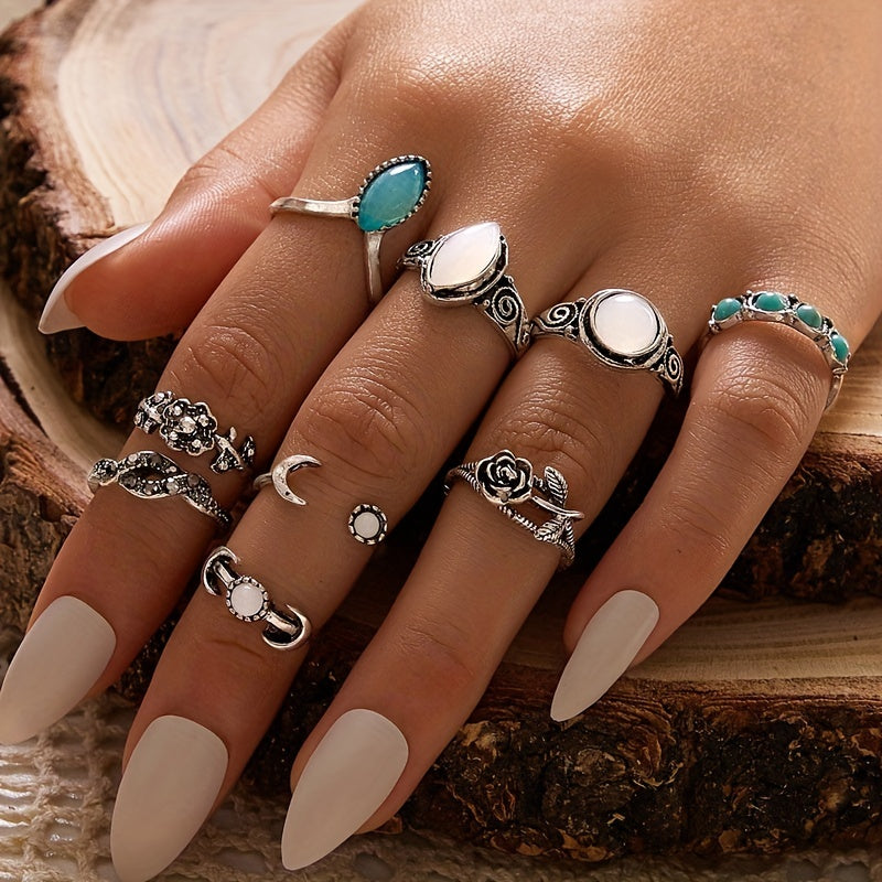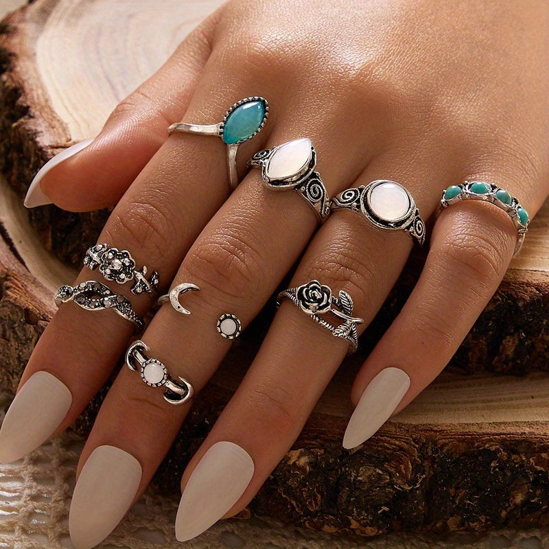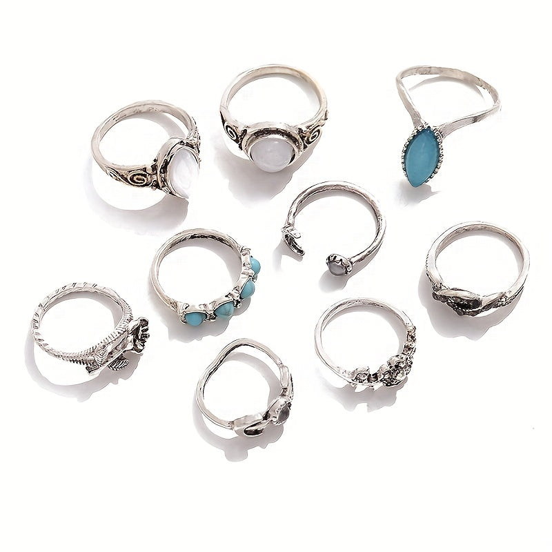 Elevate your daily outfits or party looks with this set of 9 boho style stacking rings. Each ring is silver plated and inlaid with oval turquoise, rose, and moon patterns, allowing you to mix and match for a unique and stylish touch.