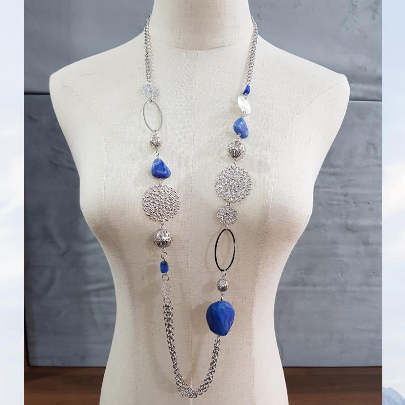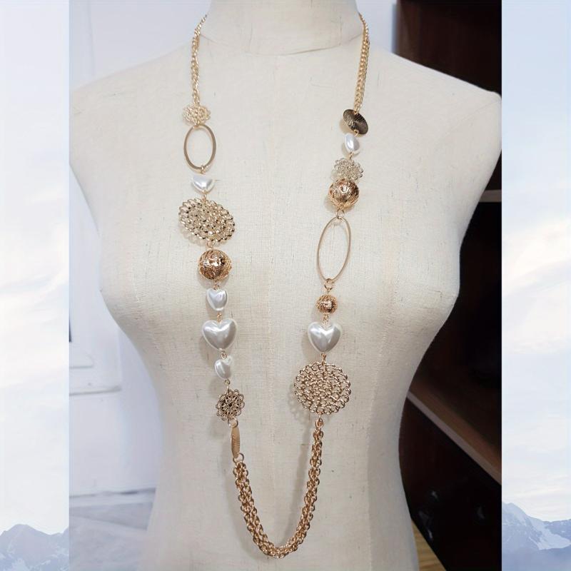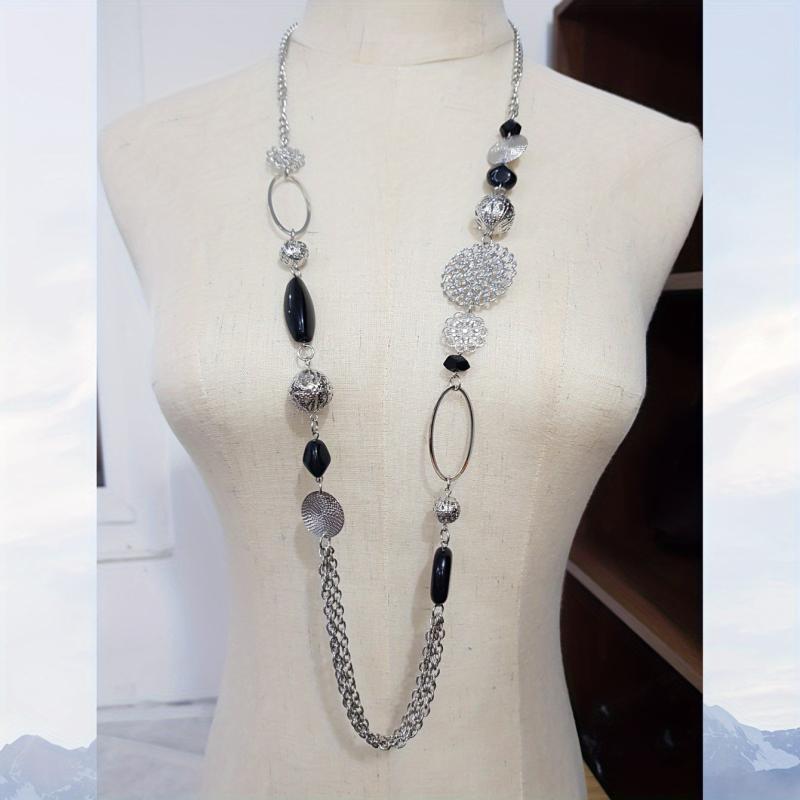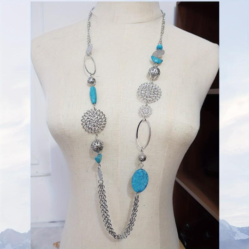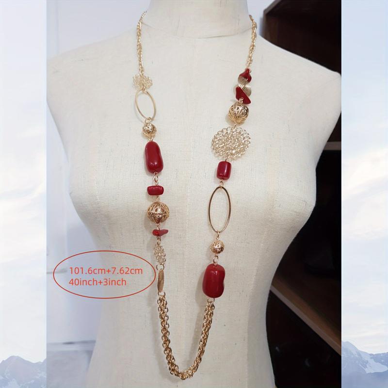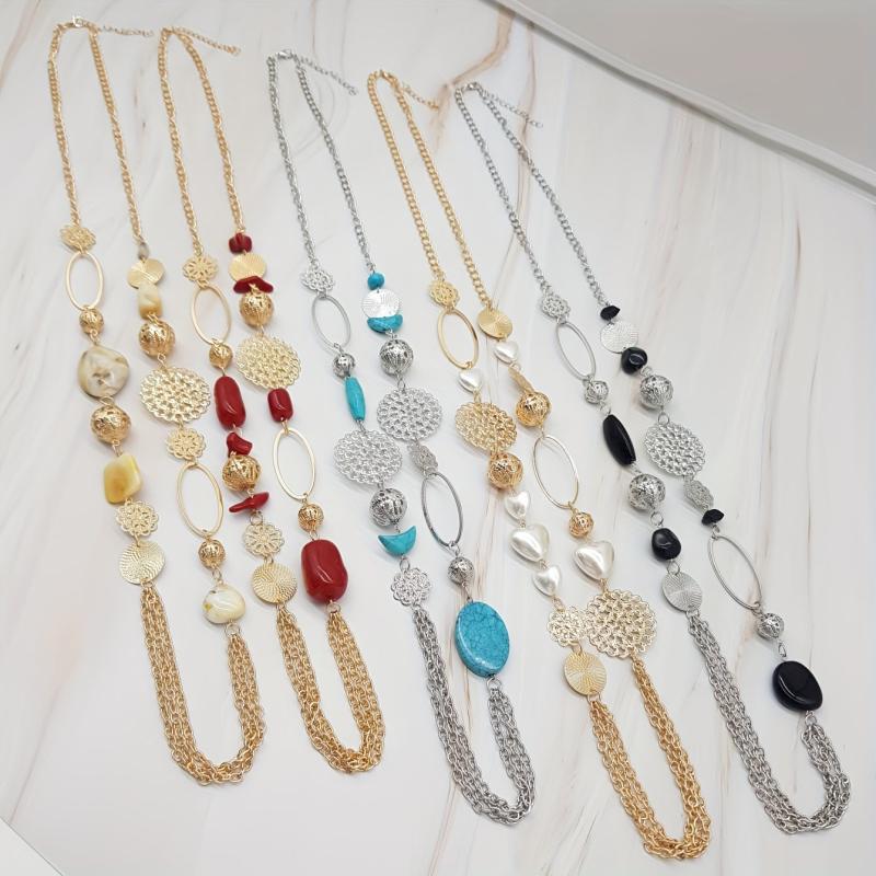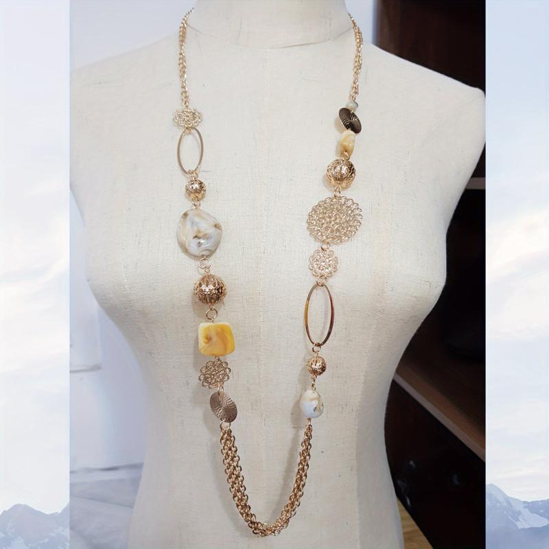 This vintage boho style sweater chain necklace features iron crafted hollow metal flower and colorful resin beads. It is the ideal fashion accessory for women.