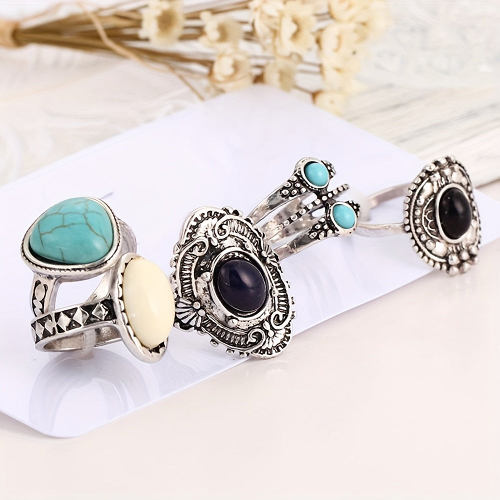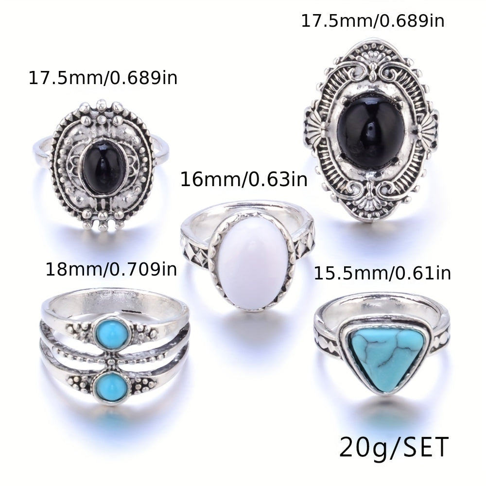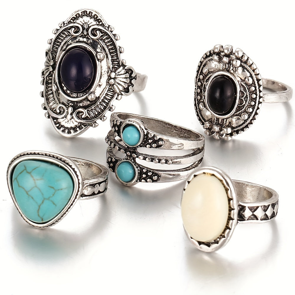 Elevate your outfit with this set of 5 boho style stacking rings featuring inlaid turquoise. Perfect for mixing and matching with your daily outfits or as dainty party accessories.