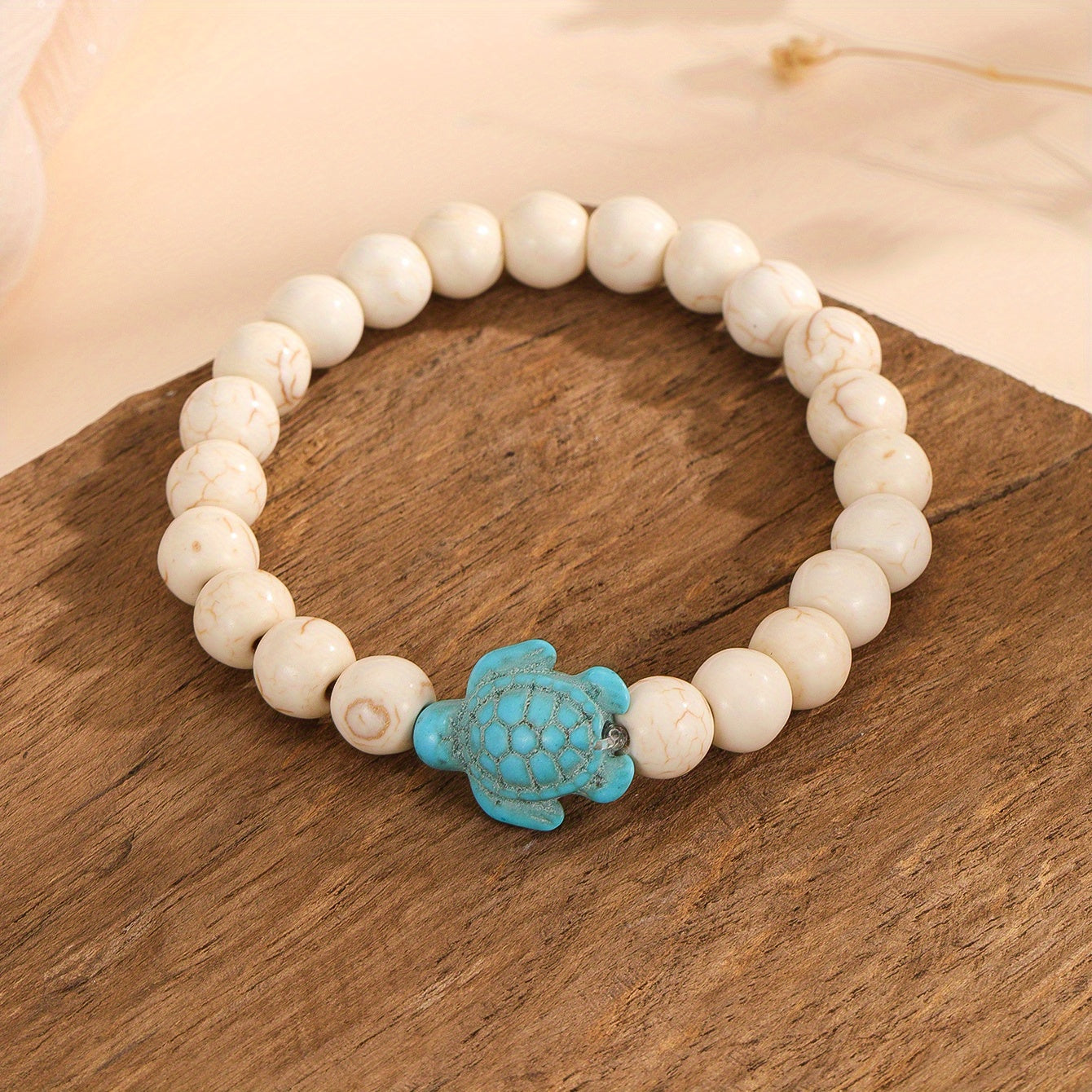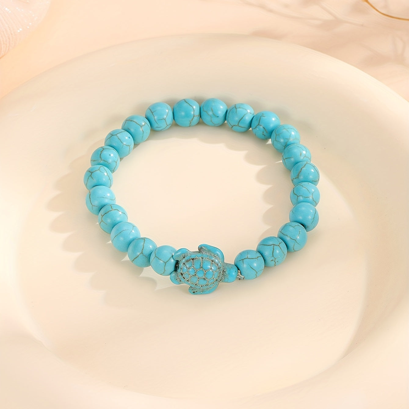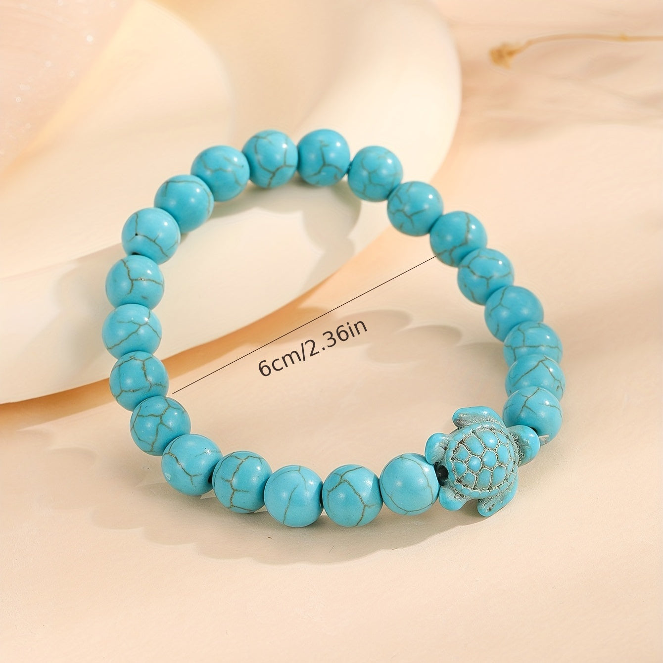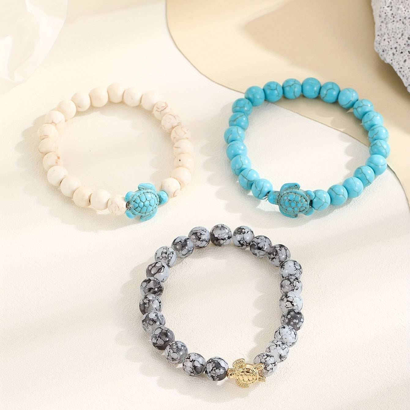 Enhance your beach look with this 3-piece set of boho ethnic style anklets featuring turquoise beads and turtle charms. The stretch design ensures a comfortable fit.