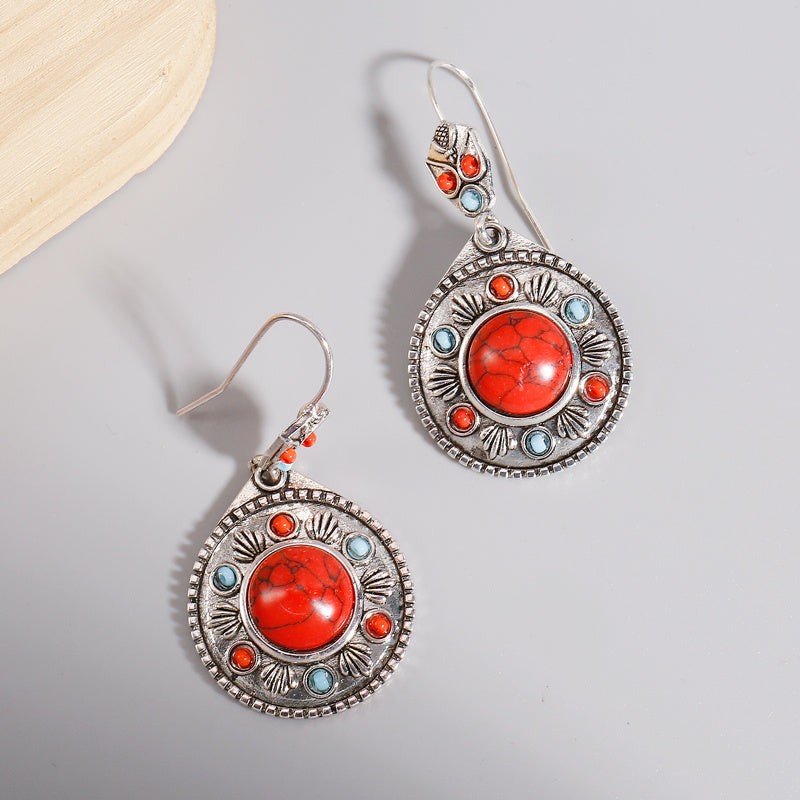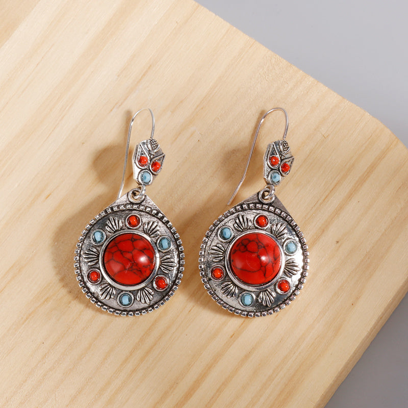 These round metal pendant earrings feature inlaid synthetic gems, perfect for adding a touch of vintage charm to your outfit. Ideal for parties and boho style lovers.