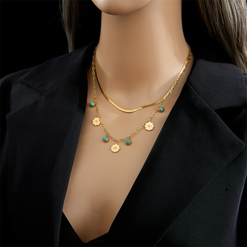This necklace features a beautiful flower turquoise resin pendant on a double stainless steel chain. Perfect for daily wear and a great gift idea.