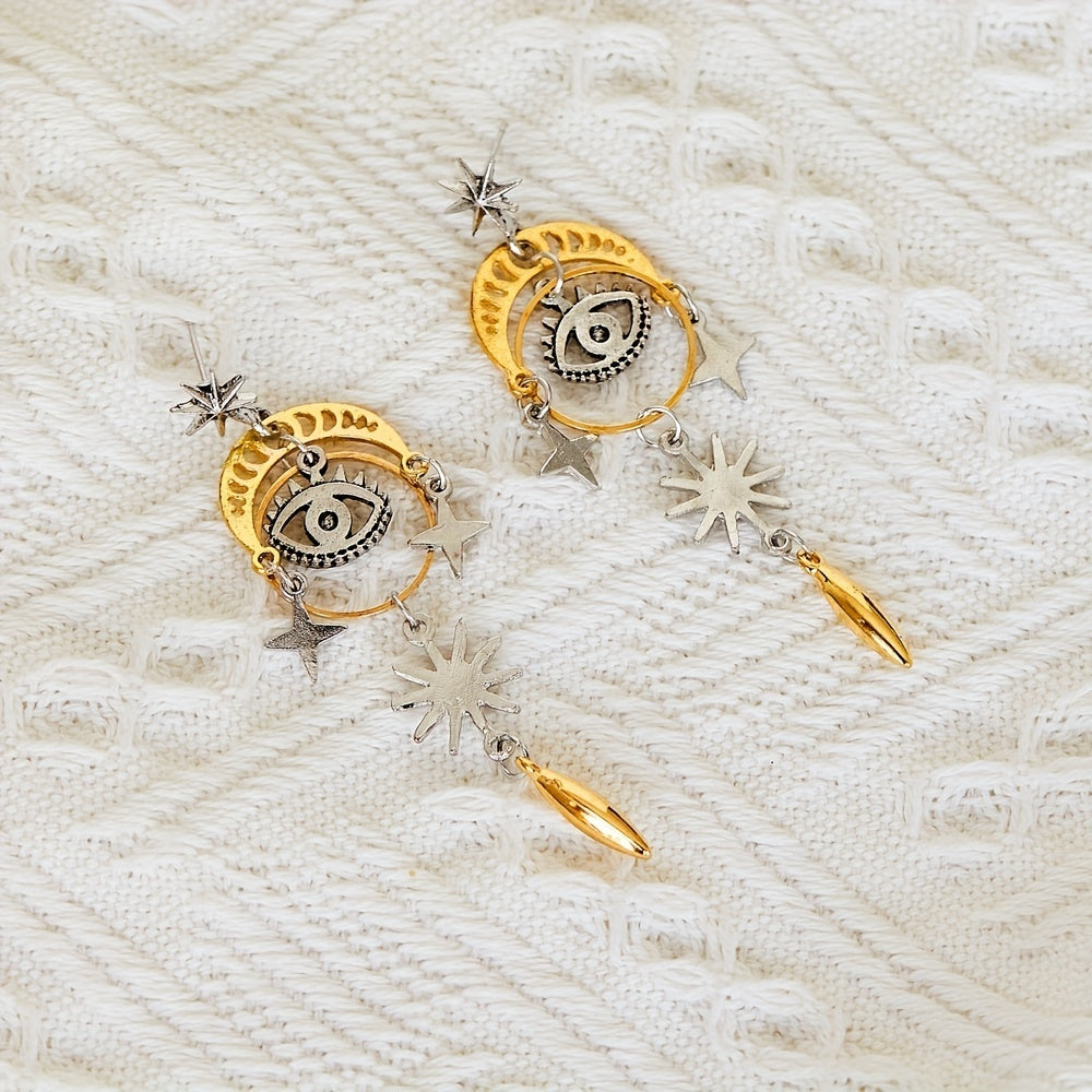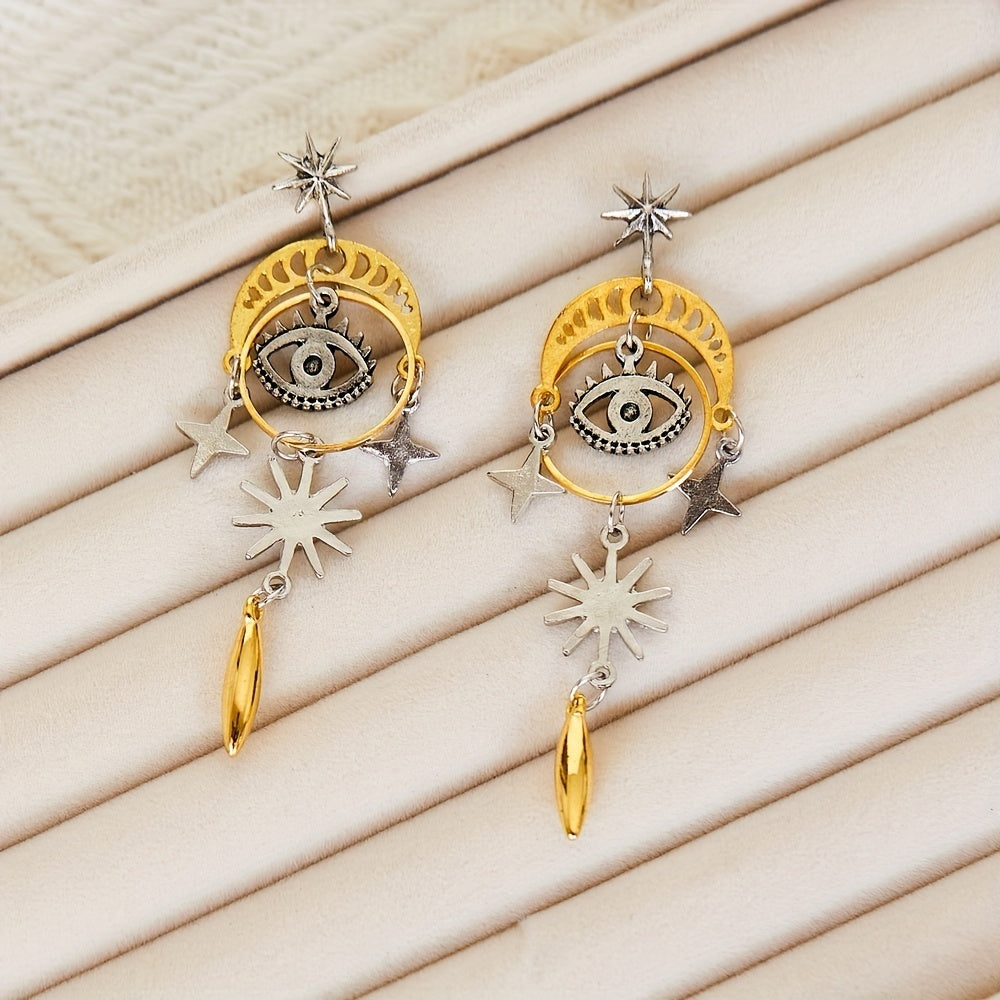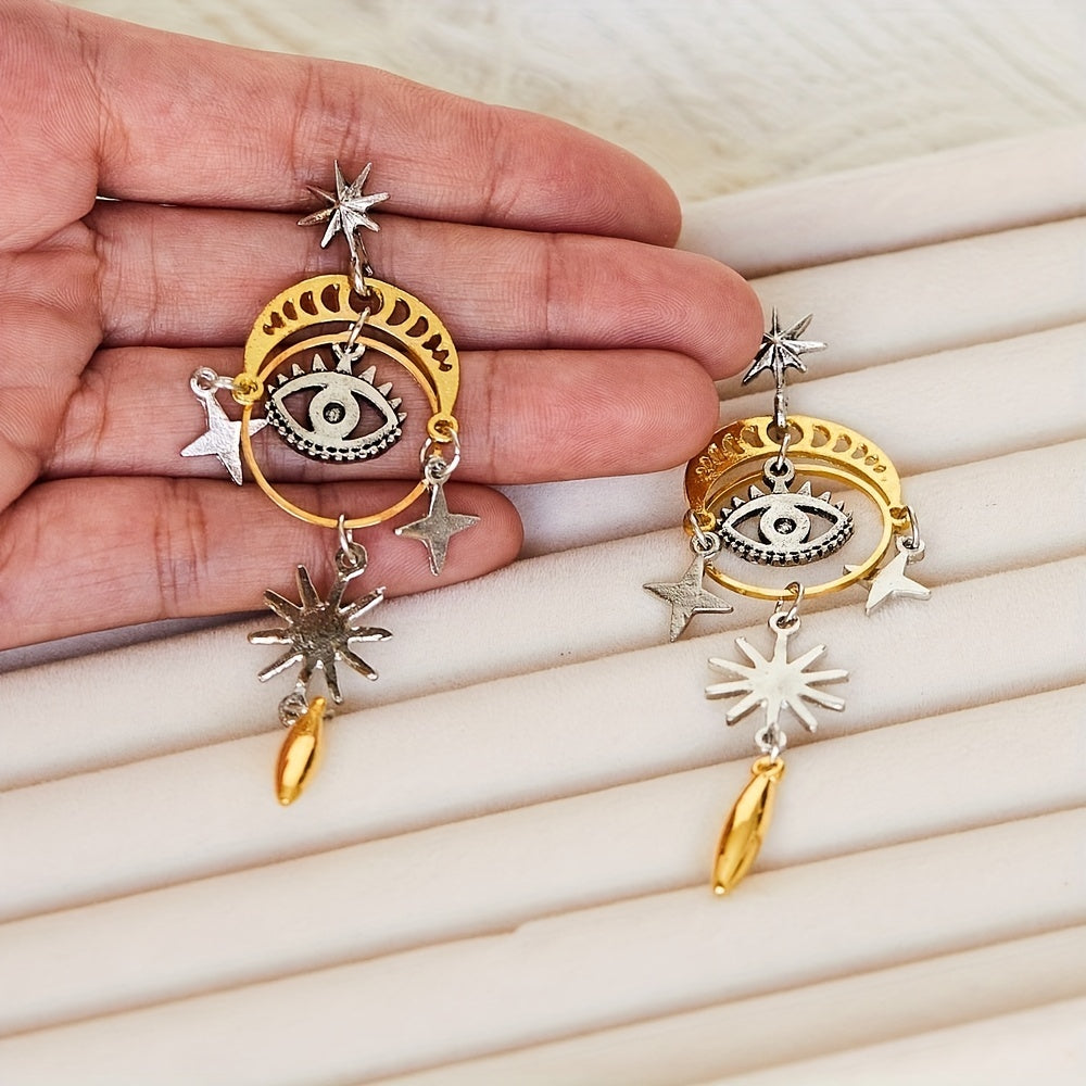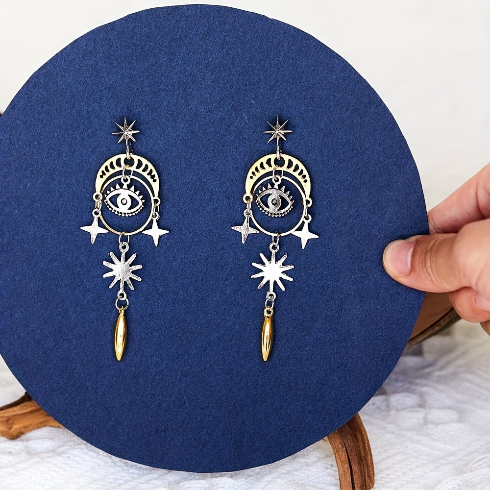 Beautiful boho vintage earrings featuring a hollow out star moon eye pattern. Made of high-quality alloy, these earrings are a creative gift for women and girls.
