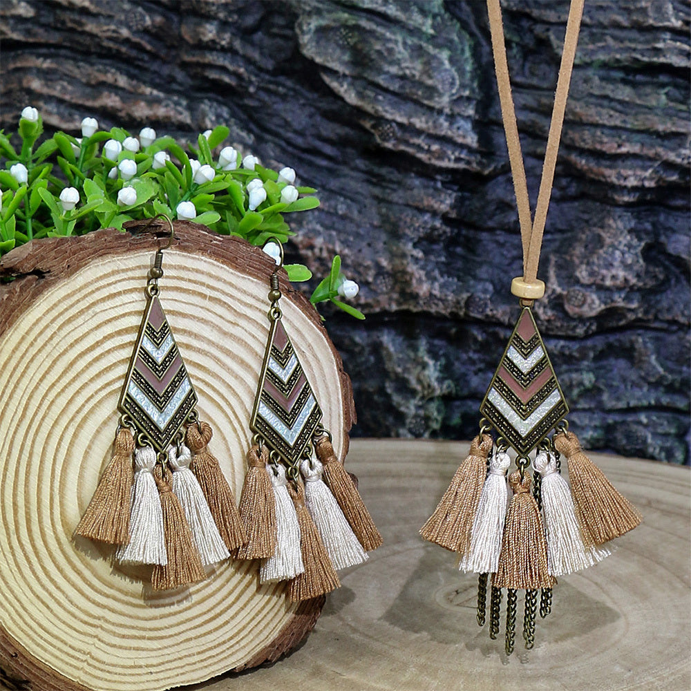 Enhance your bohemian look with this 3-piece jewelry set featuring earrings and necklace with ethnic design.