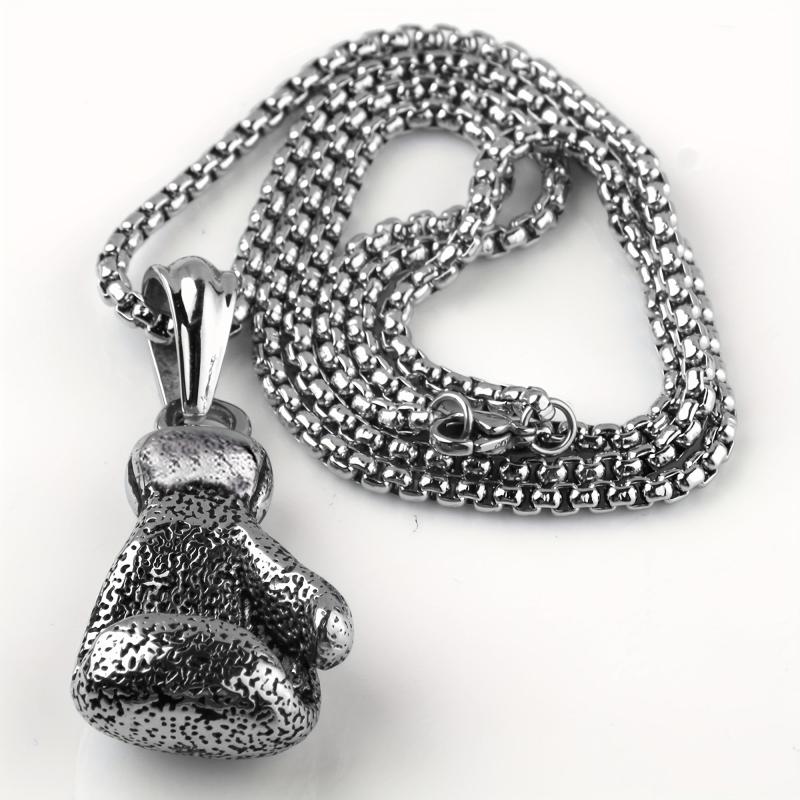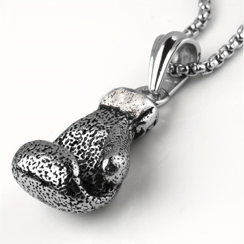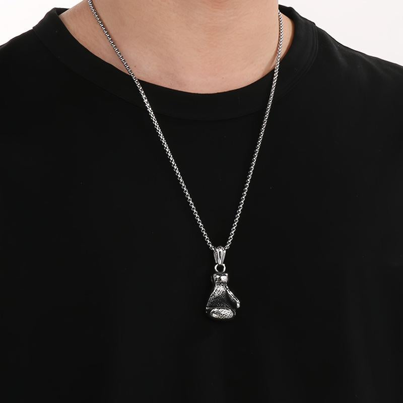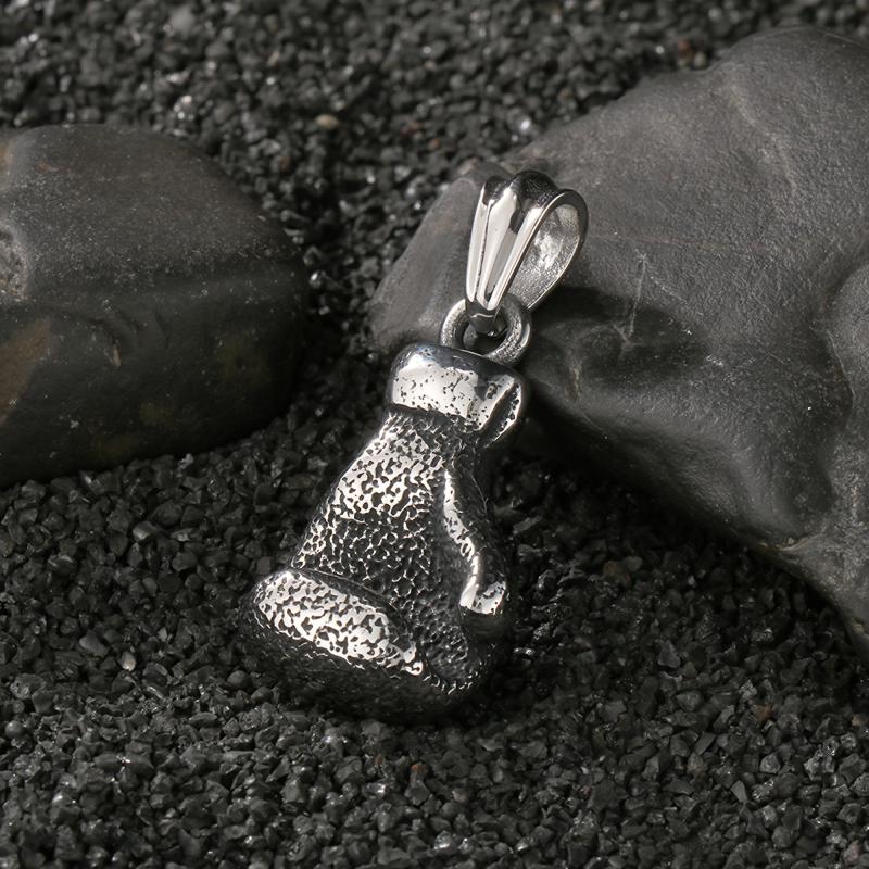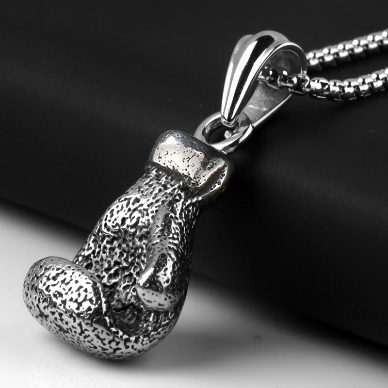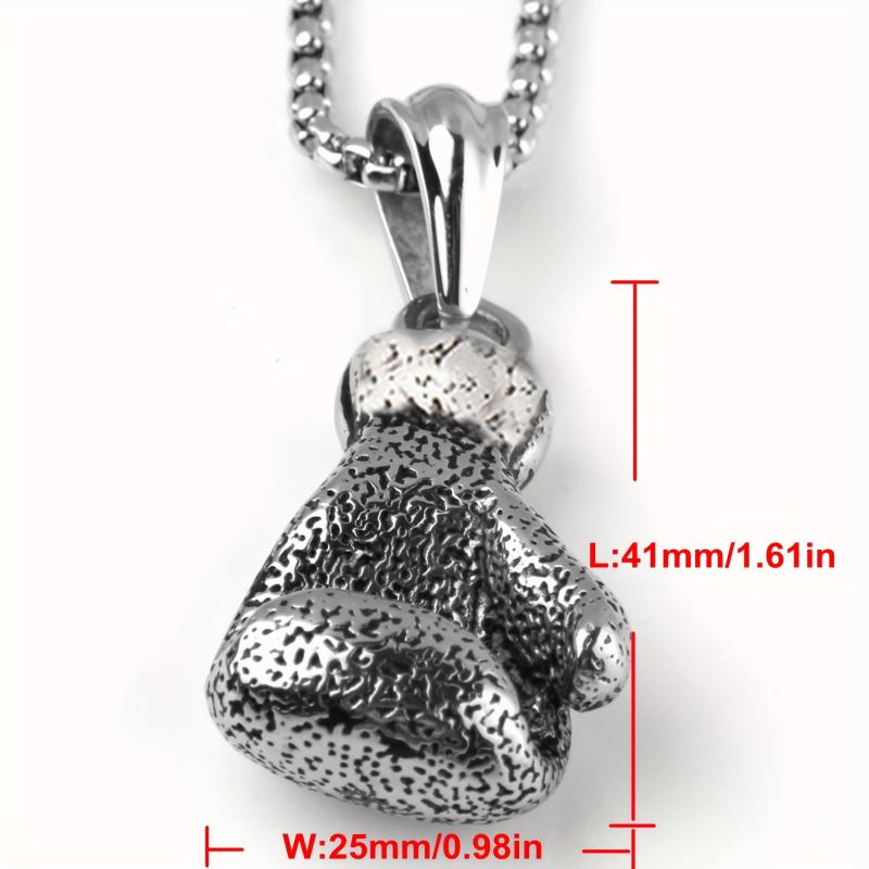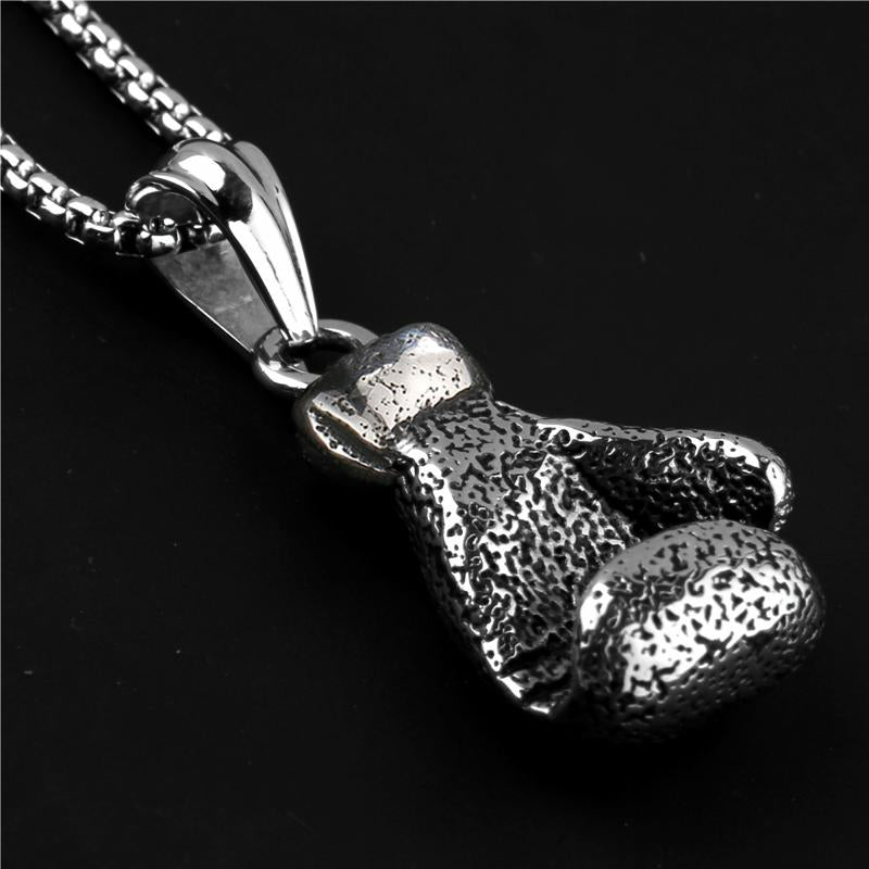 This stainless steel pendant features boxing gloves, making it a perfect accessory for boxing enthusiasts.