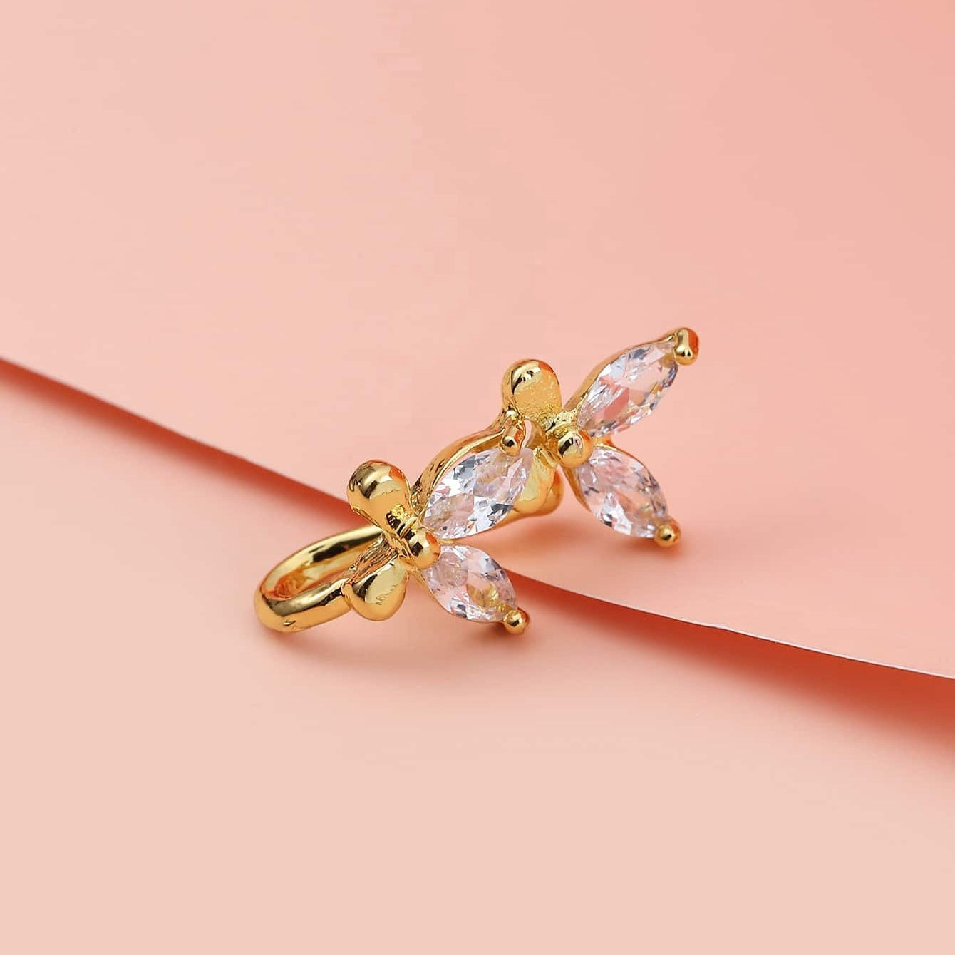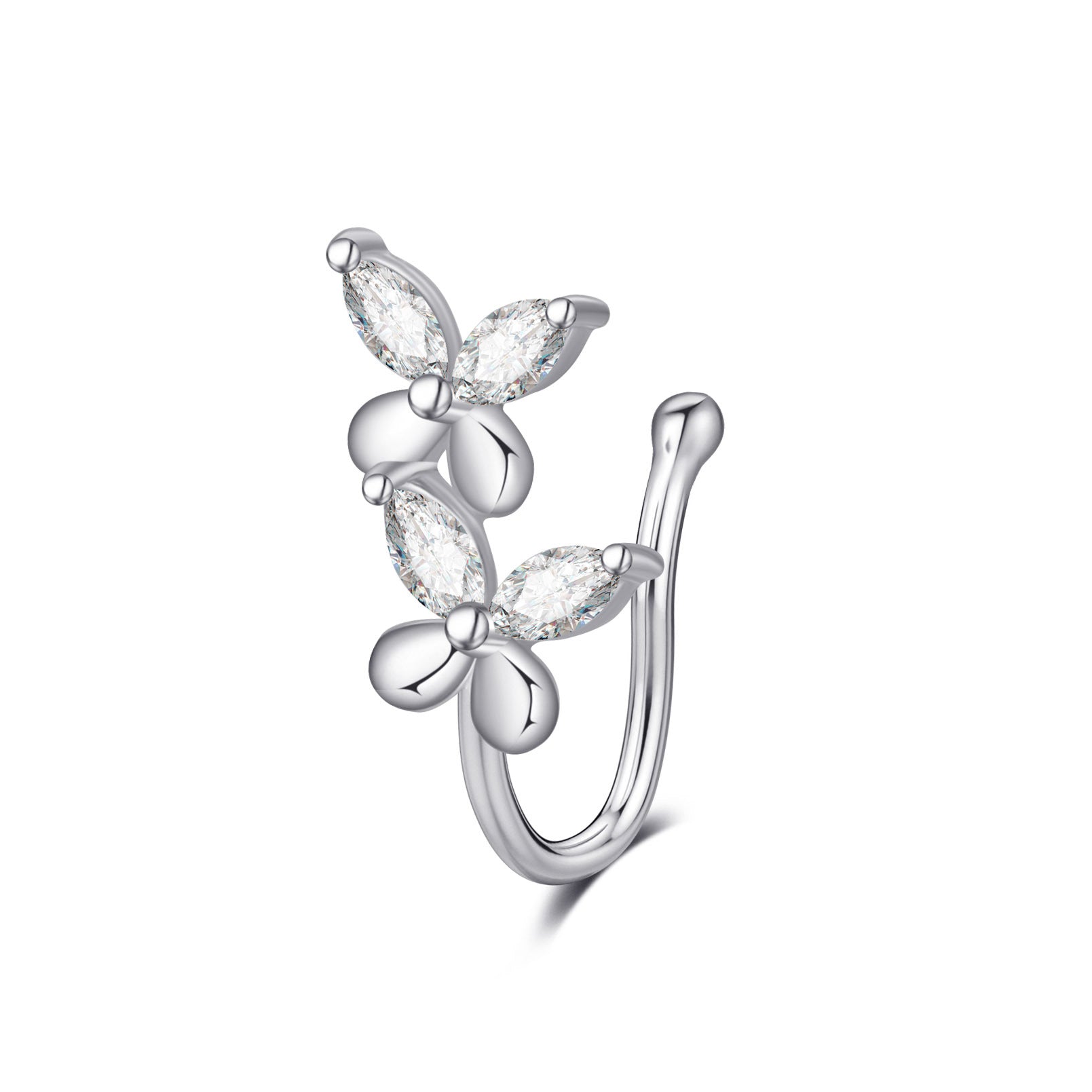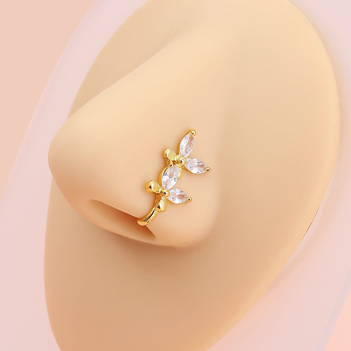 This beautiful nose clip features a charming double butterfly design with brass inlay and zircon accents.