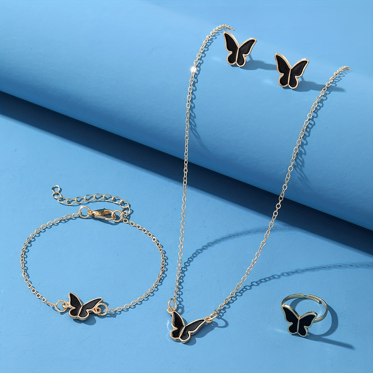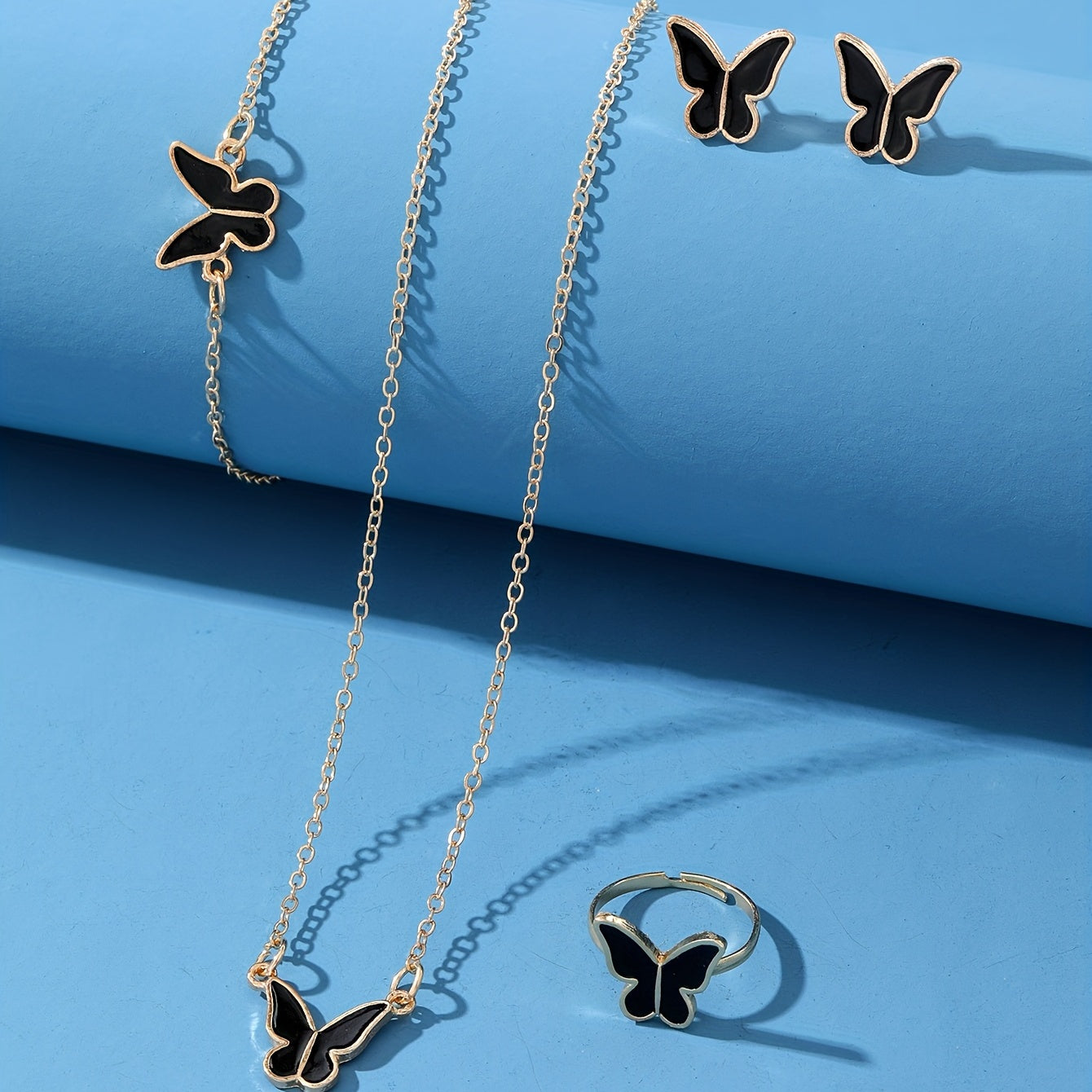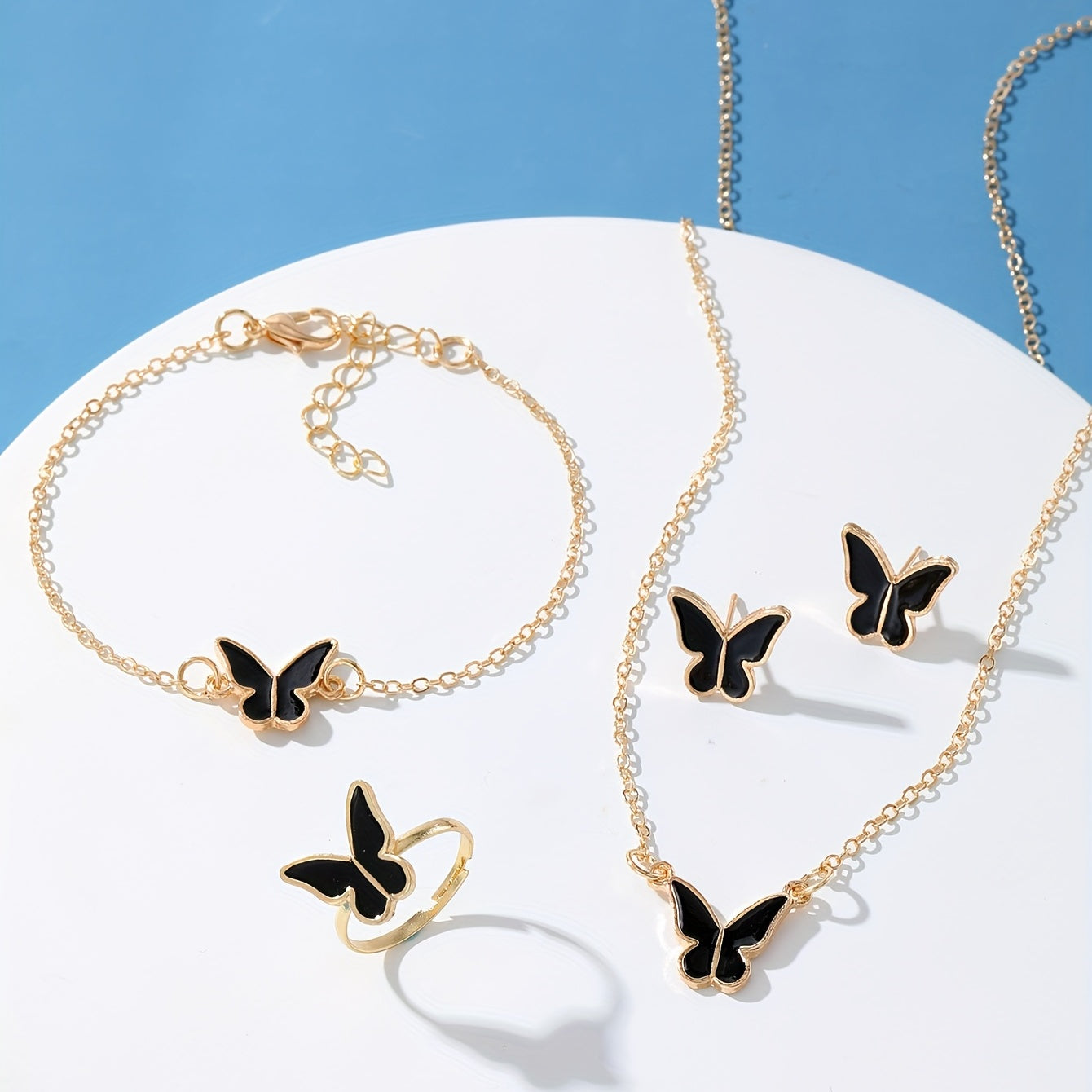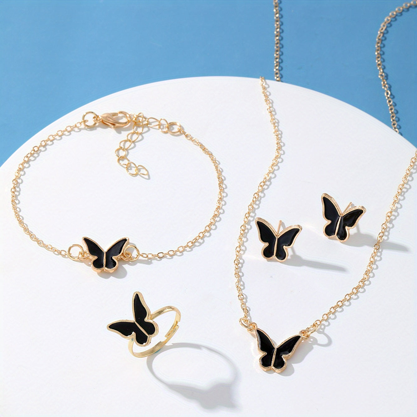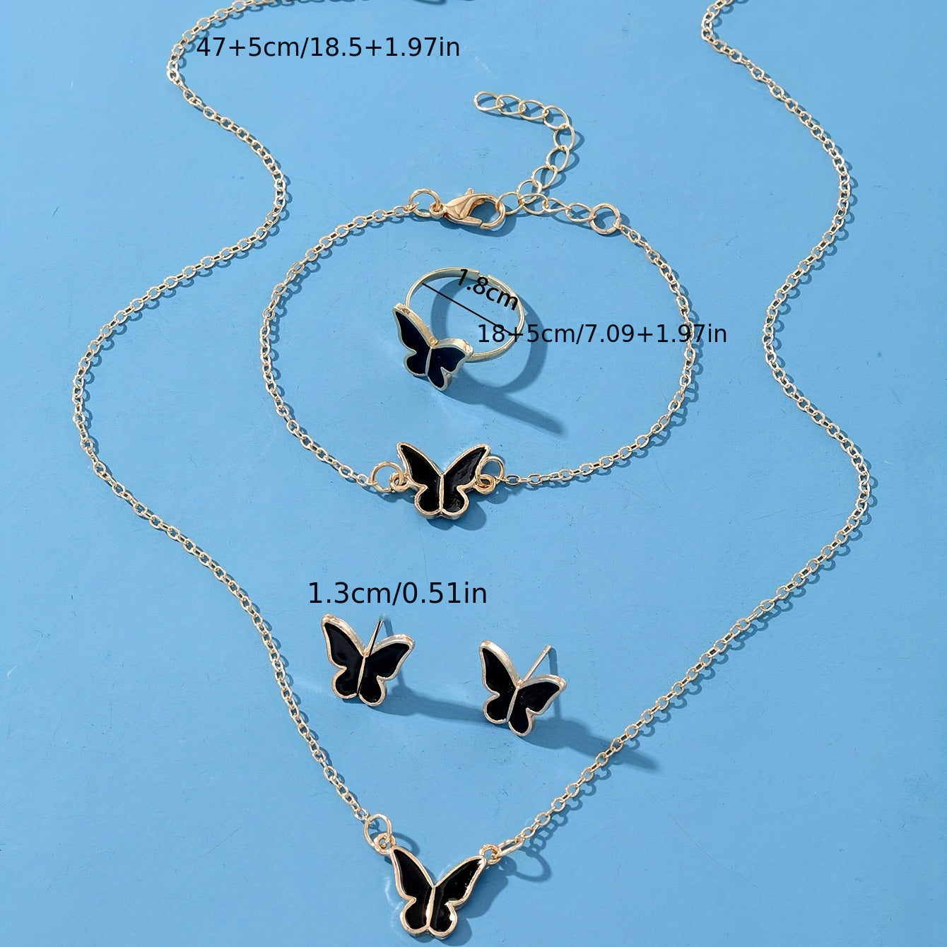 Adorn yourself with this stylish butterfly jewelry set featuring a ring, earrings, bracelet, and necklace. Perfect for women and girls looking to add a touch of elegance to their outfit.