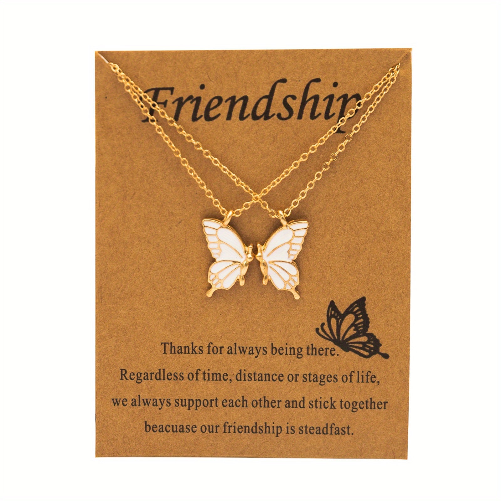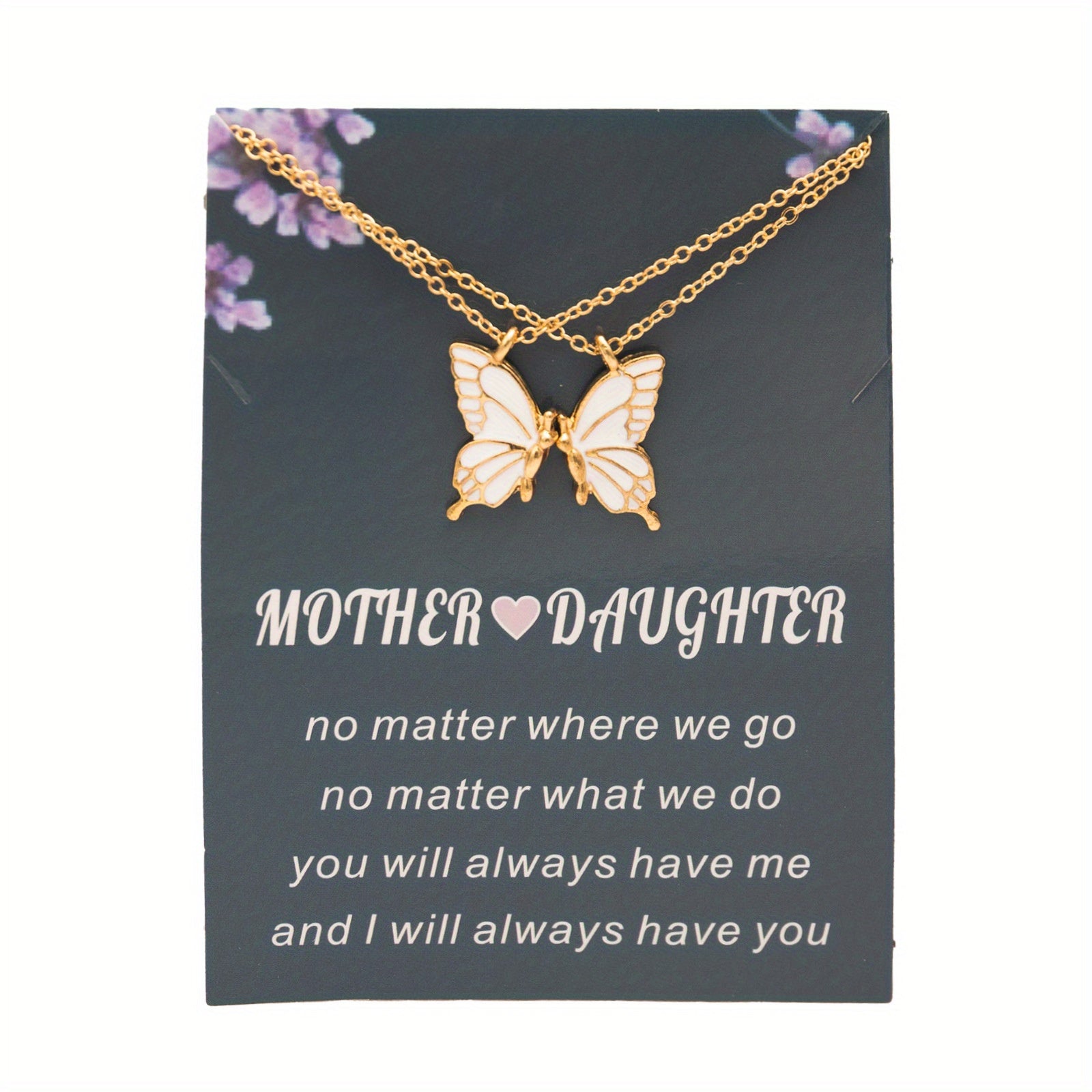 This set includes 2 butterfly pendant necklaces with a good friendship card. Perfect way to show your bond with your child.