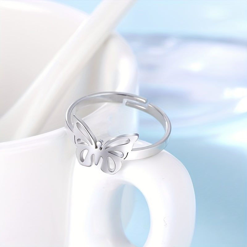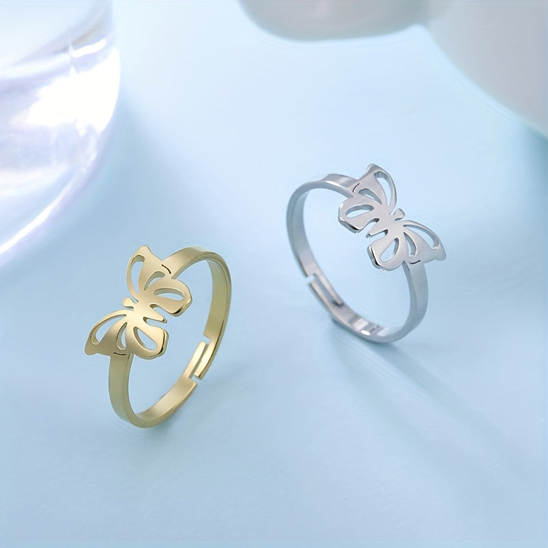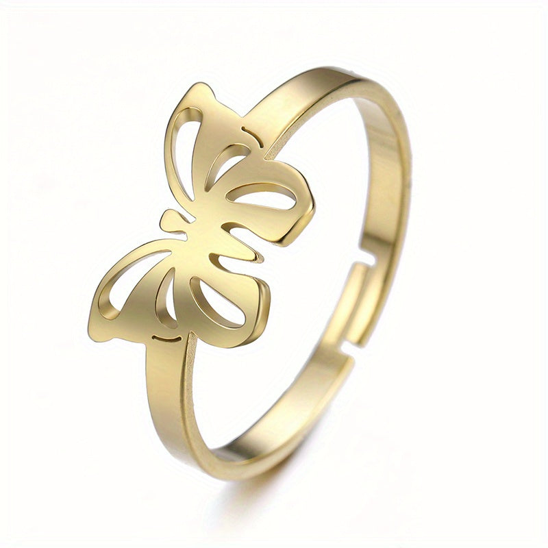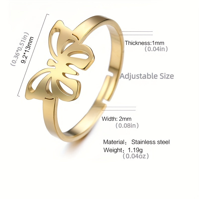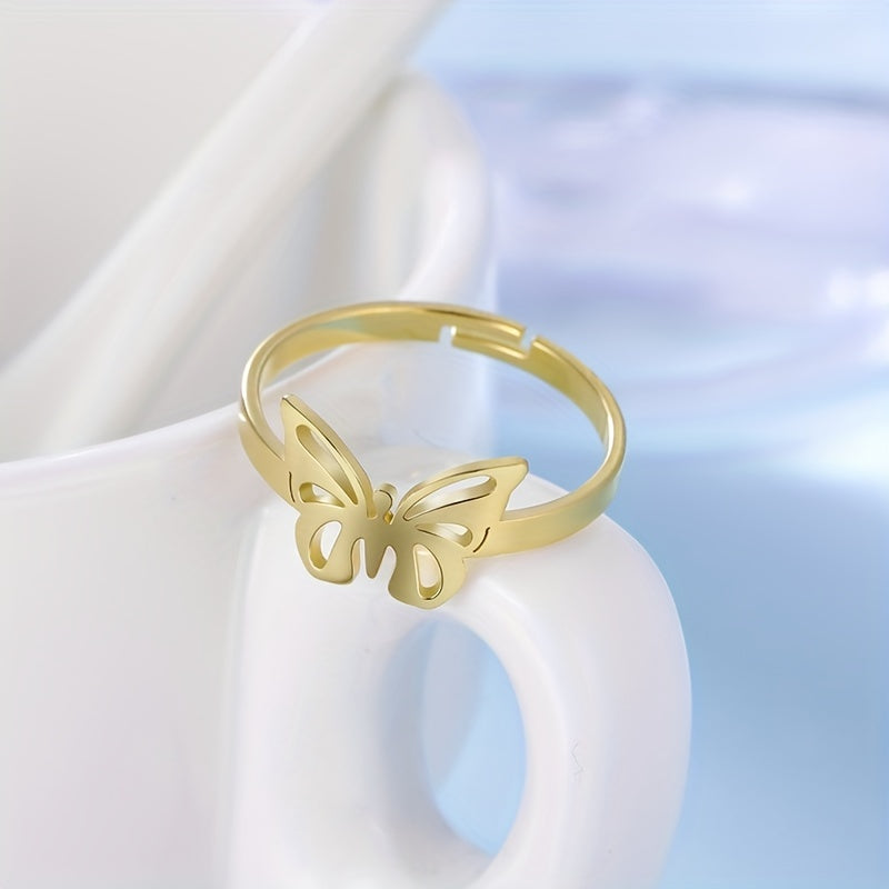 Elegant butterfly ring made of 18k gold plated material, perfect for parties or daily wear. Adjustable design for a comfortable fit.