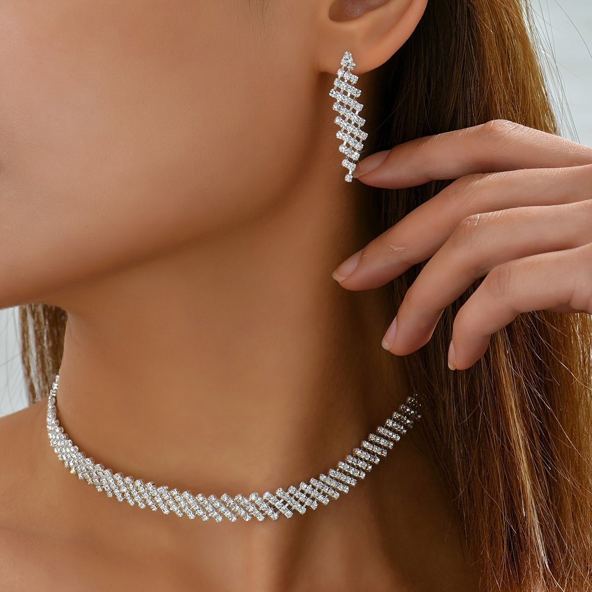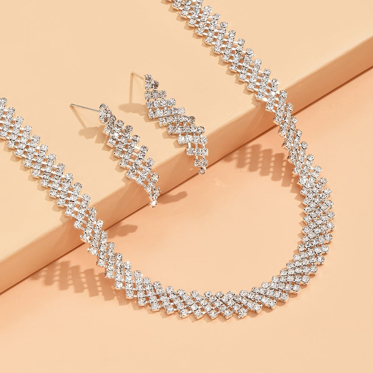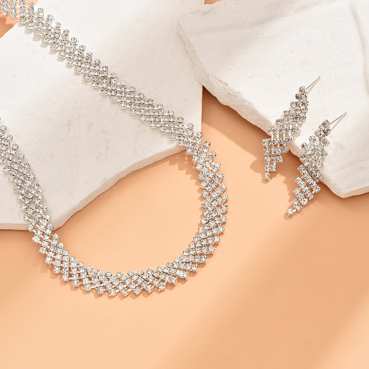 Elegant rhombus shape rhinestone jewelry set perfect for weddings and parties. Includes necklace and earrings.
