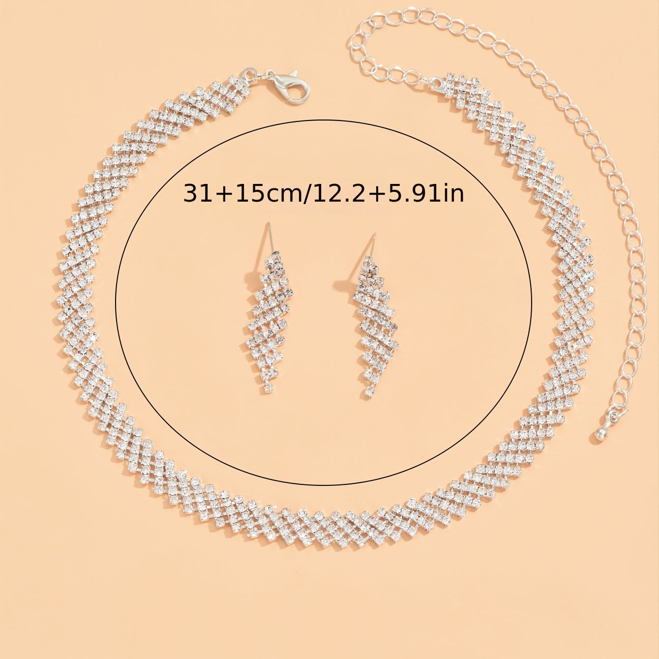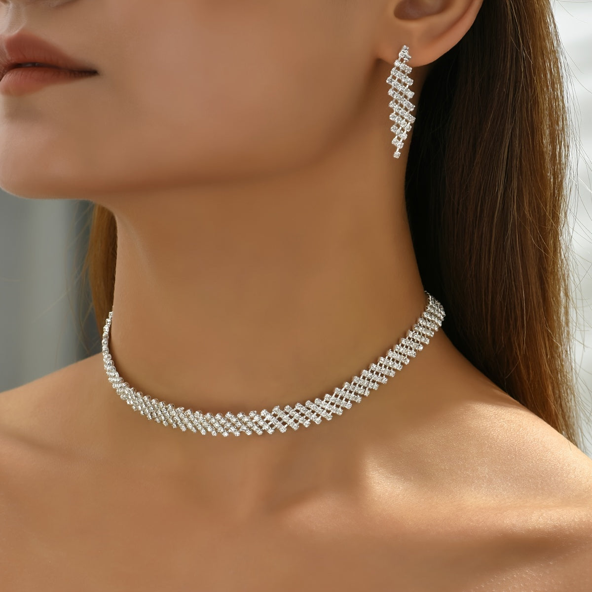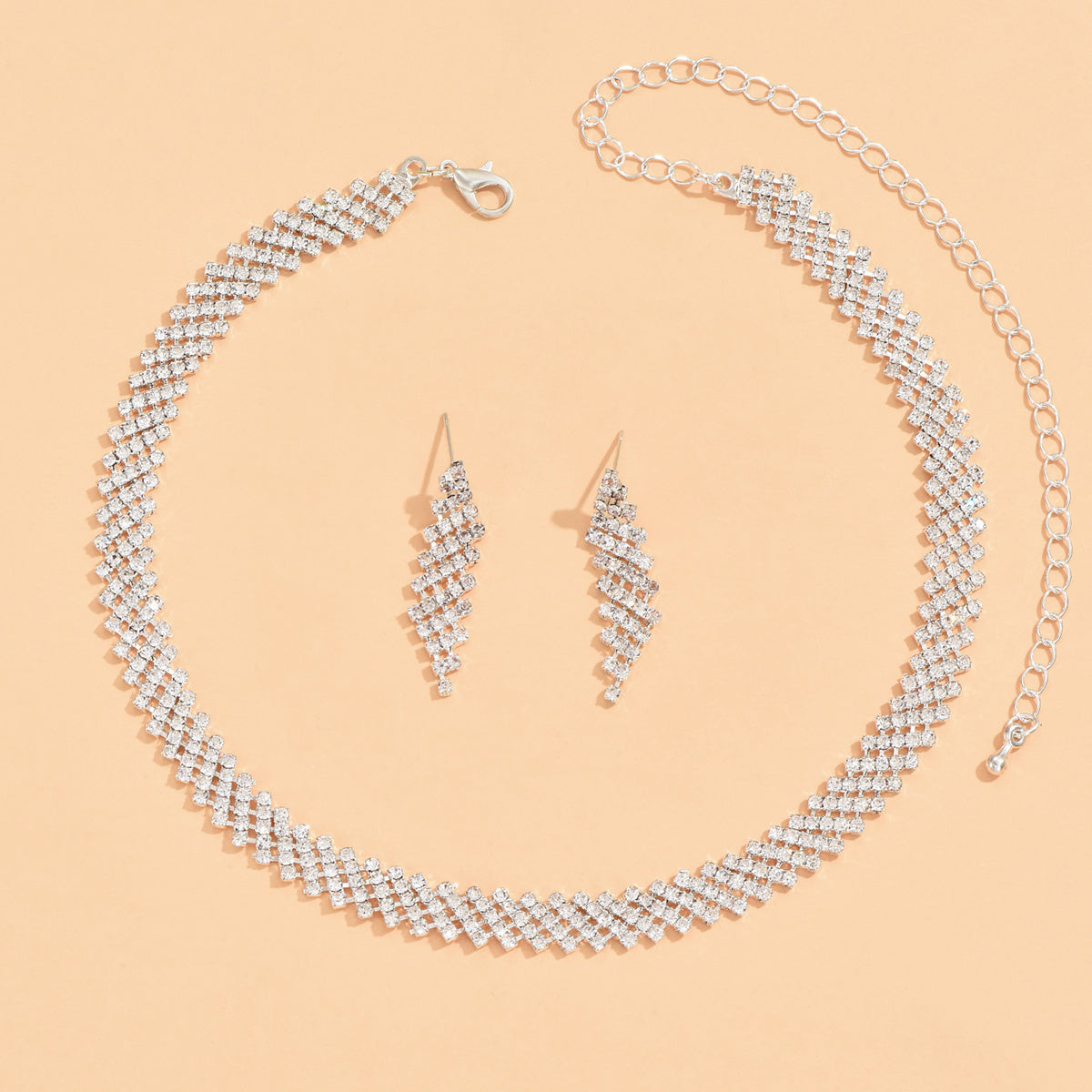 Elegant rhombus shape rhinestone jewelry set perfect for weddings and parties. Includes necklace and earrings.