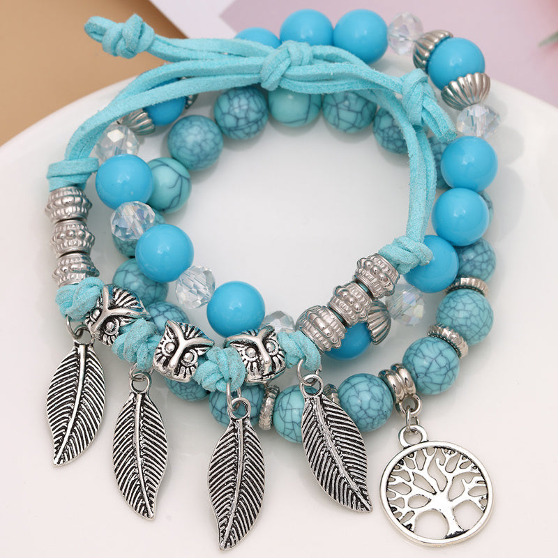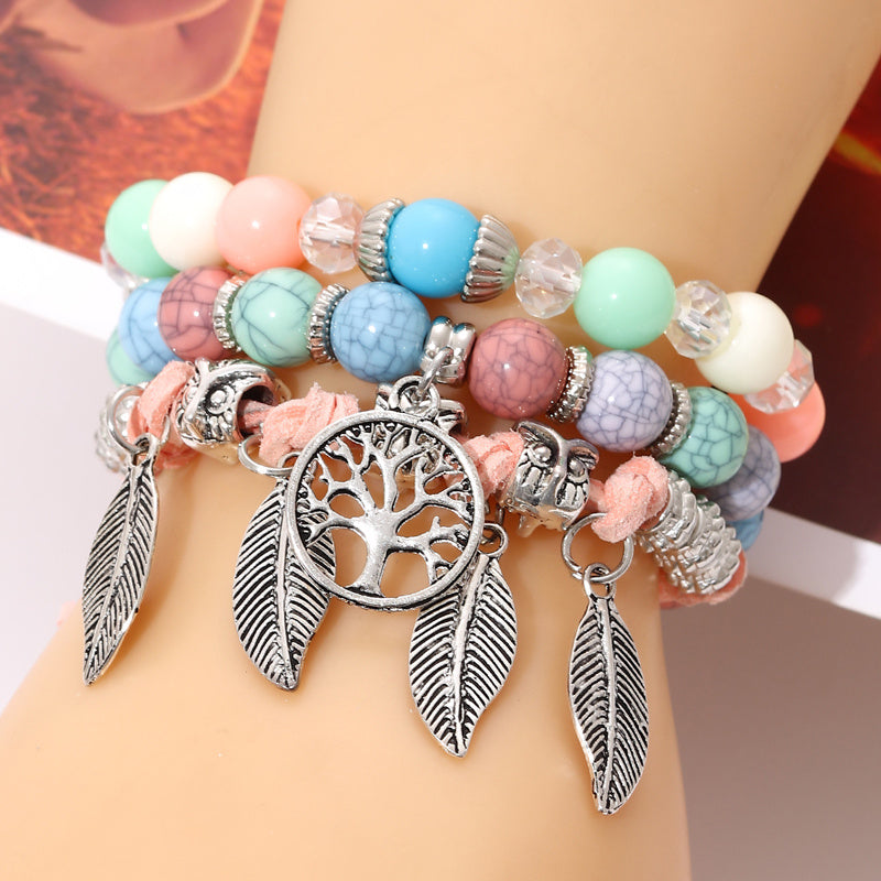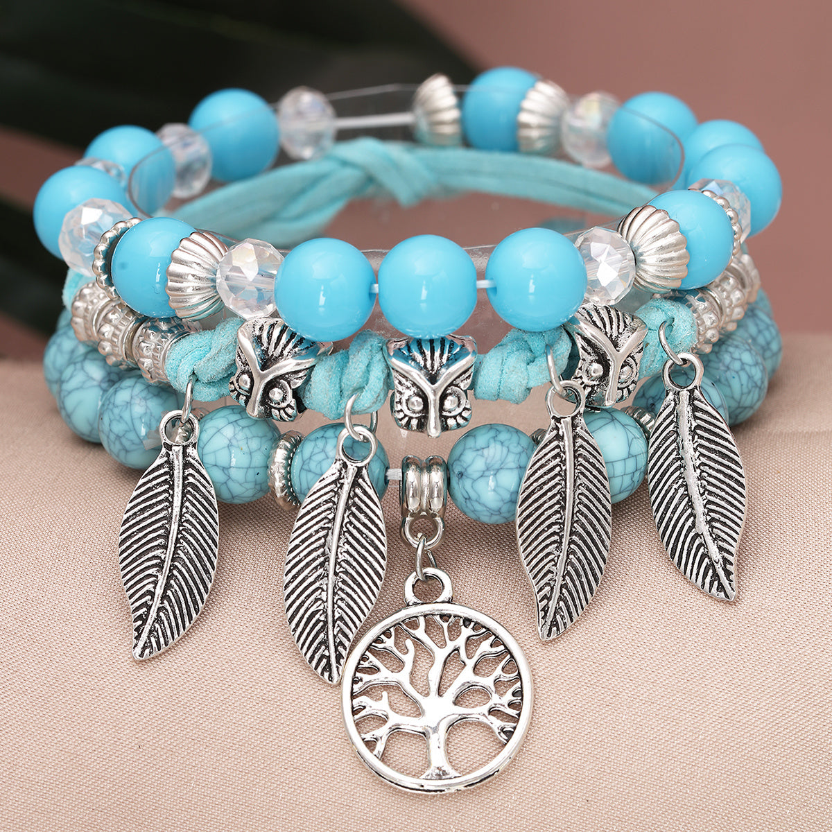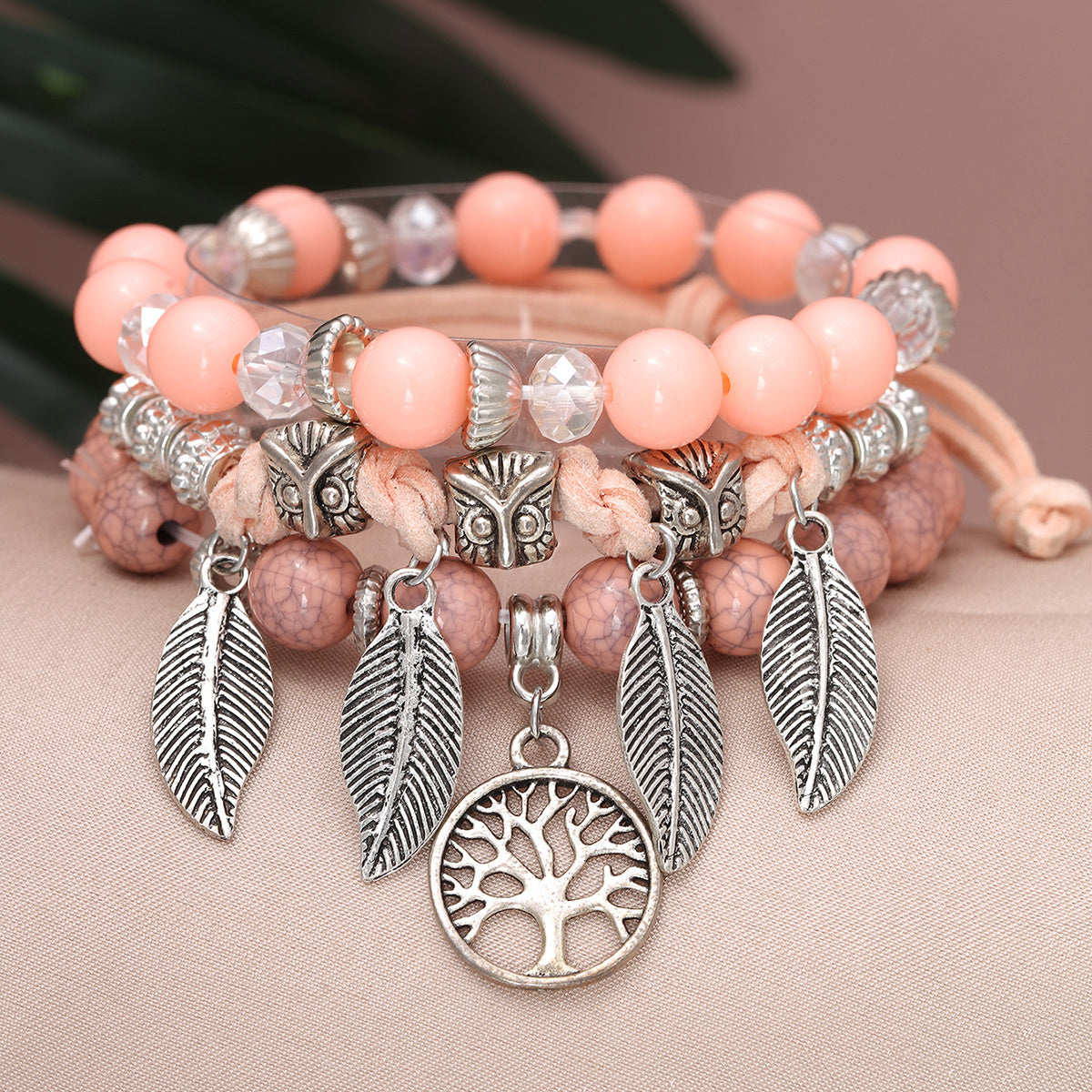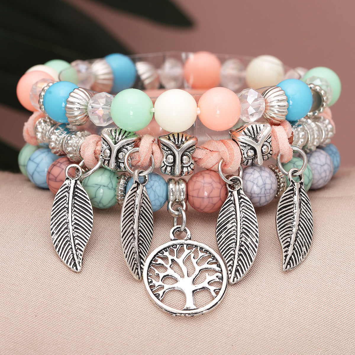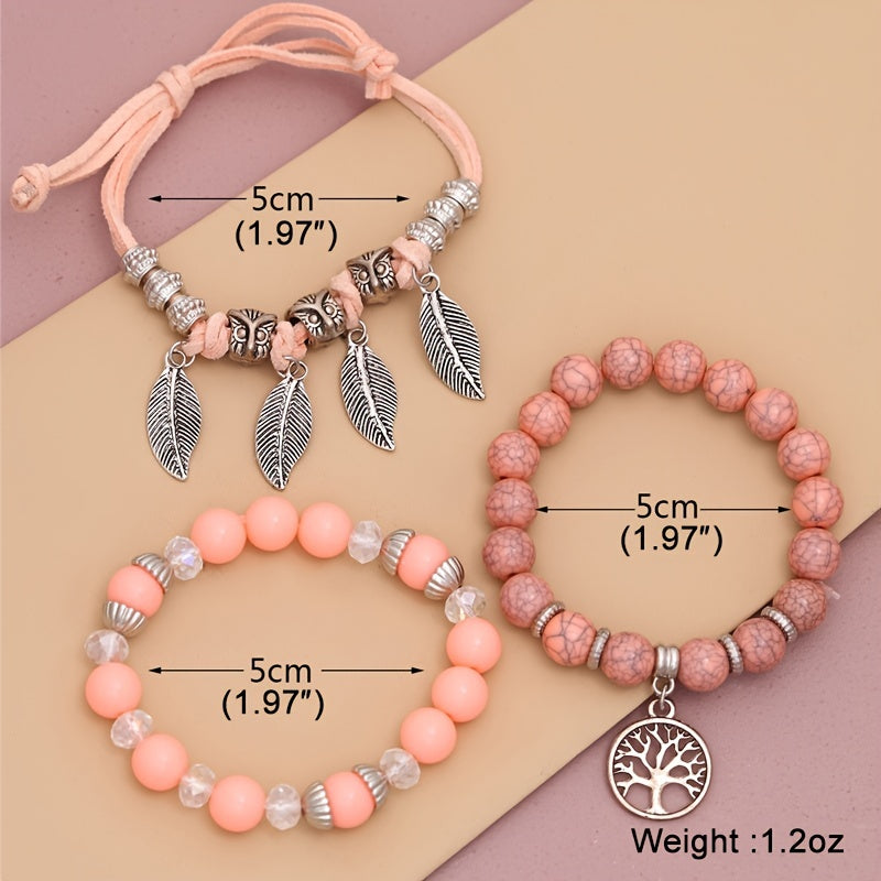 This set includes 3 bracelets with colorful beads and leaf pendant design. Perfect for adding a pop of color to your outfit.