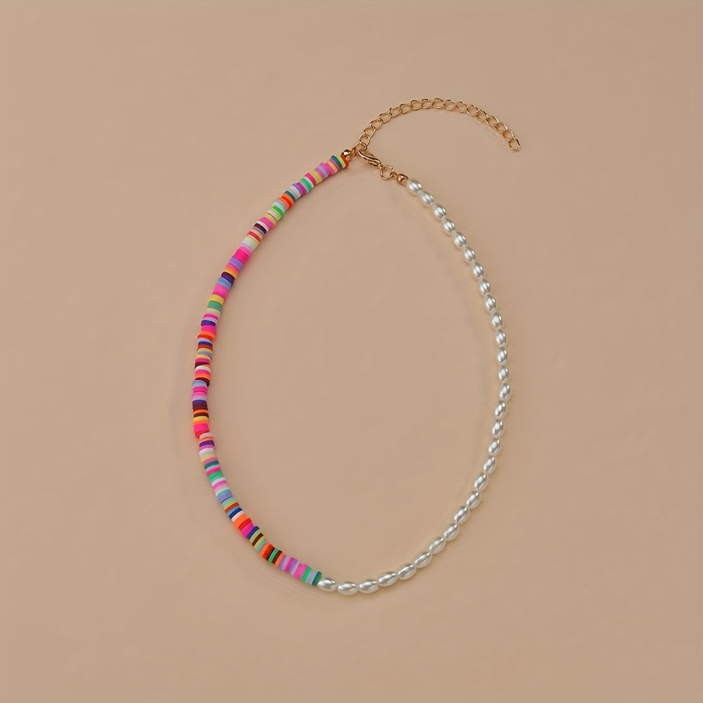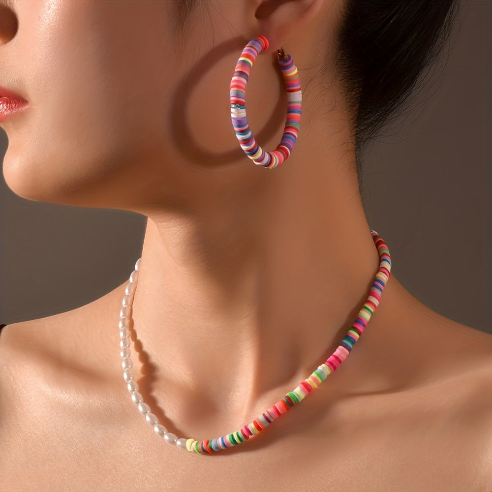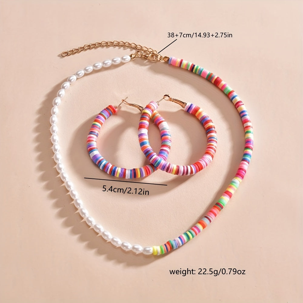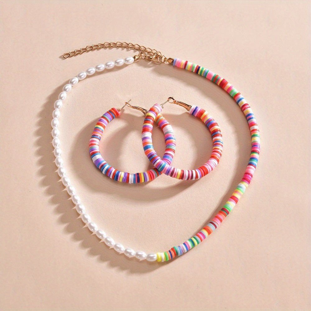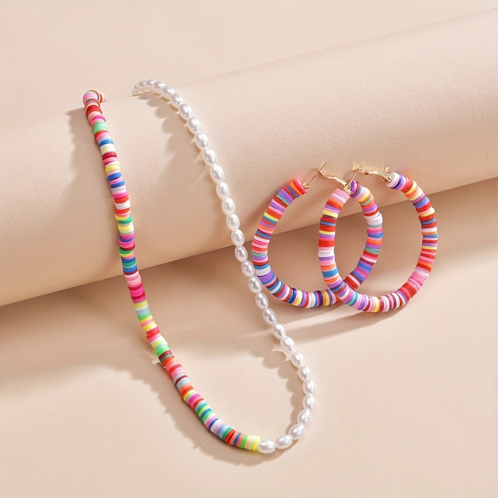 Complete your daily outfits with this 3-piece set of earrings and a necklace featuring colorful beads and milky stones. Perfect accessory for summer vacations.