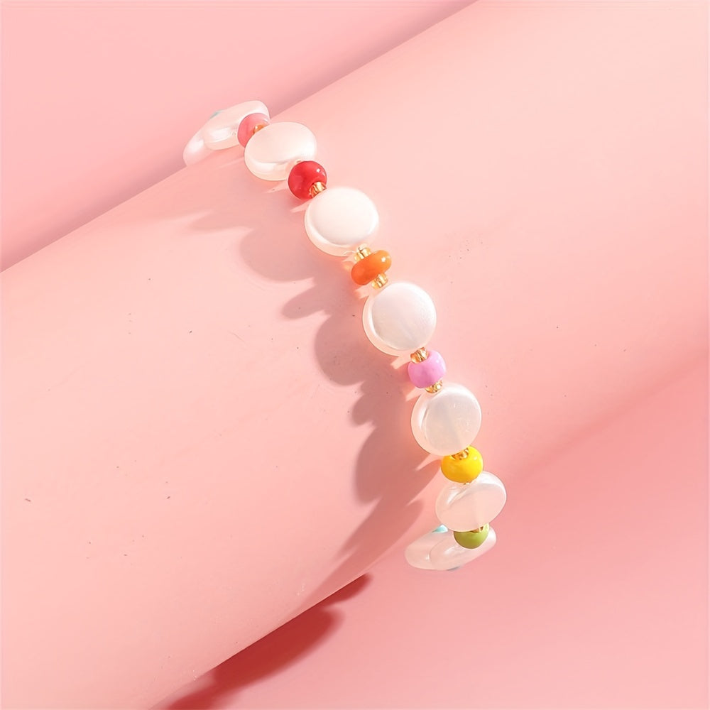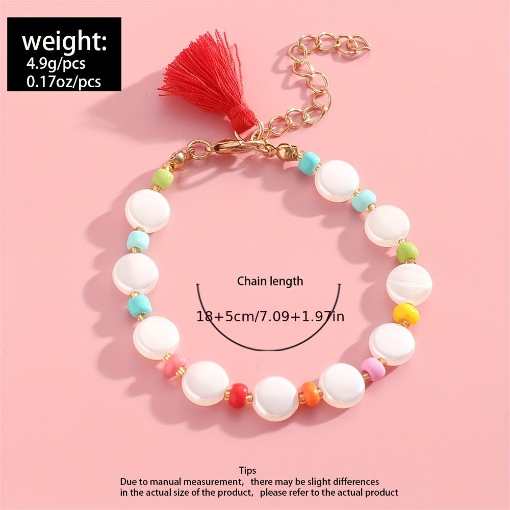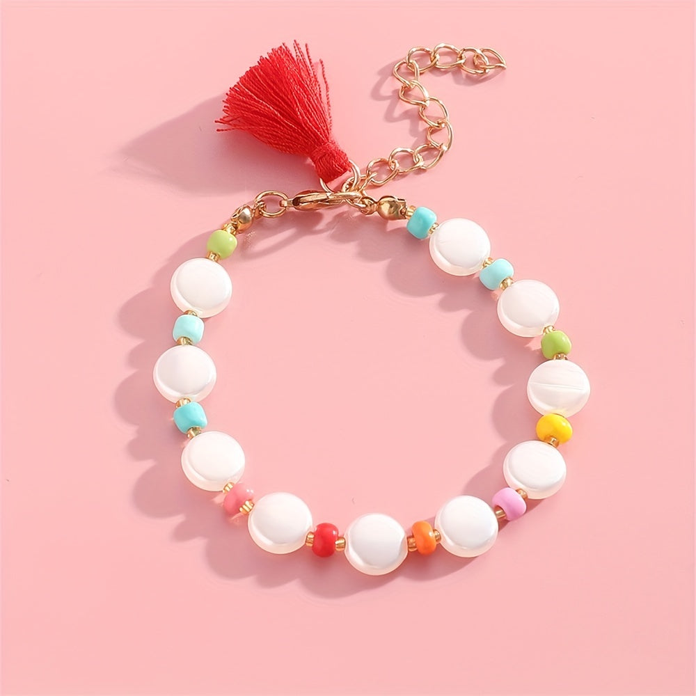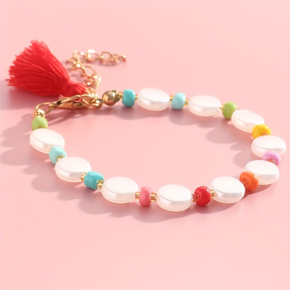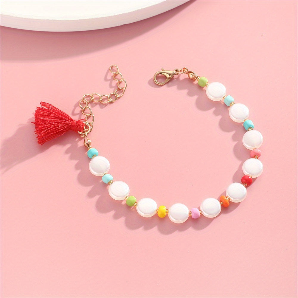 Add a pop of color to your outfit with this vibrant beaded bracelet featuring red tassel and pearl accents. Perfect for casual style and great for women and girls.