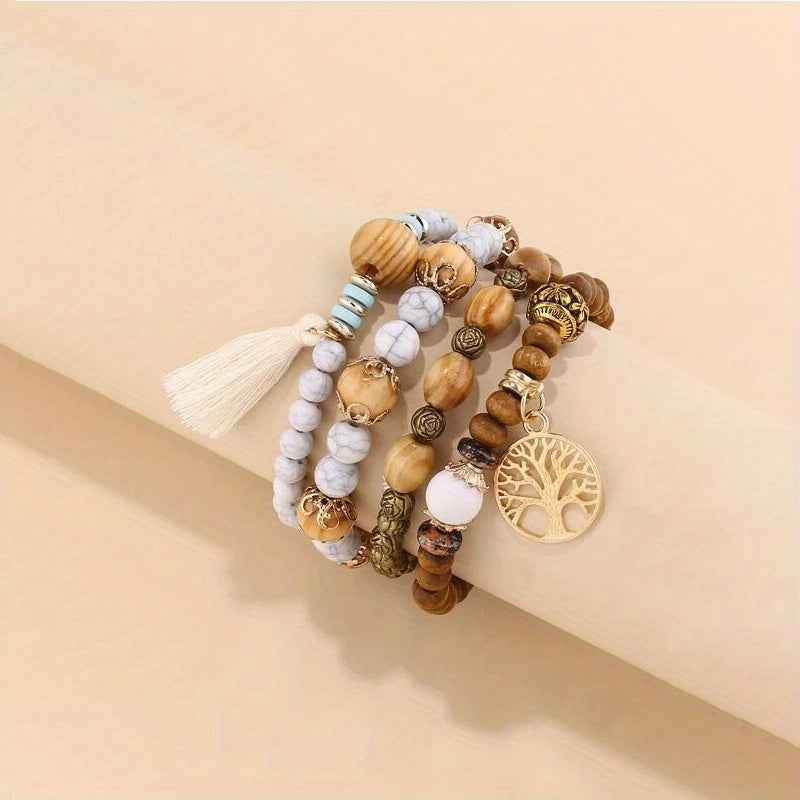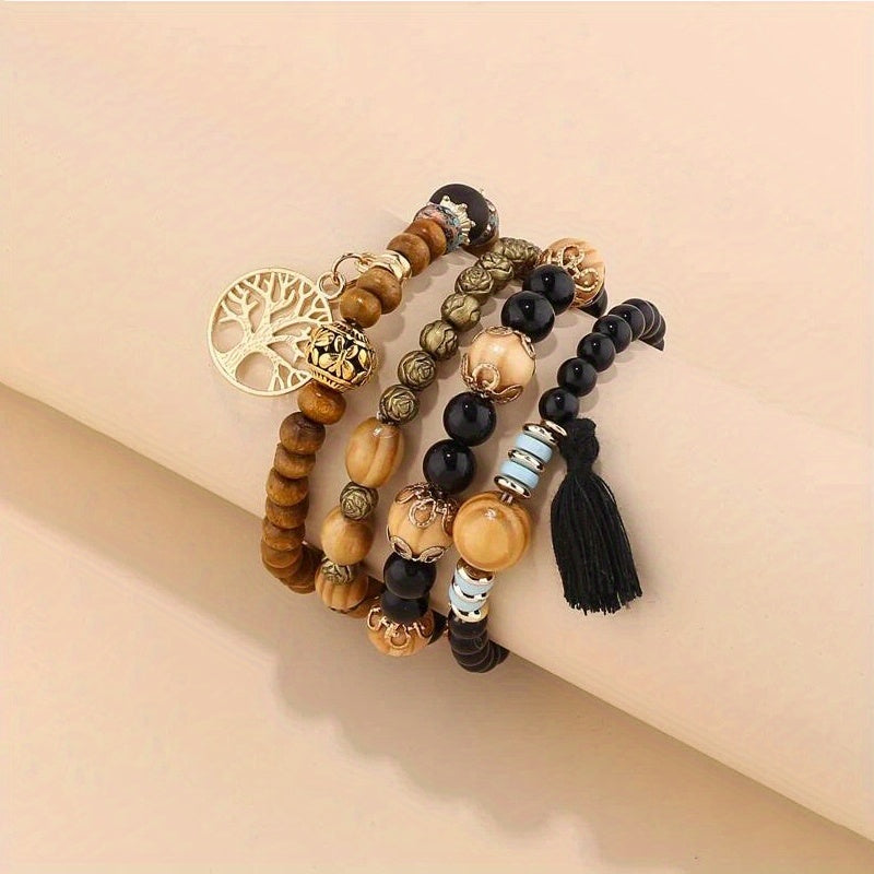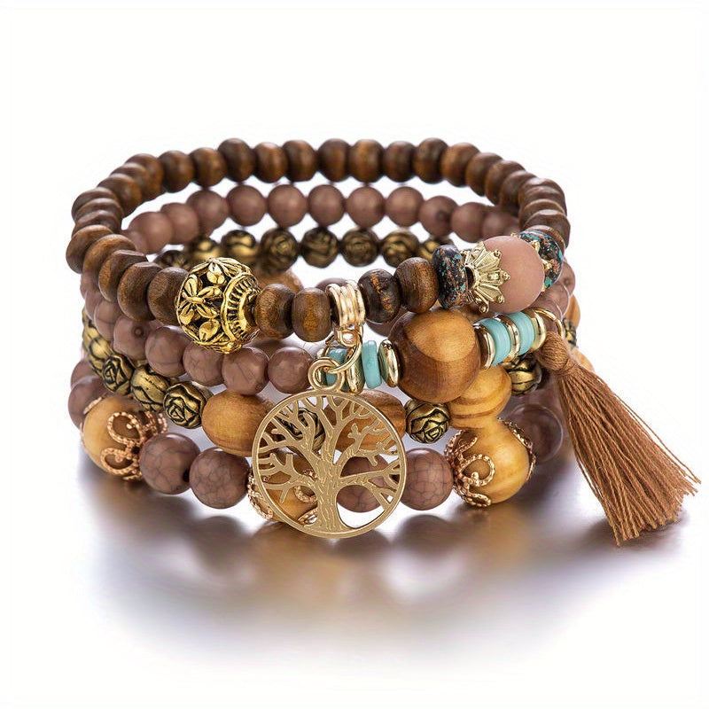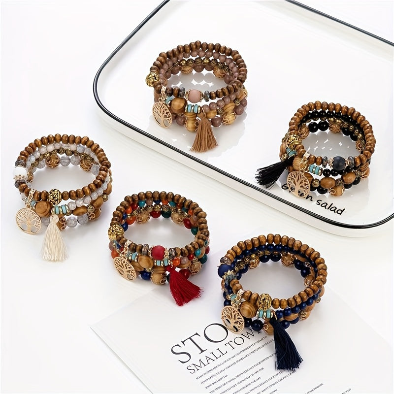 Add a pop of color to your wrist with this stackable bracelet featuring vibrant wooden beads. Perfect for a bohemian look!