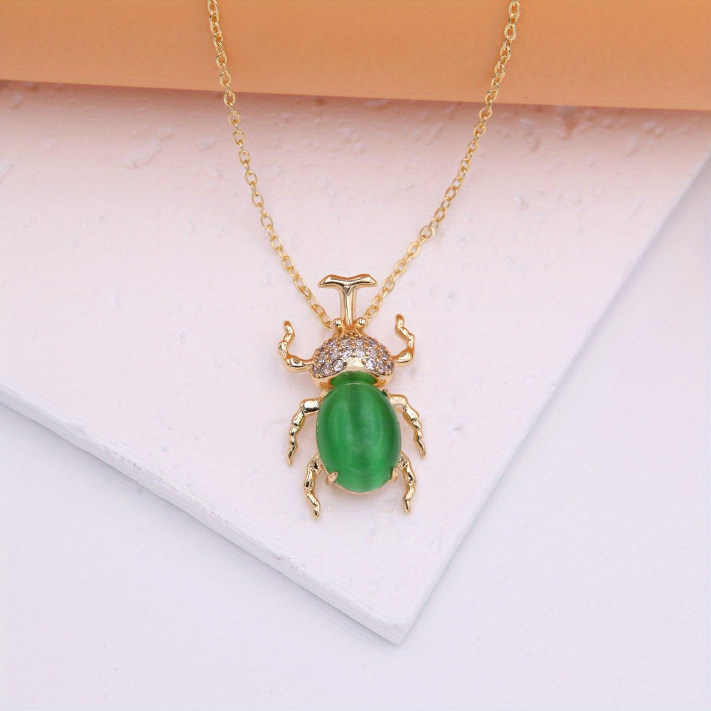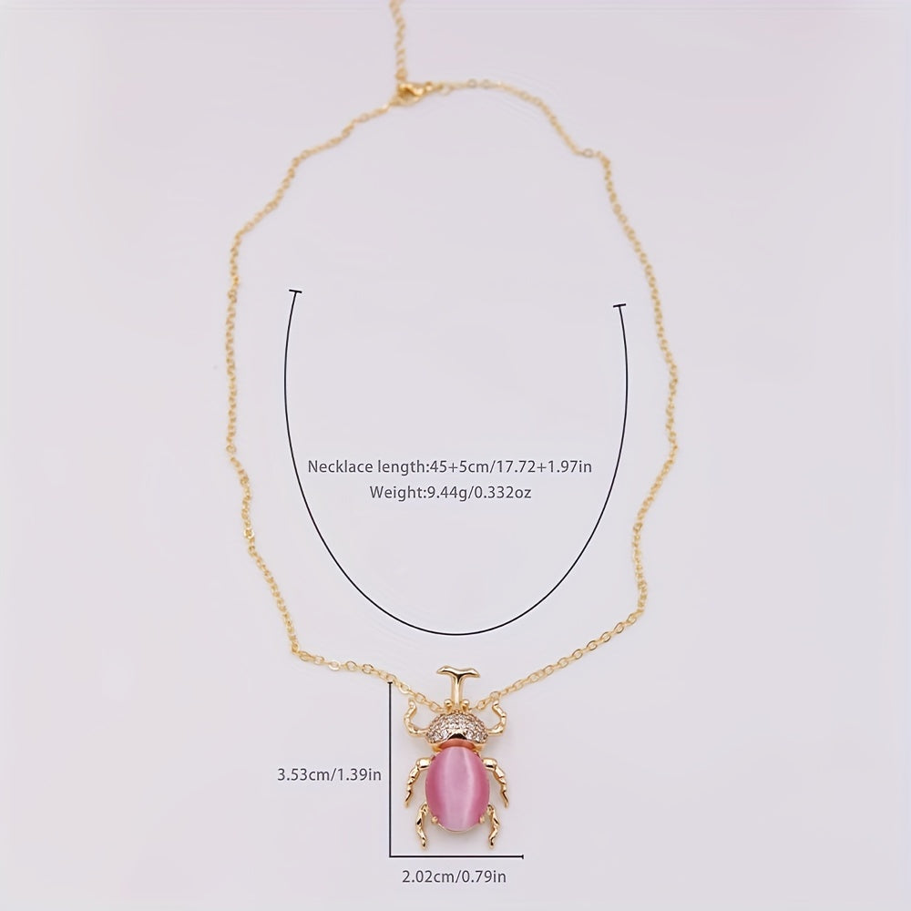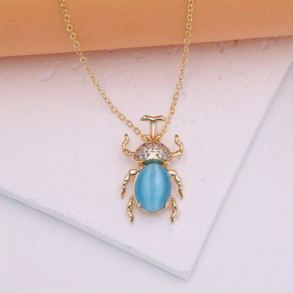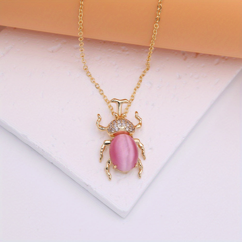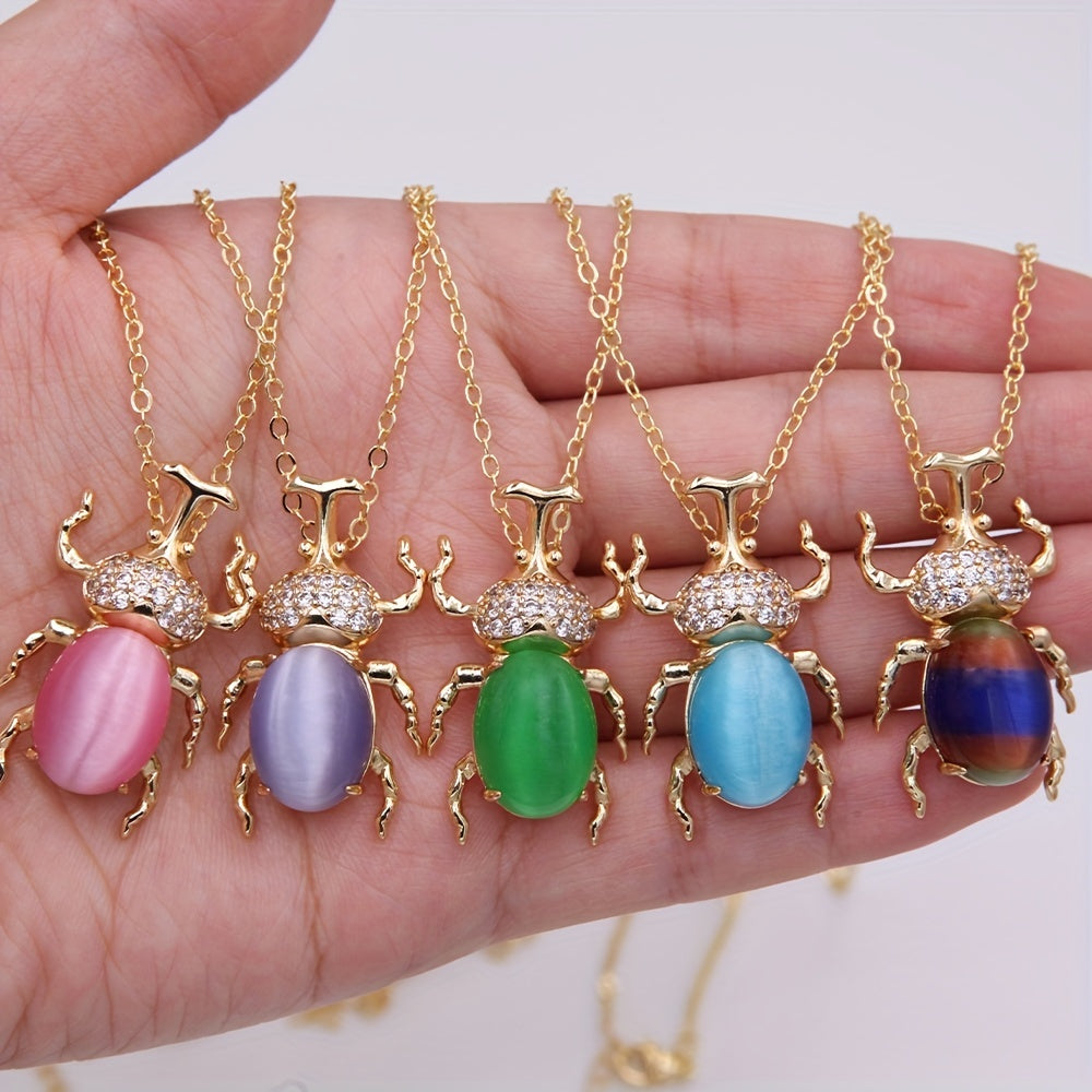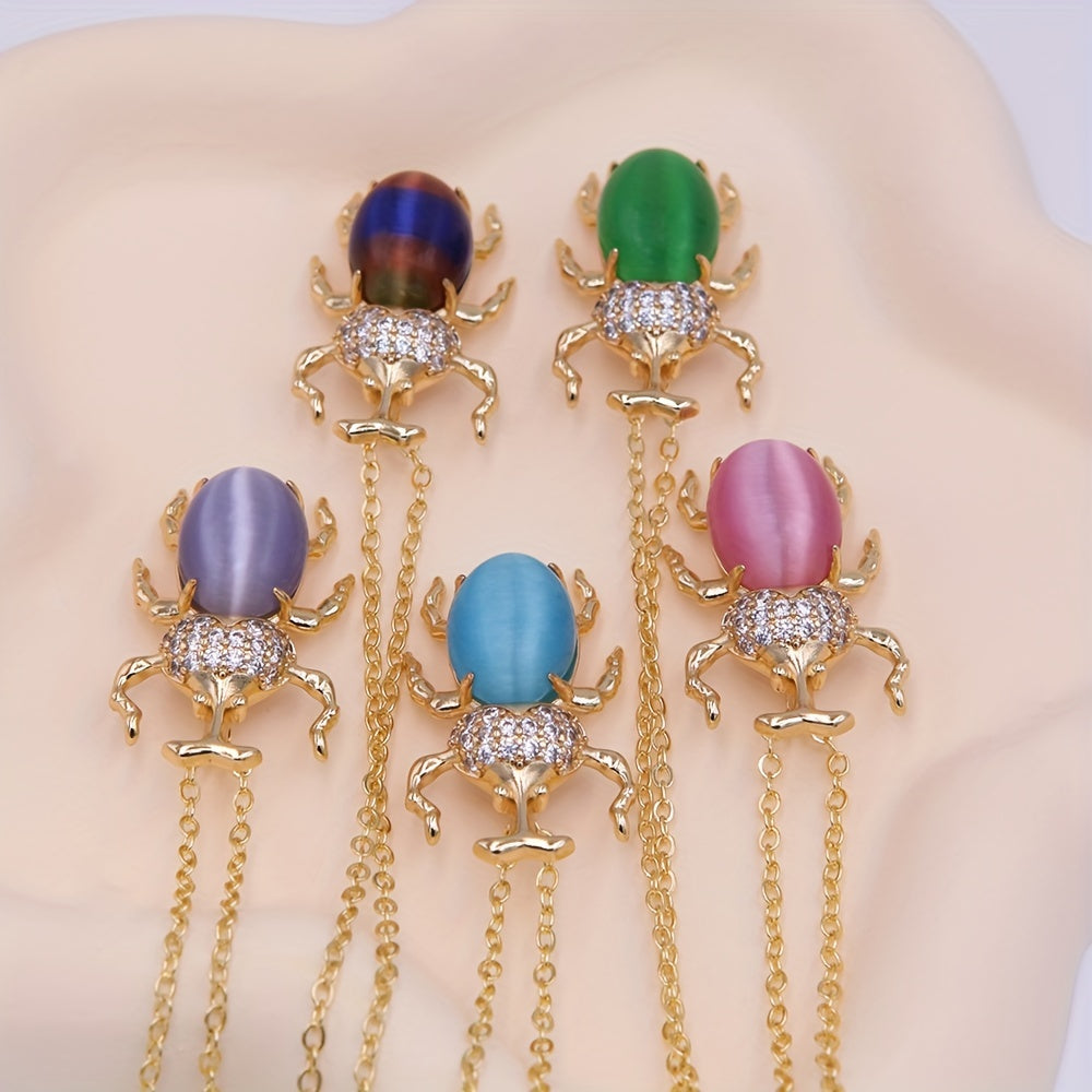 Add a touch of whimsy to your outfit with this exquisite beetle pendant necklace featuring a colorful cat's eye stone. The necklace is plated with 18K gold for an elegant and luxurious look.