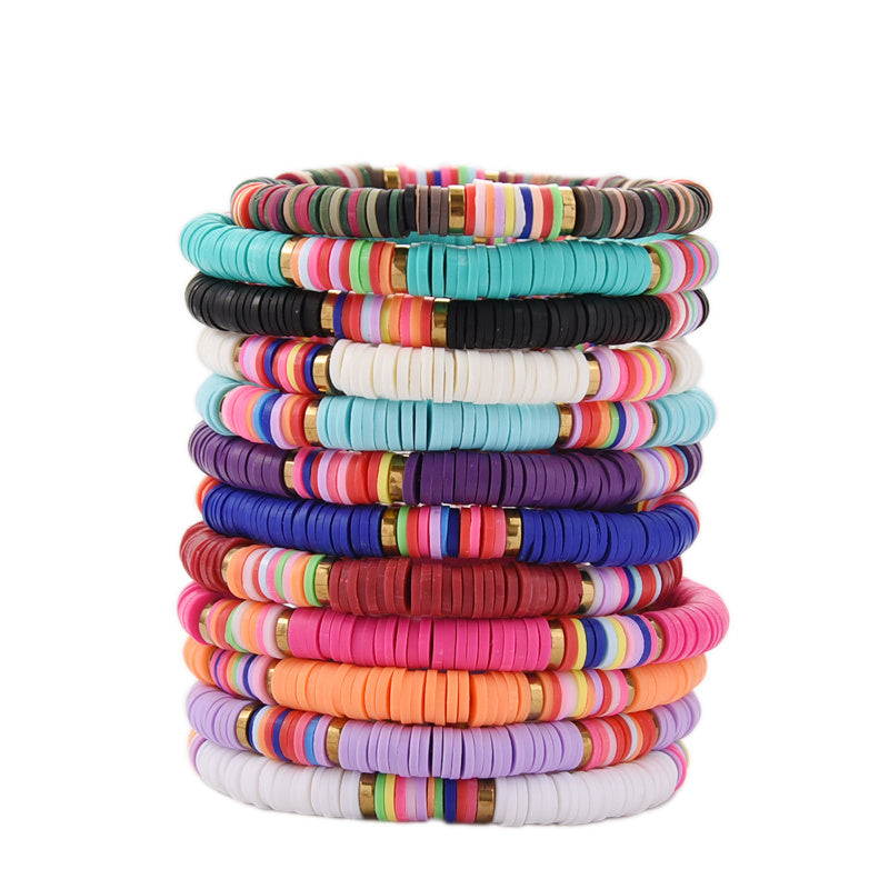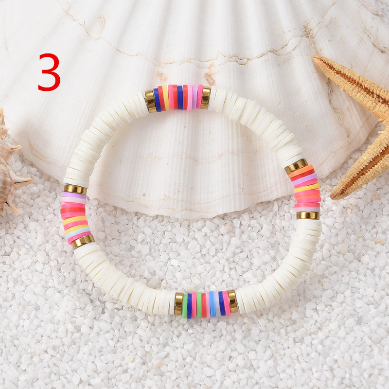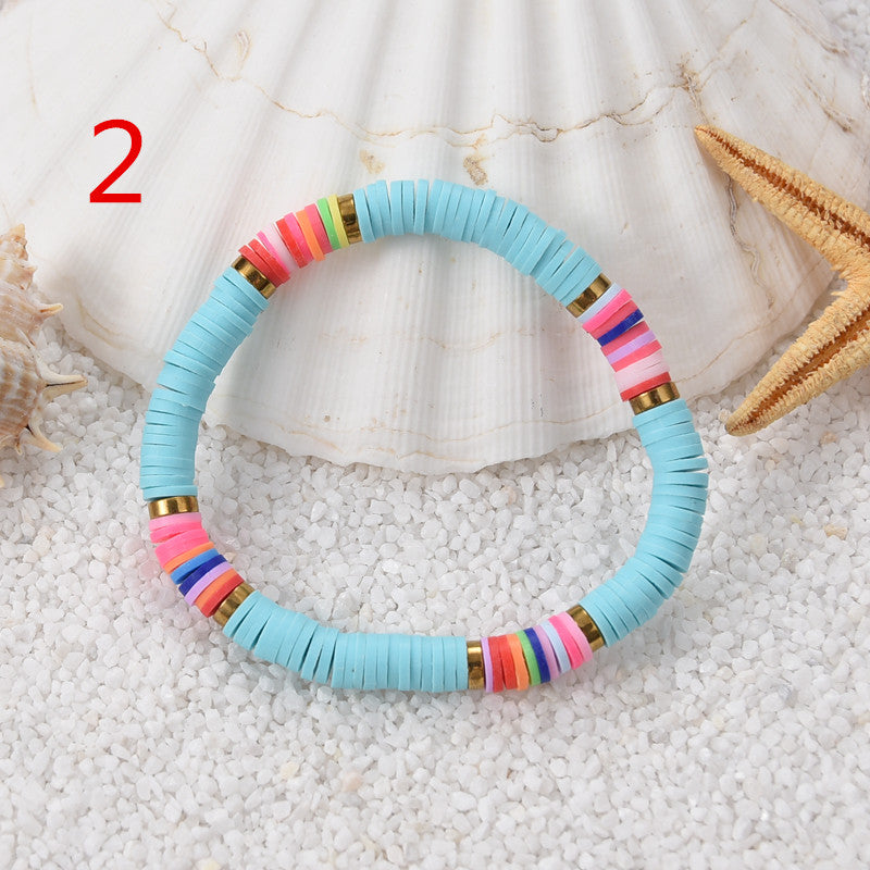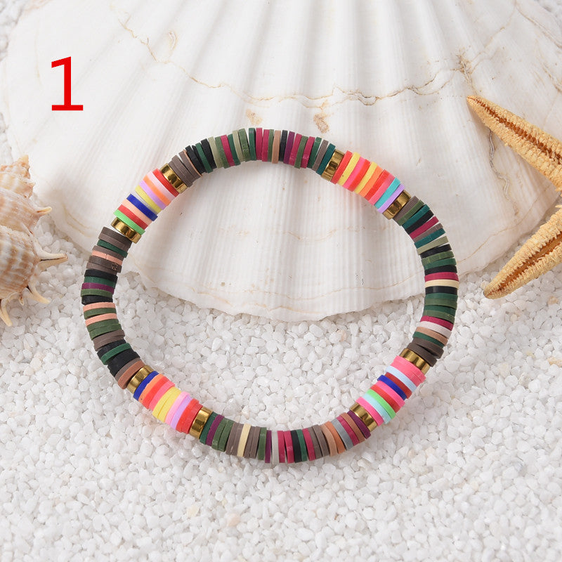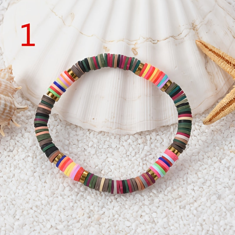 This vibrant elastic bracelet features bohemian style with colorful polymer clay beads, perfect for adding a pop of color to your holiday look.