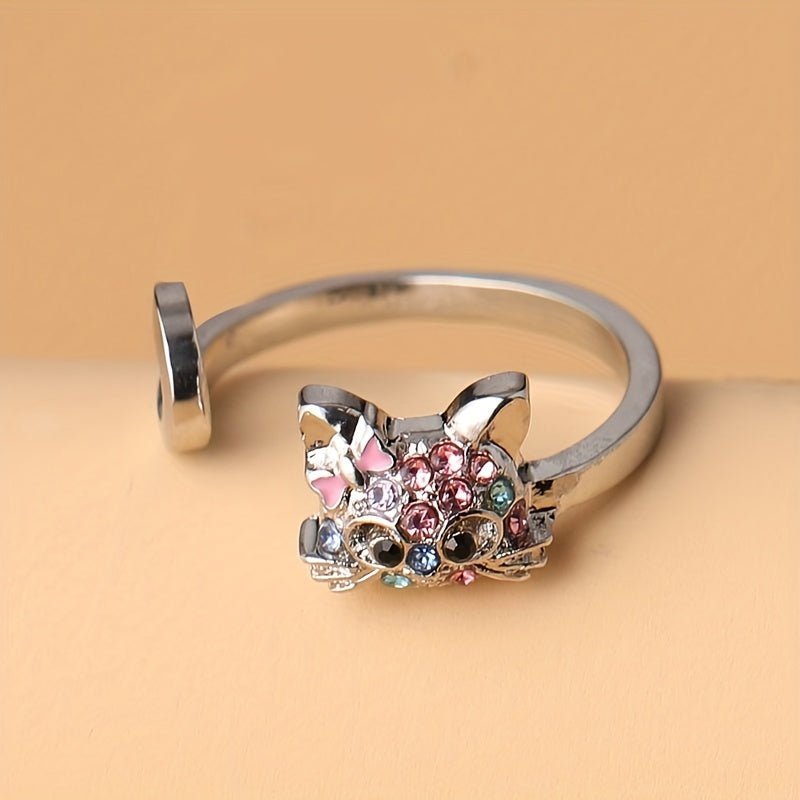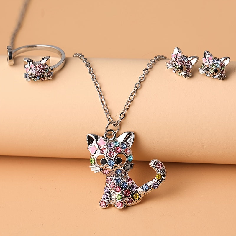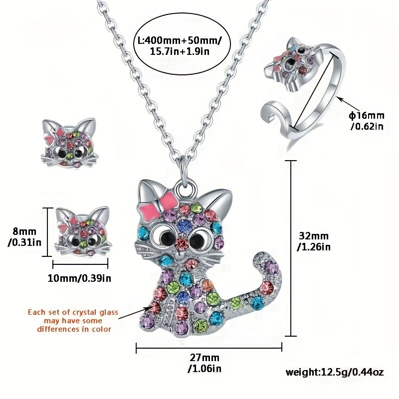 Colorful Rhinestone Cat Jewelry Set - Pendant Necklace & Earrings & Ring