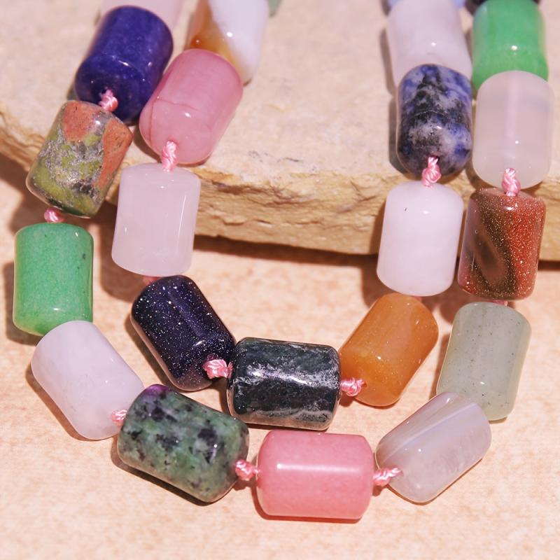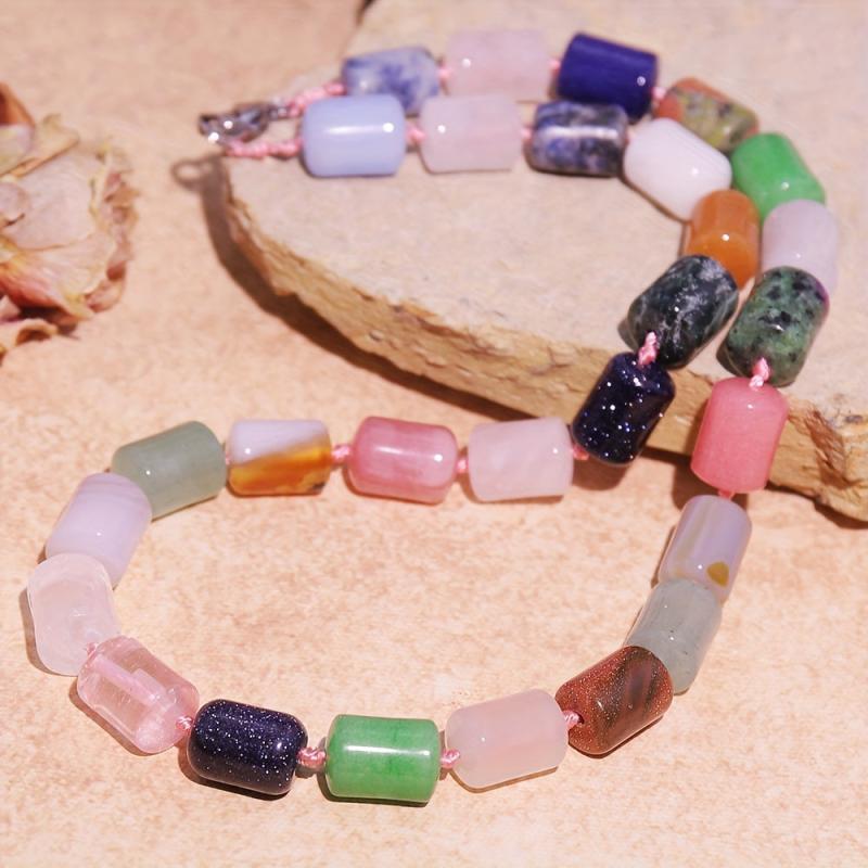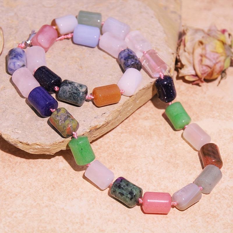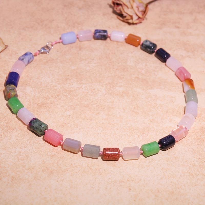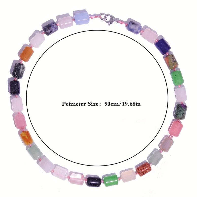Add a pop of color to your outfit with this natural stone necklace featuring colorful quartz and agate stones. Each stone cylinder is hand-woven for a unique and artisanal look.