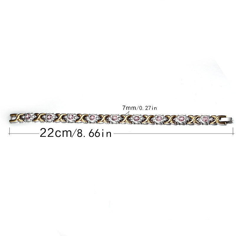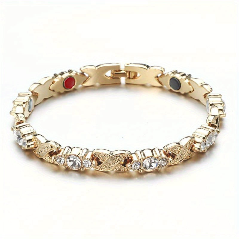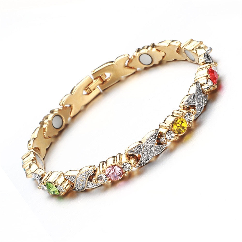 This stylish bangle bracelet features colorful synthetic gems inlaid on a sturdy stainless steel band. The bracelet is adjustable to fit different wrist sizes.