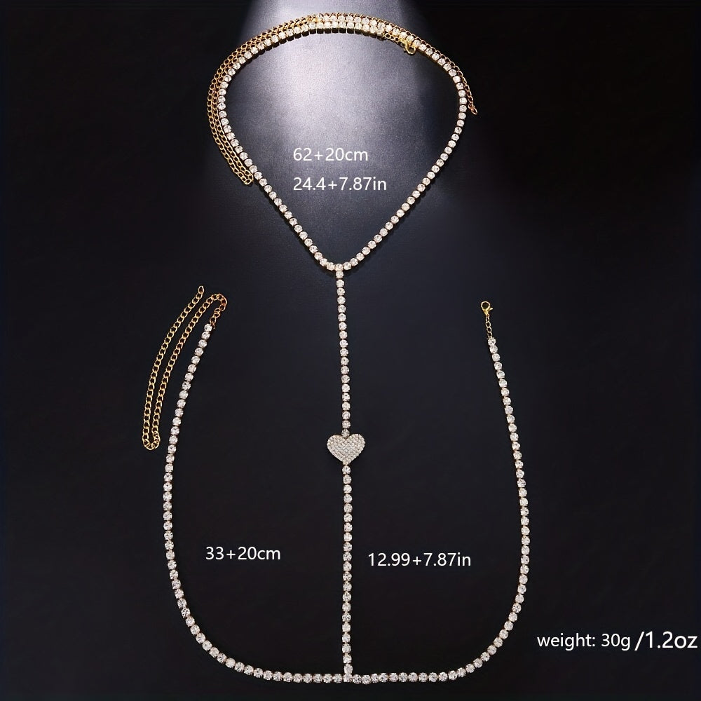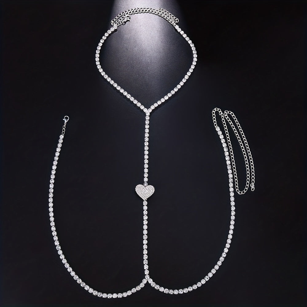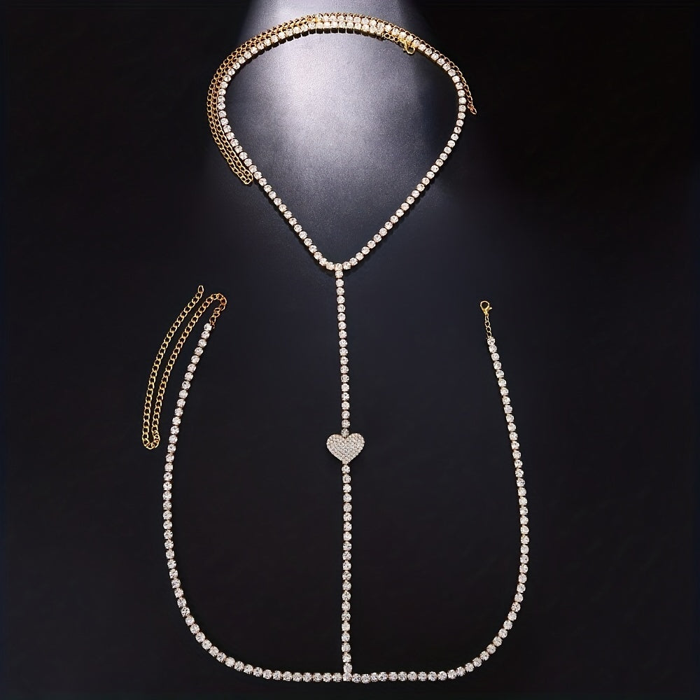Elevate your look with this stunning chest chain featuring heart-shaped rhinestones. Perfect for a glamorous night at the nightclub or to enhance your bikini style.