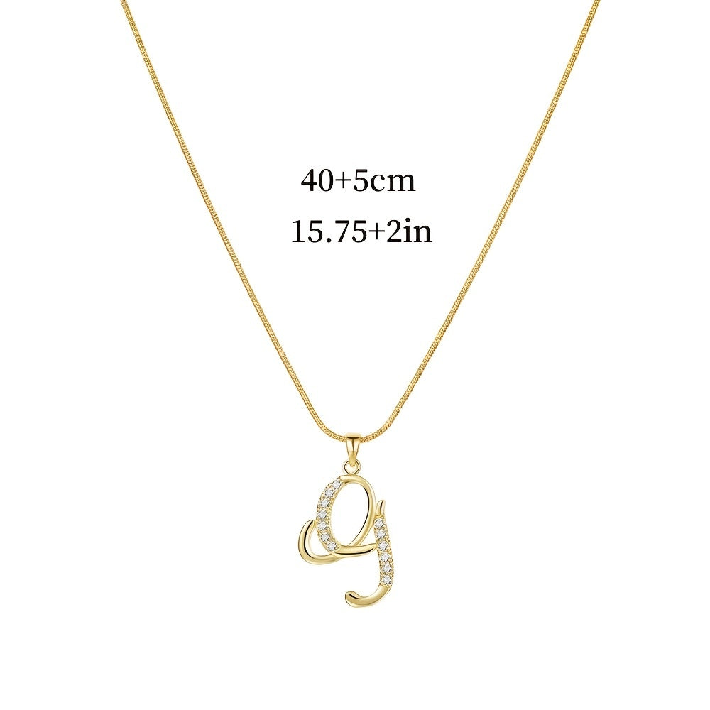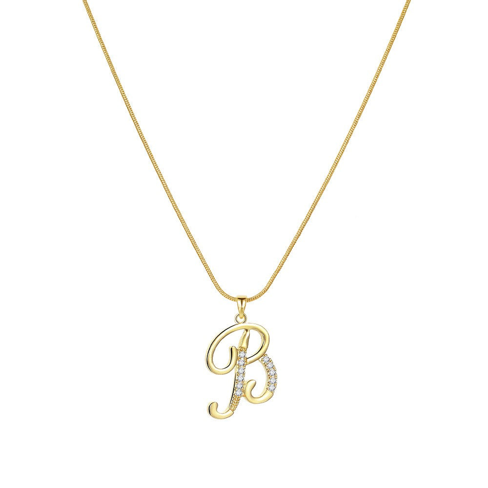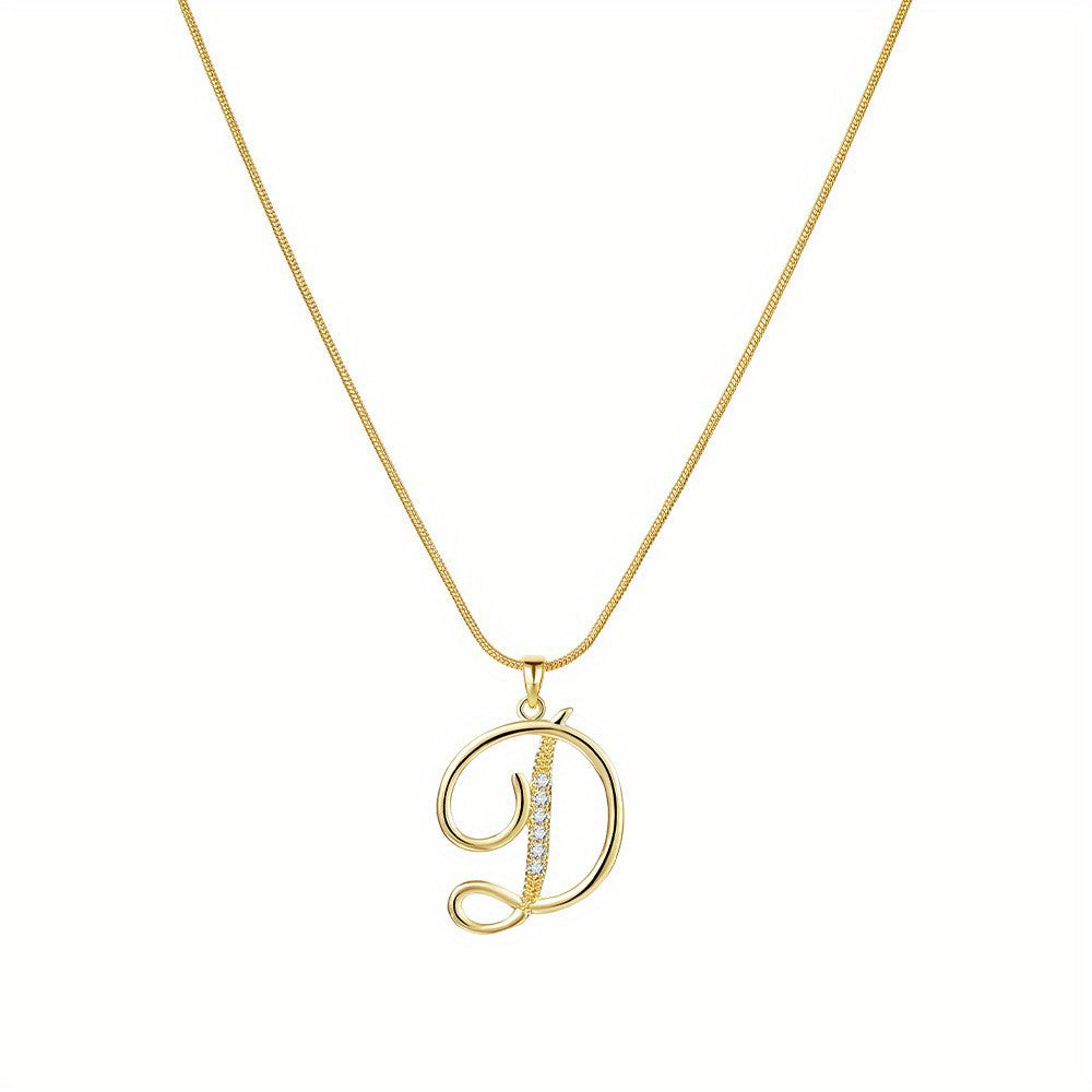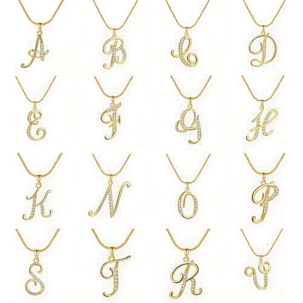 Elegant round snake chain necklace with copper inlaid zircon pendant in golden color featuring creative letters design.